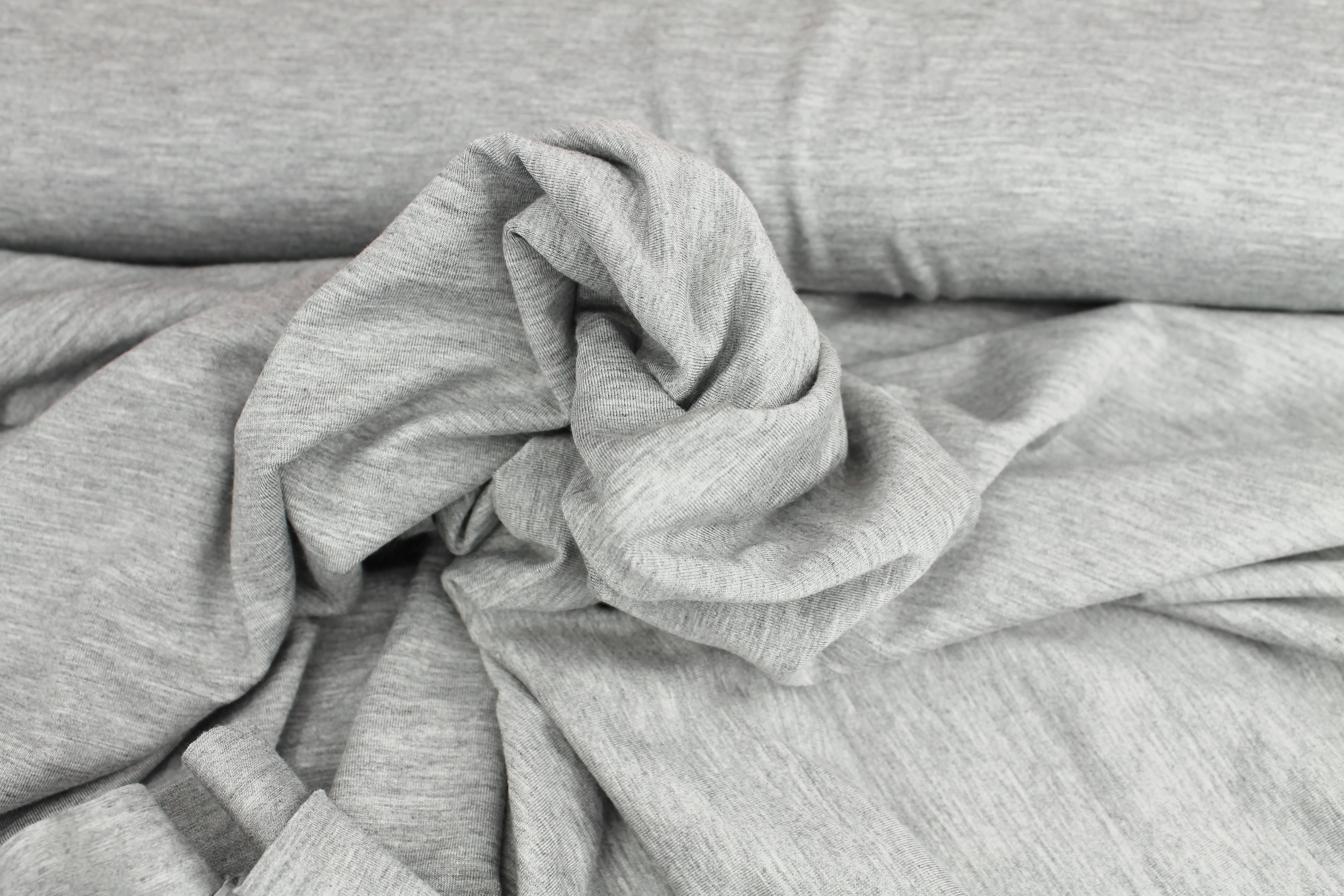 Hochwertiger Bambusjersey in grau meliert. Der Jersey fällt wie ein Viskosejersey (Viskose aus Baumwolle) ist zusätzlich aber glatter und weicher. Ein toller Jersey nicht nur für Kleider, sondern auch für Unterwäsche.