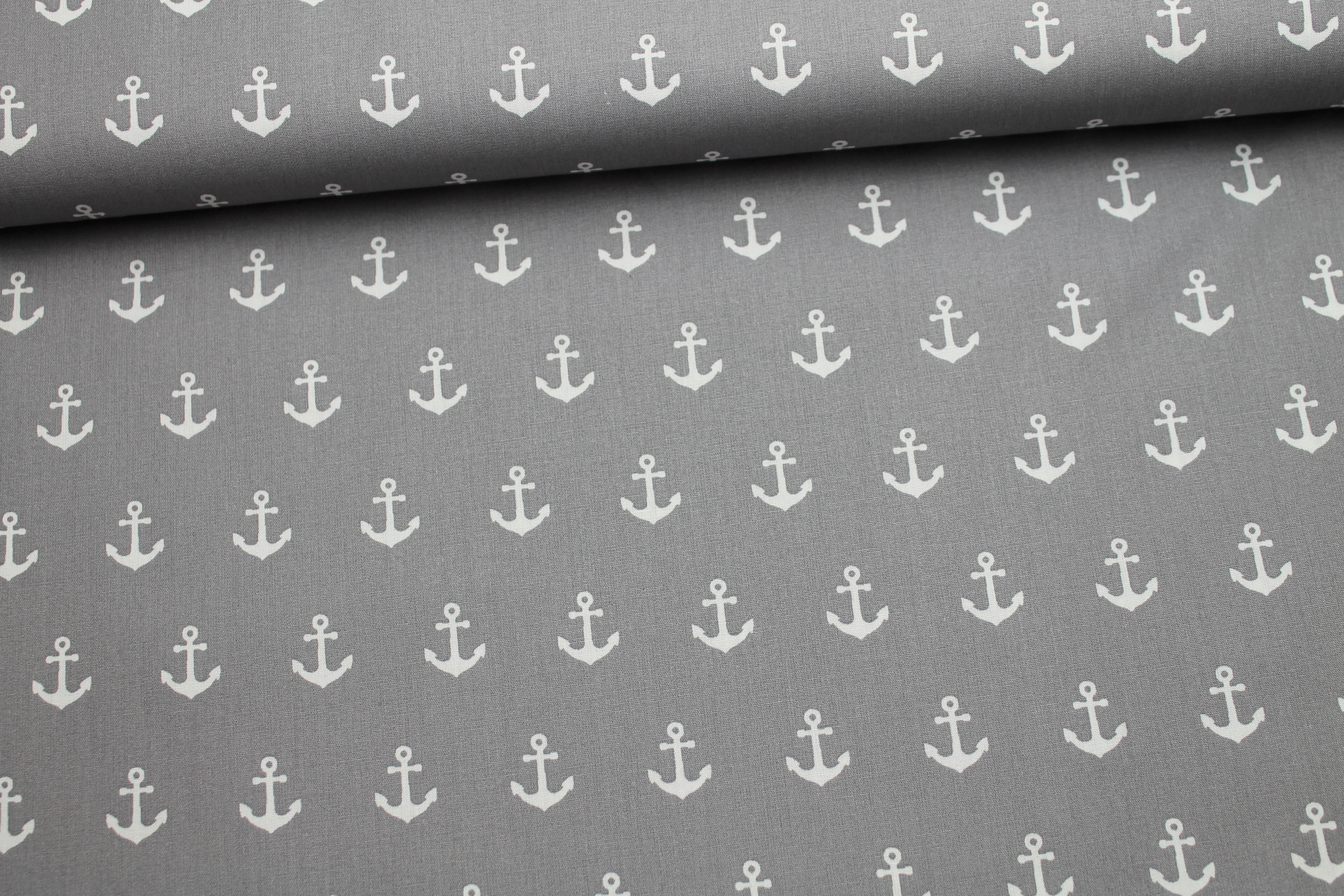 Schöner Baumwollstoff in grau mit weißen Ankern.