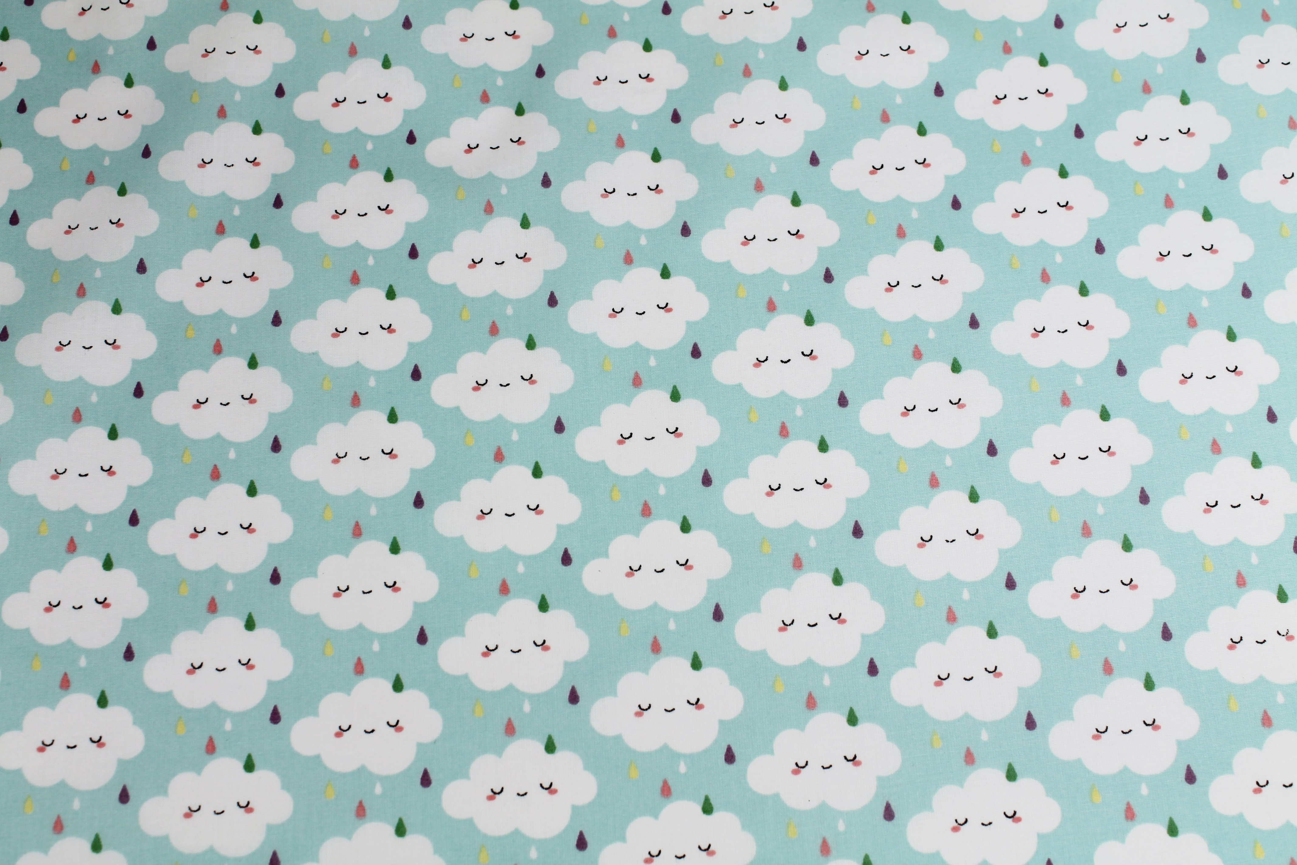 Beschichtete Baumwolle in mint mit kleinen niedlichen Wölkchen. Beschichtete Baumwolle ist abwaschbar und wasserabweisend.