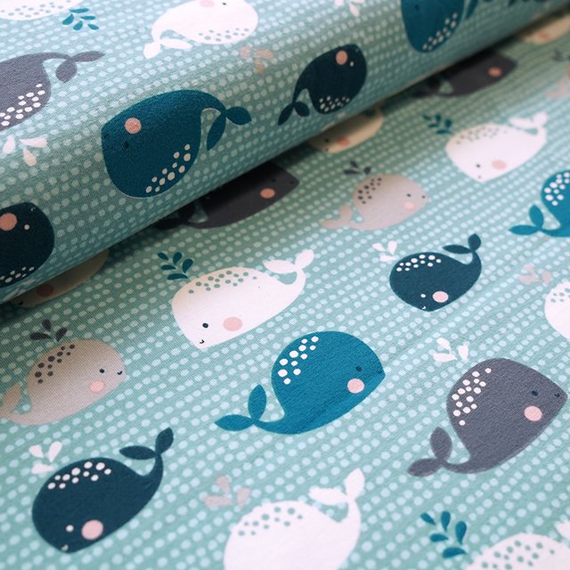 Schöner, weicher Bio-Jersey von Stoffonkel. Der Jersey hat als Muster niedliche Wale und wurde aus Bio-Baumwolle hergestellt.