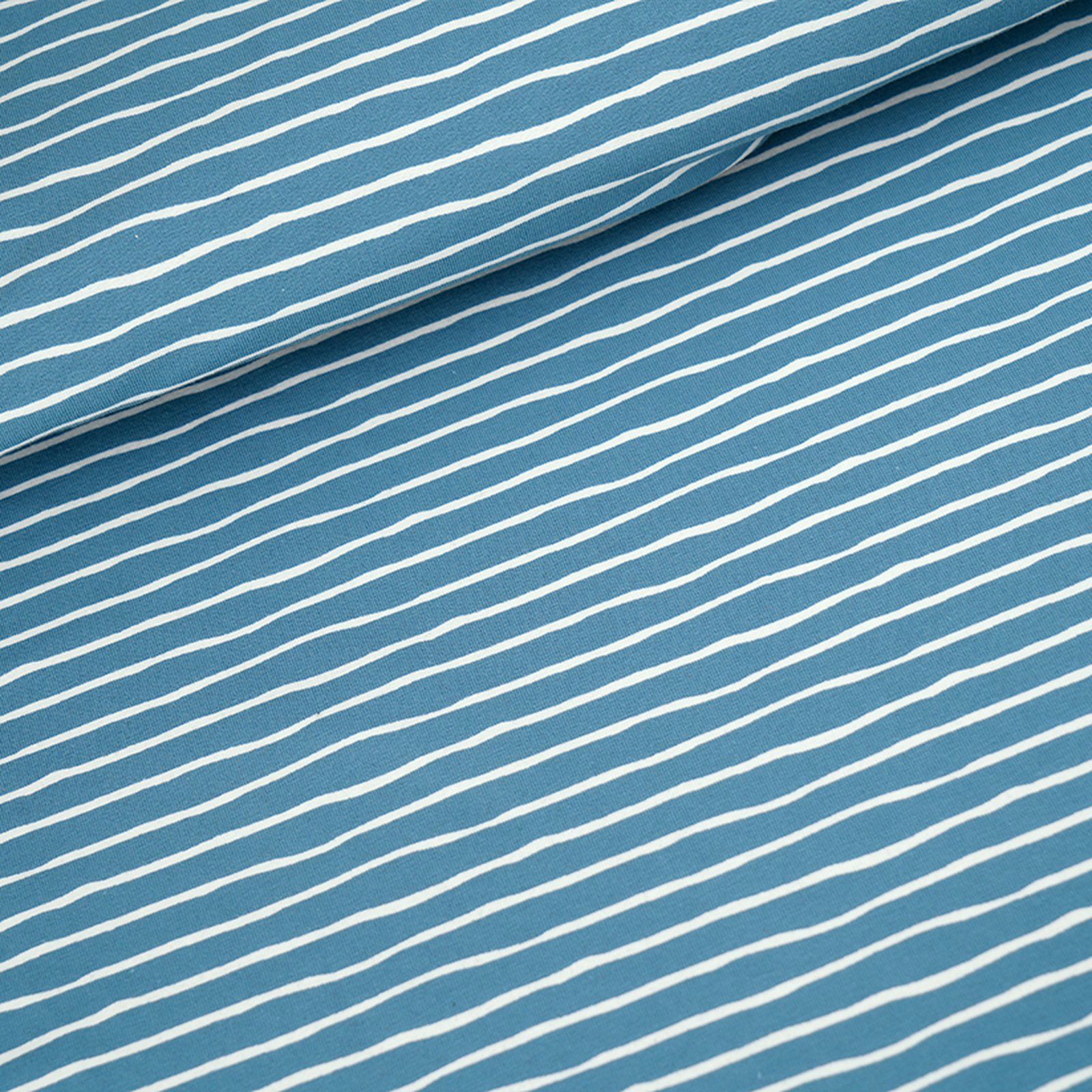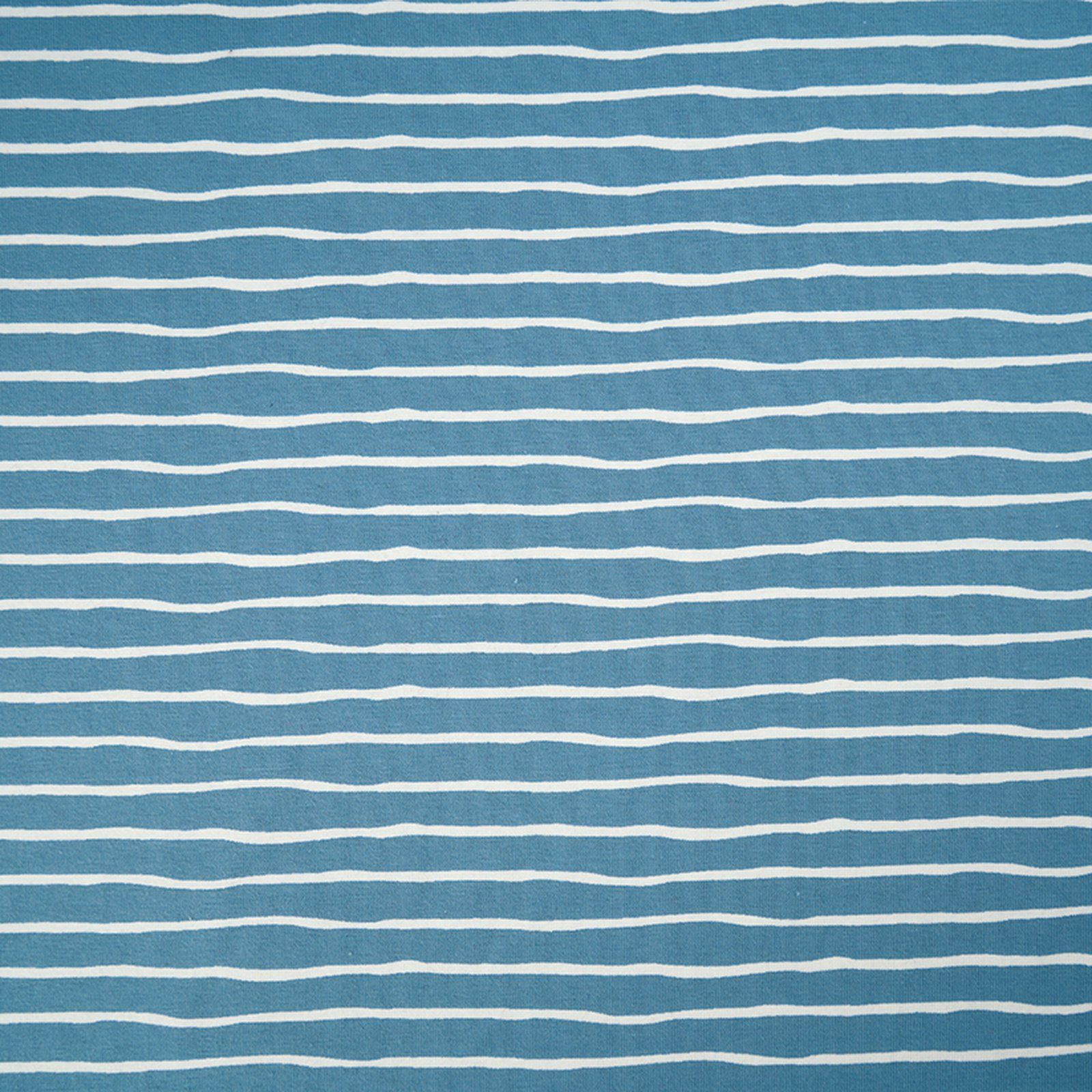 Schöner, weicher Bio-Jersey von Stoffonkel. Der Jersey ist in hellem jeansblau gehalten, hat als Muster wellenartige Streifen und wurde aus Bio-Baumwolle hergestellt. Durch die hochwertige Verarbeitung und den schadstoffarmen Druck eignet sich dieser Jersey insbesondere zur Herstellung von Babykleidung.