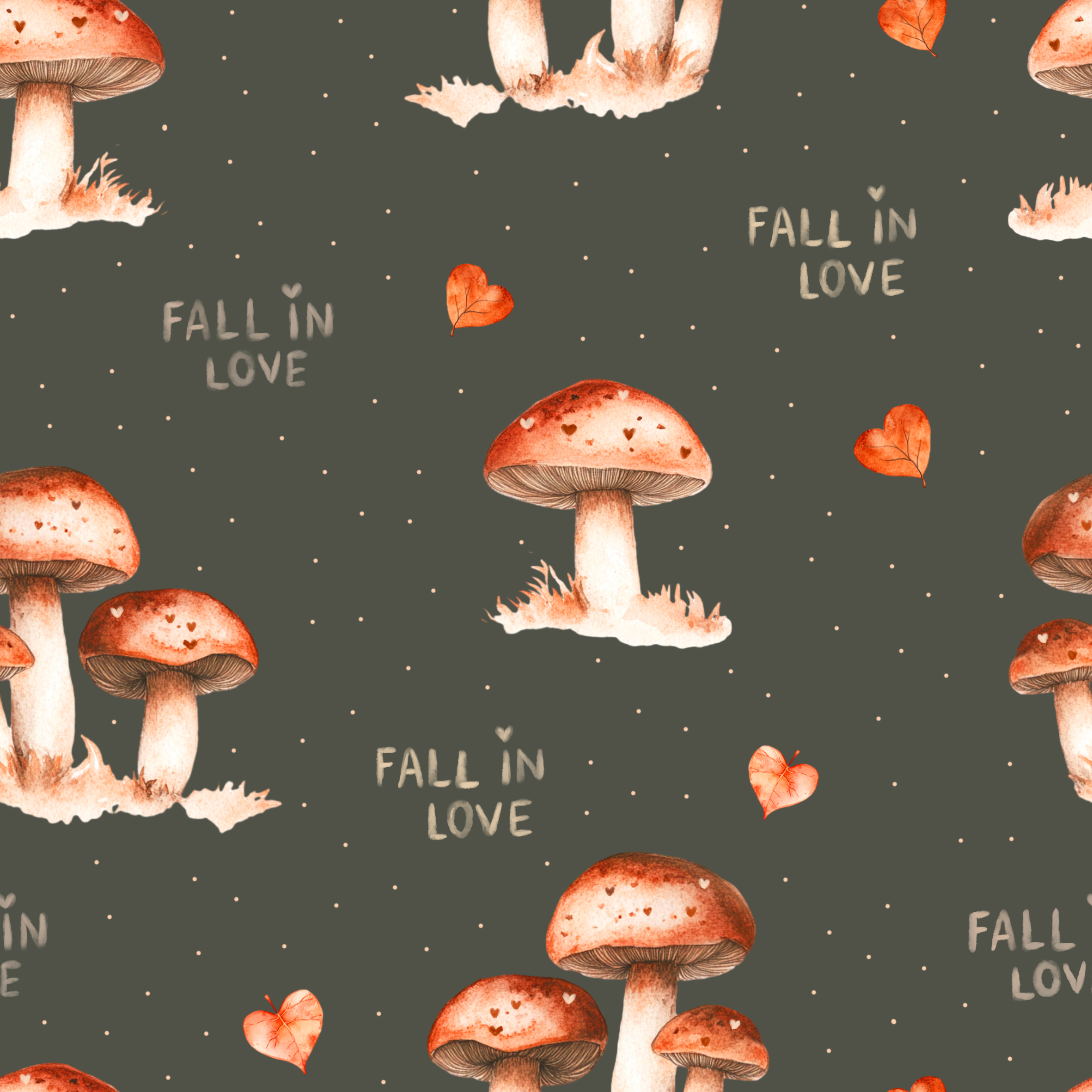 Das niedliche Fliegenpilzdesign "Fall in love" ist der perfekte Herbststoff. Auf dunklem grün kommt der Druck besonders gut zur Geltung.
