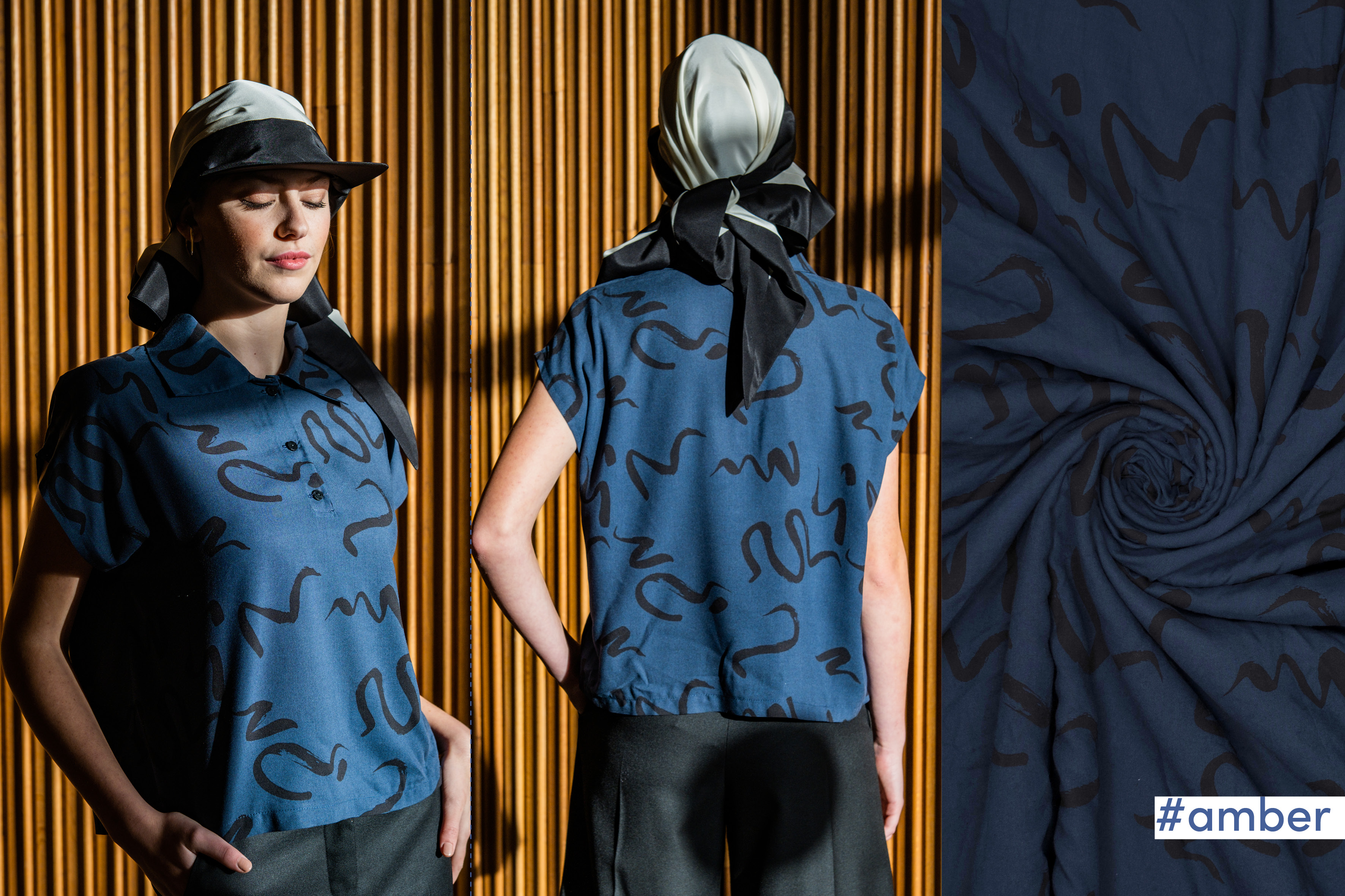 Leicht fließender Viskose Stoff in blau mit grafischem Muster in schwarz. Der Stoff wurde im Fibre Mood Magazin 22 für den Schnitt "Amber" vernäht. Die Viskose ist Ecovero von Lenzing, was einerseits Qualität und andererseits nachhaltige Herstellung garantiert.