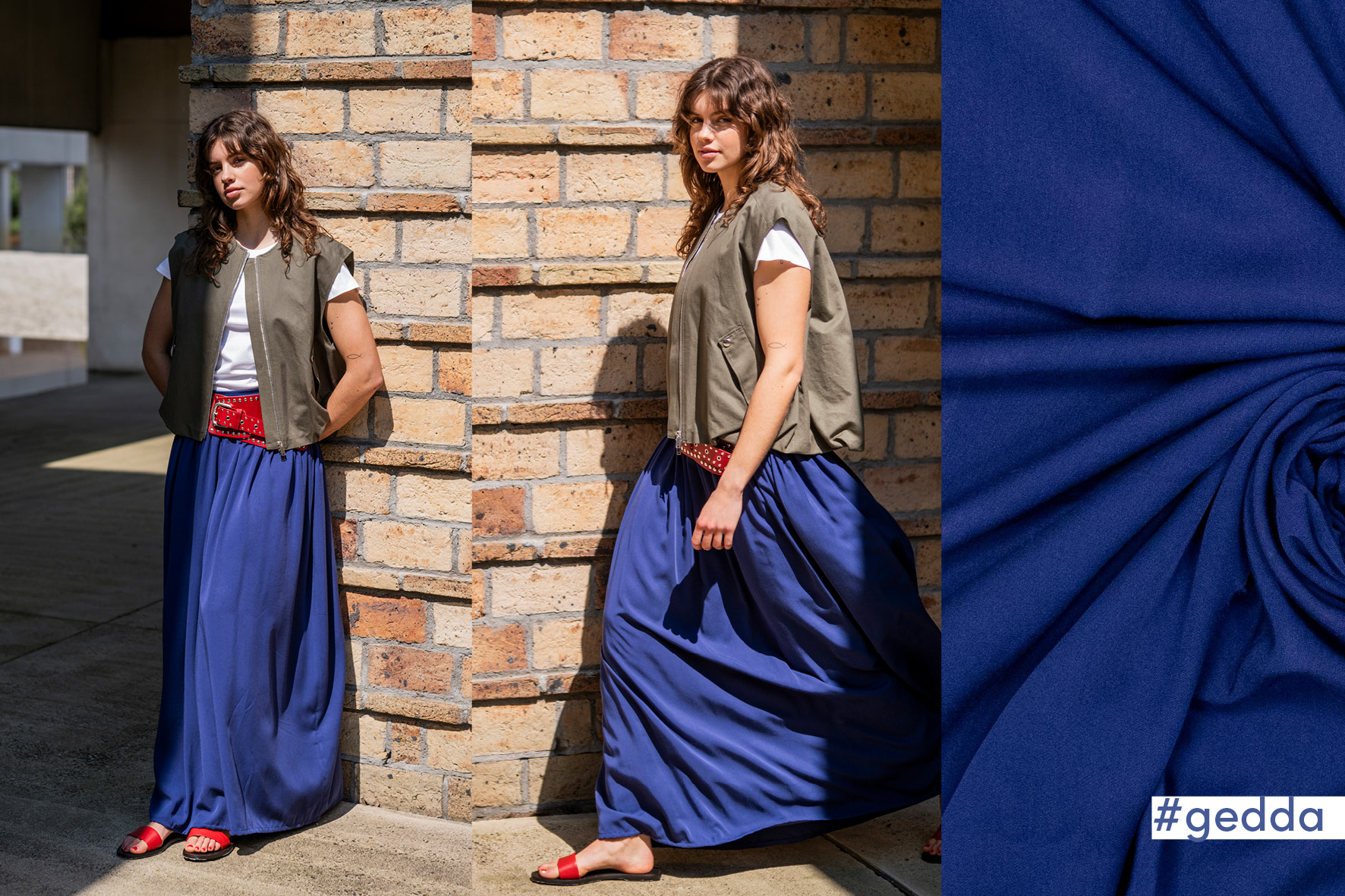 Hochwertiger Viskose Stoff in dunkelblau. Der schöne Viskose Webstoff wurde in der Fibre Mood 29 für die Schnittmuster Ines (in gelb) und Gedda vernäht. Generell eignet sich der Stoff für weite Hosen, Kleider, Tuniken und alle Schnittmuster, die auf nicht-dehnbare dünne Stoffe ausgelegt sind.