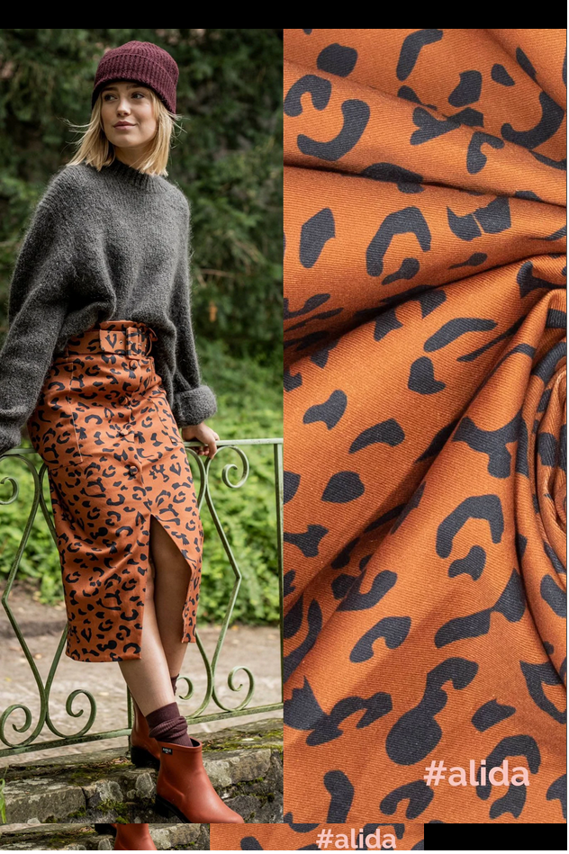 Hochwertiger Baumwolltwill aus der Fibre Mood Kollektion. Der Stoff ist rostbraun mit schwarzem Leo-Muster. Du kannst daraus Jacken, Hosen, Blazer oder Etuikleider nähen.
