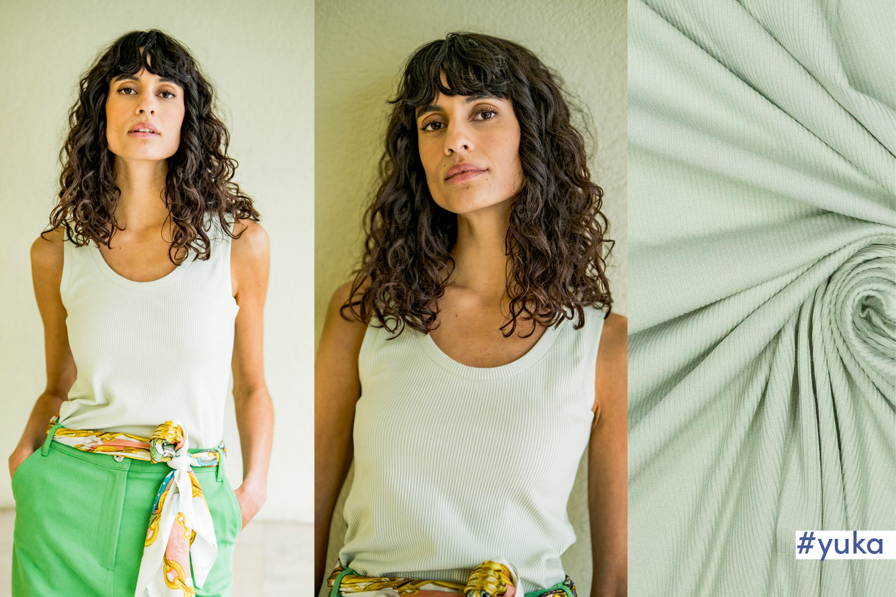 Matchafarbener Rib Jersey für stylische Tanktops. Der Rib Jersey wurde in der Fibre Mood Special n°3 (Ausgabe 27) für die Schnitte Yuka, Elza und Cheryl verwendet und wir haben ihn auch noch in dunkelgrün. Da Rib Jersey sehr elastisch ist, eignet er sich hervorragend für Tops, Bodycon Kleider und anliegende Kleidungsstücke.
