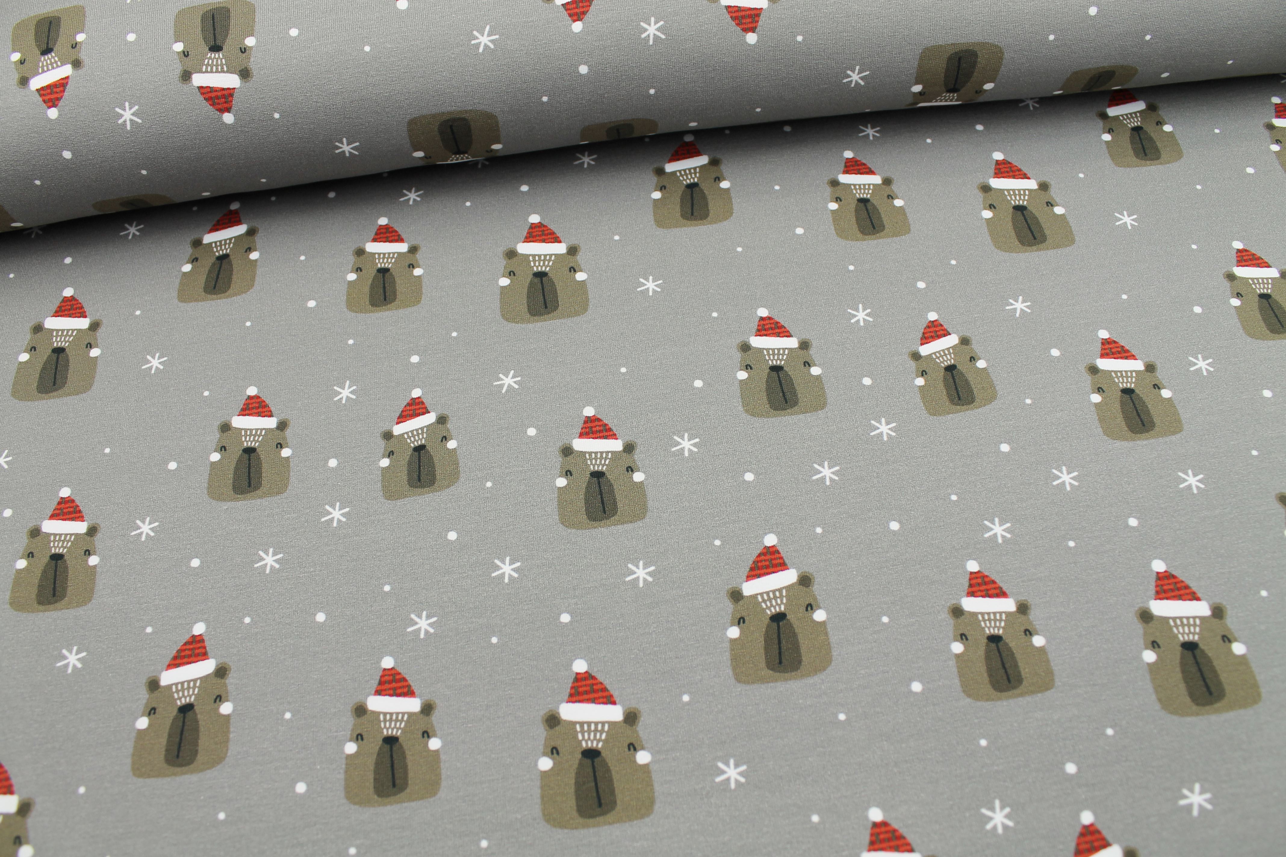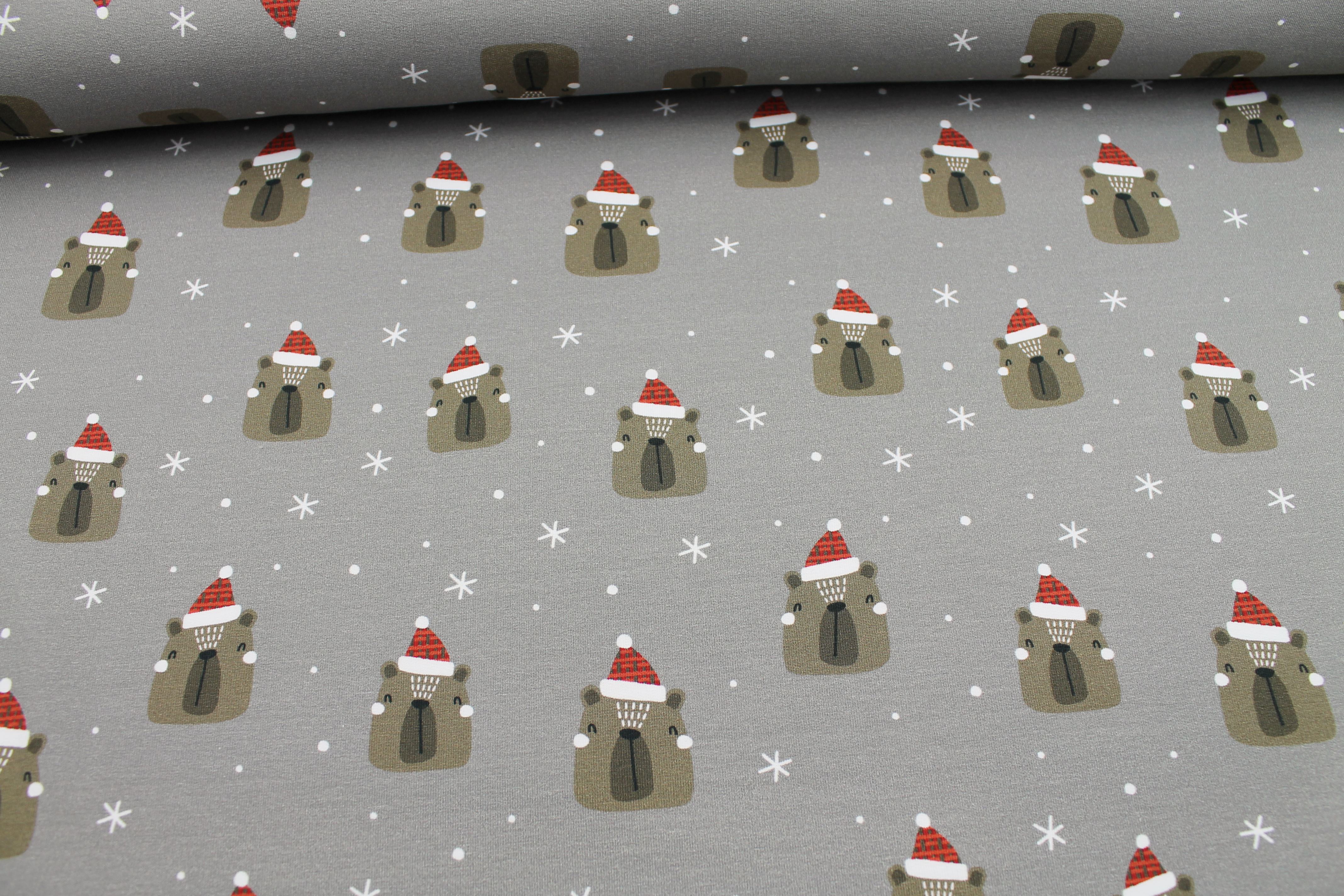 Hochwertiger French Terry in taupe mit niedlichen Bären mit Nikolausmützen.