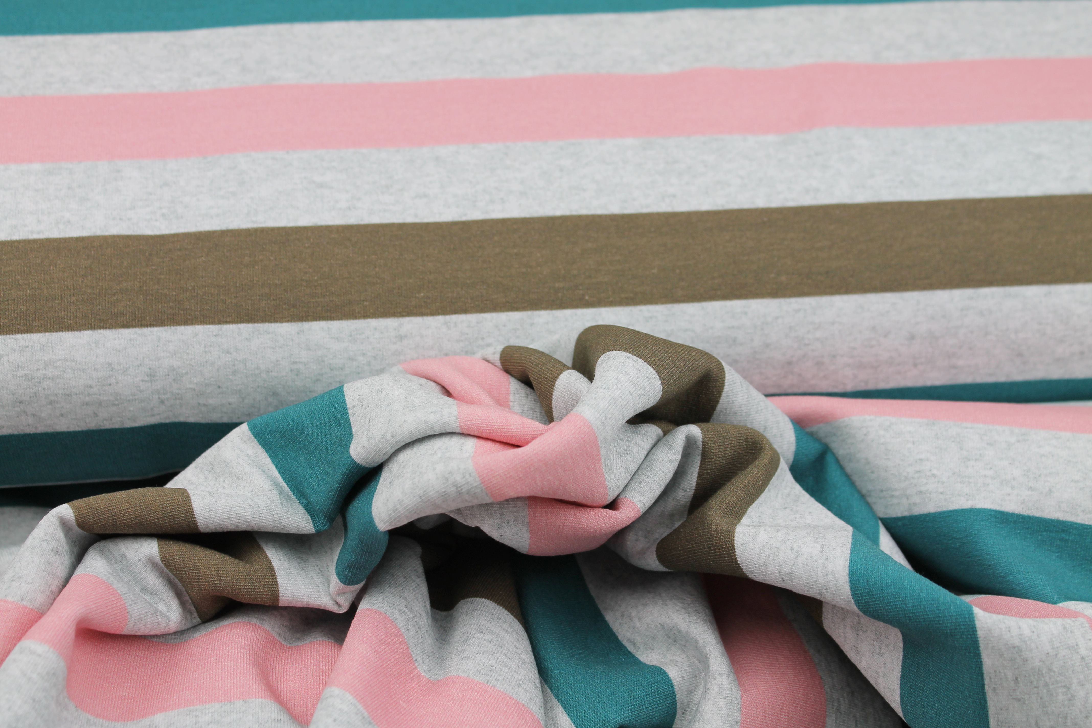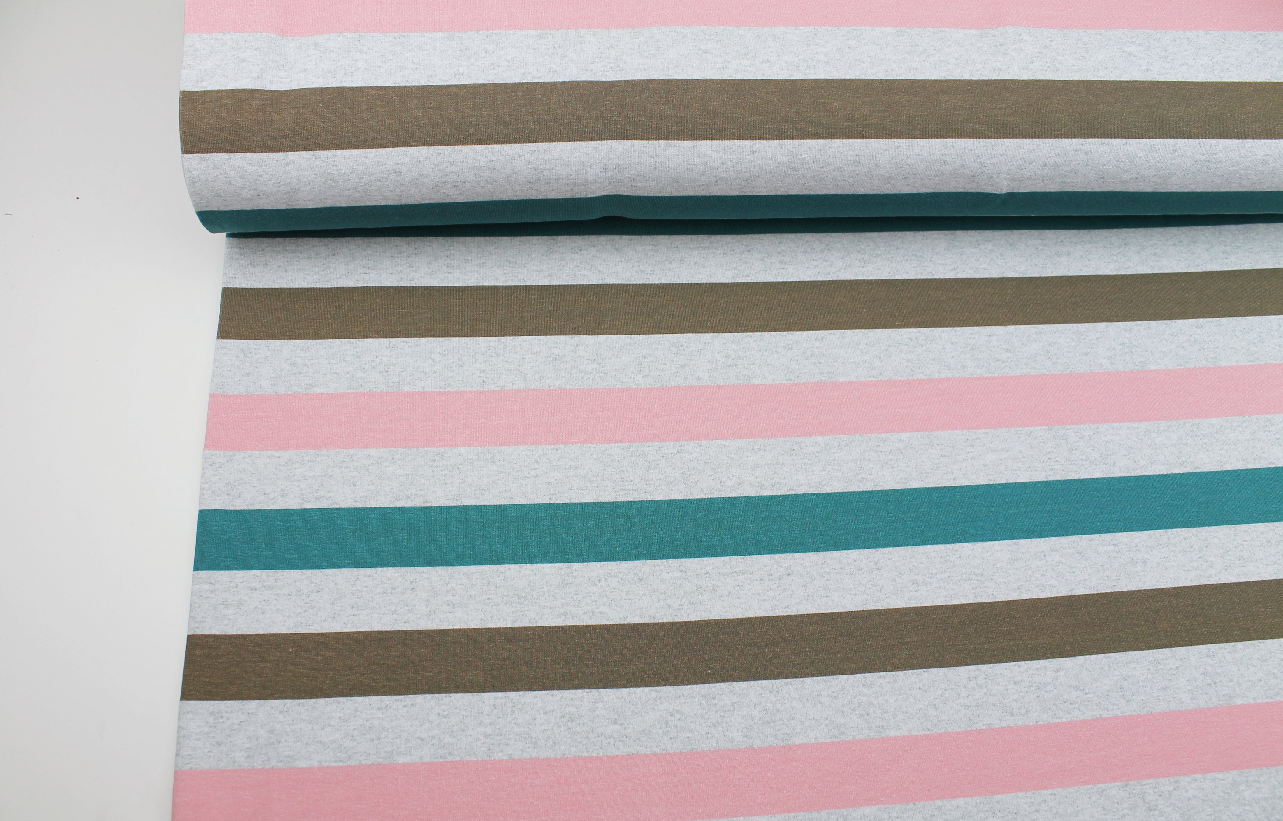 Hochwertiger French Terry mit Streifen. Die Streifen sind grau meliert, petrol, khaki und rosa. Material: 92% Baumwolle, 8% Elasthan Breite: 145cm Gewicht: 230gr/m² Ökotex Standard 100