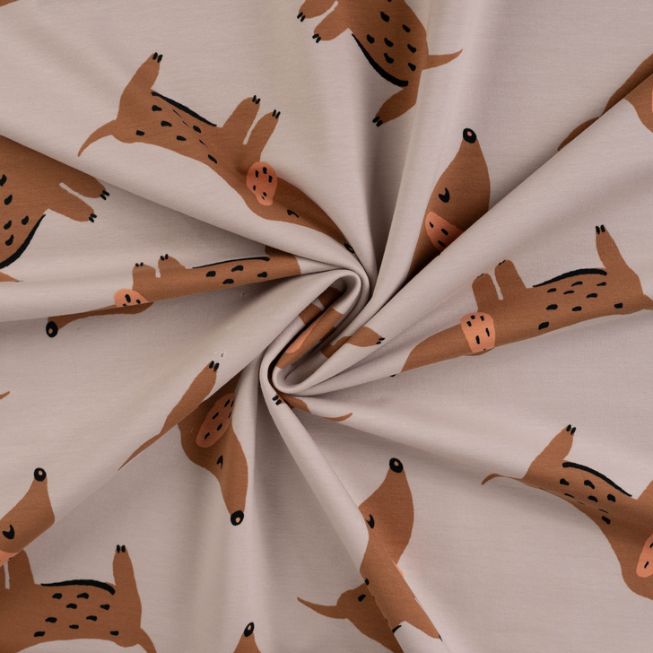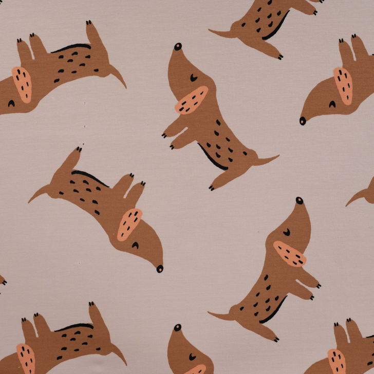 French Terry in taupe mit niedlichen braunen Dackeln. Die großen Motive liegen zur Zeit voll im Trend und machen sich auch sehr gut auf Erwachsenenkleidung.