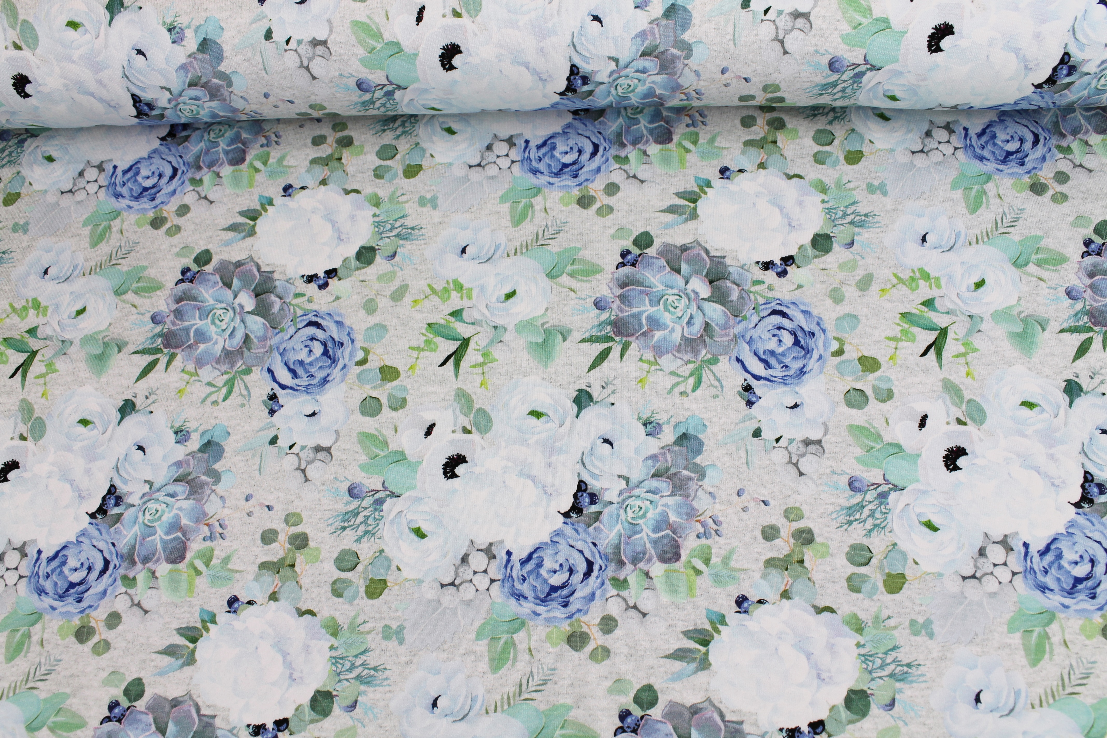 Hochwertiger French Terry in grau meliert mit prächtigen Hortensien in zartem blau und weiß.