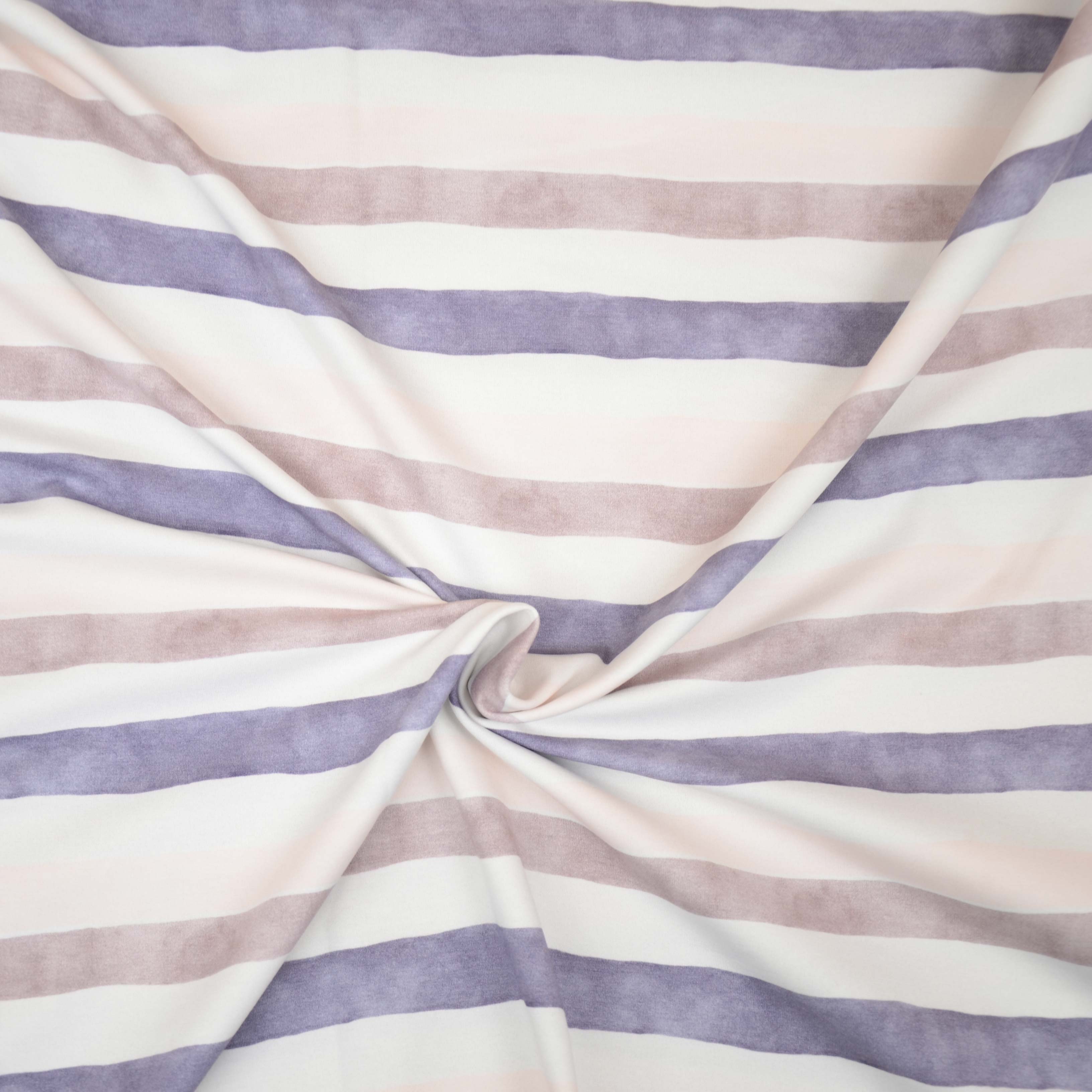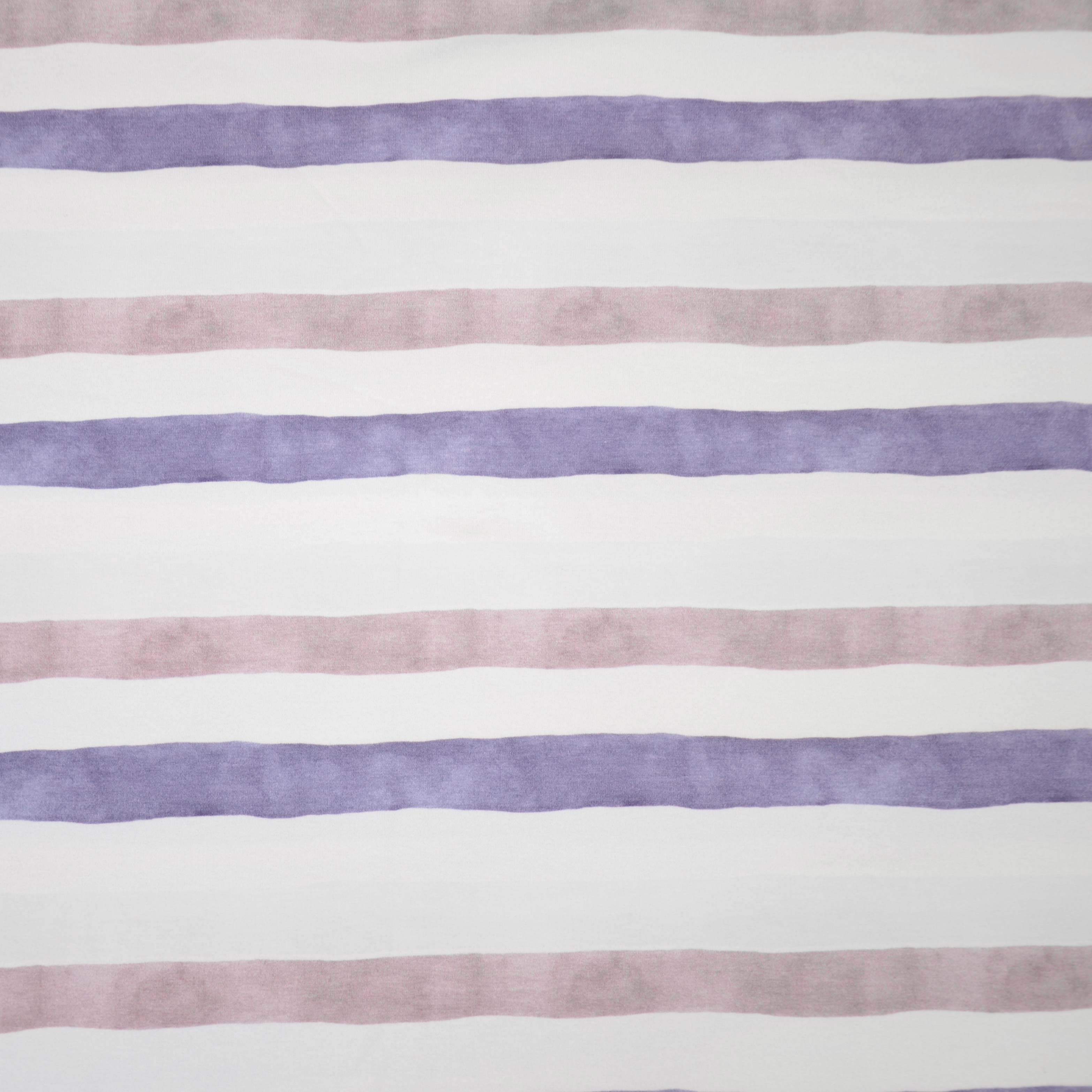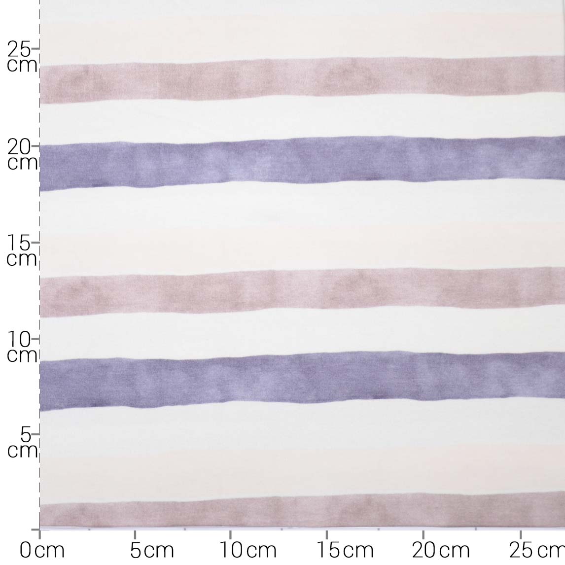 Hochwertiger French Terry mit ganz leichter Anrauhung auf der Rückseite. Der French Terry hat breite Streifen in Aquarelloptik. Die Farben sind altrosa, creme und flieder.