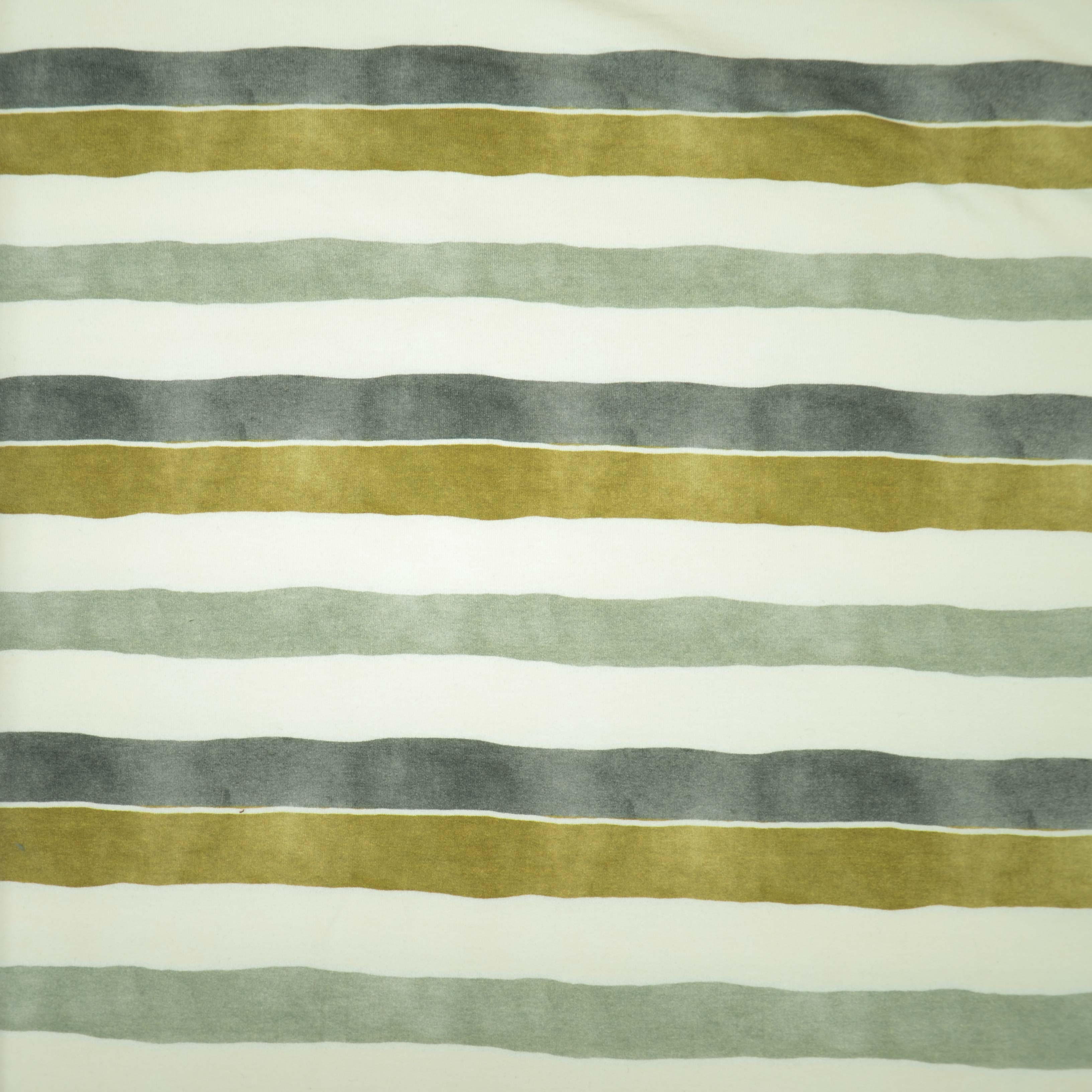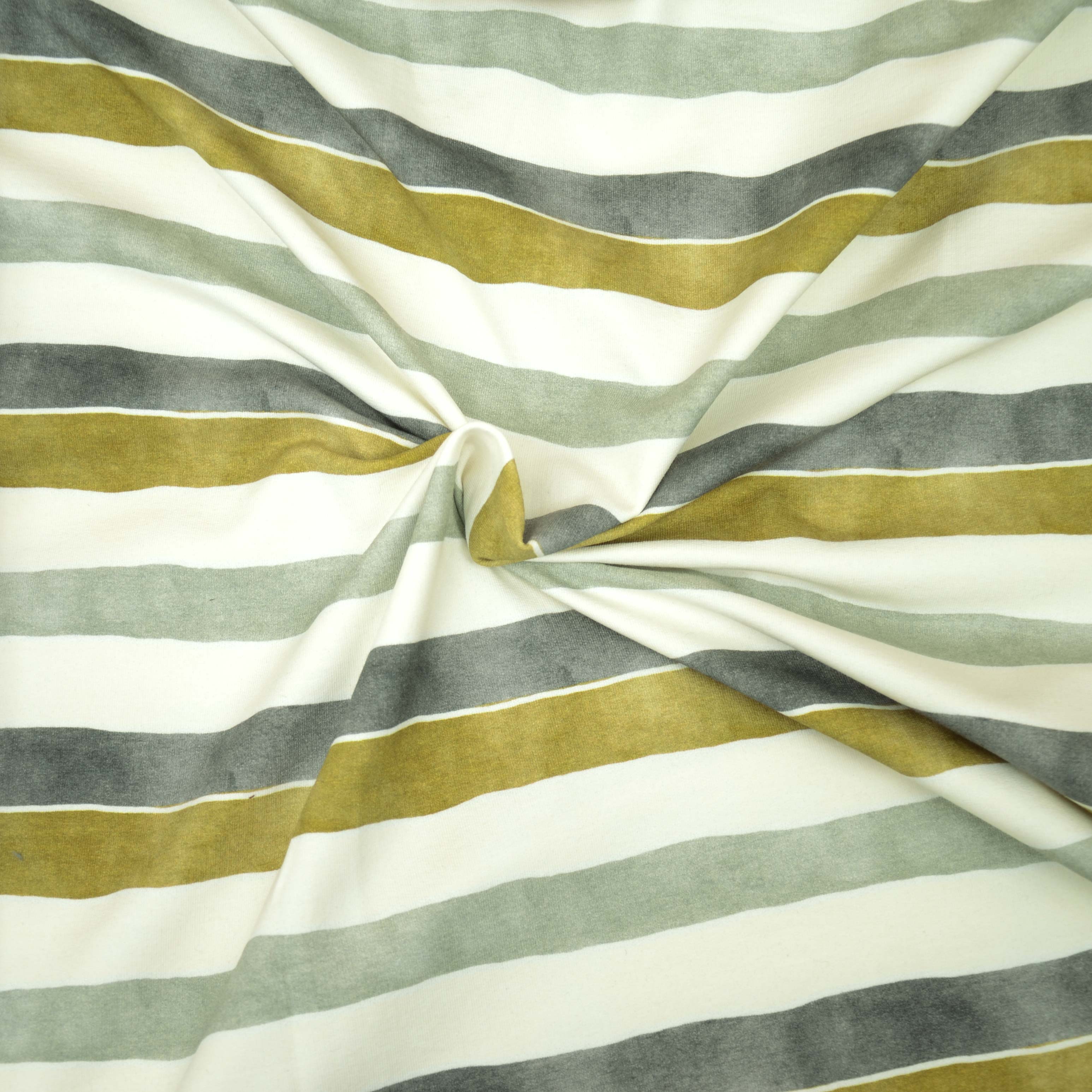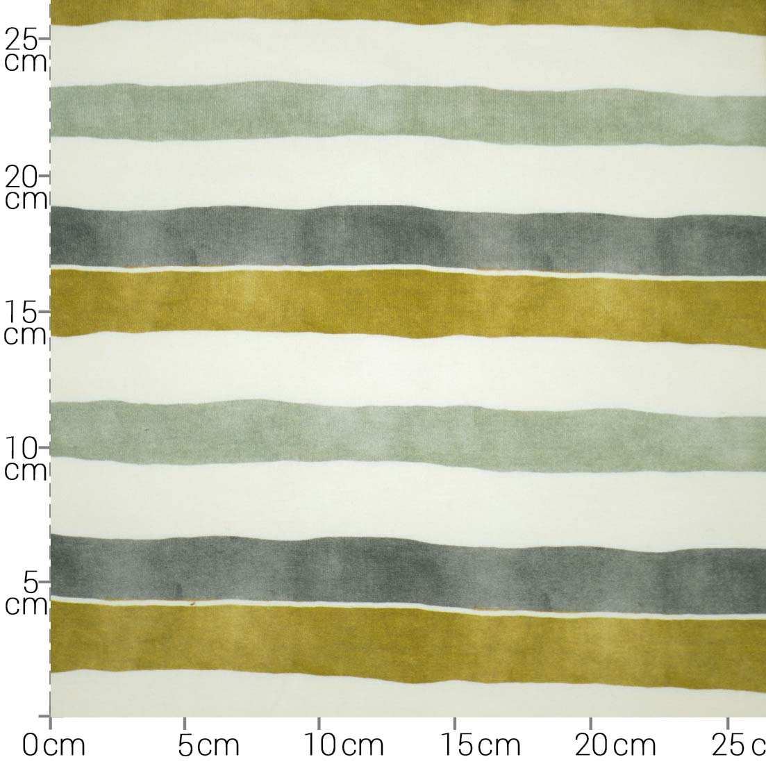 Hochwertiger French Terry mit ganz leichter Anrauhung auf der Rückseite. Der French Terry hat breite Streifen in Aquarelloptik. Die Farben sind senf, creme und salbeigrün.