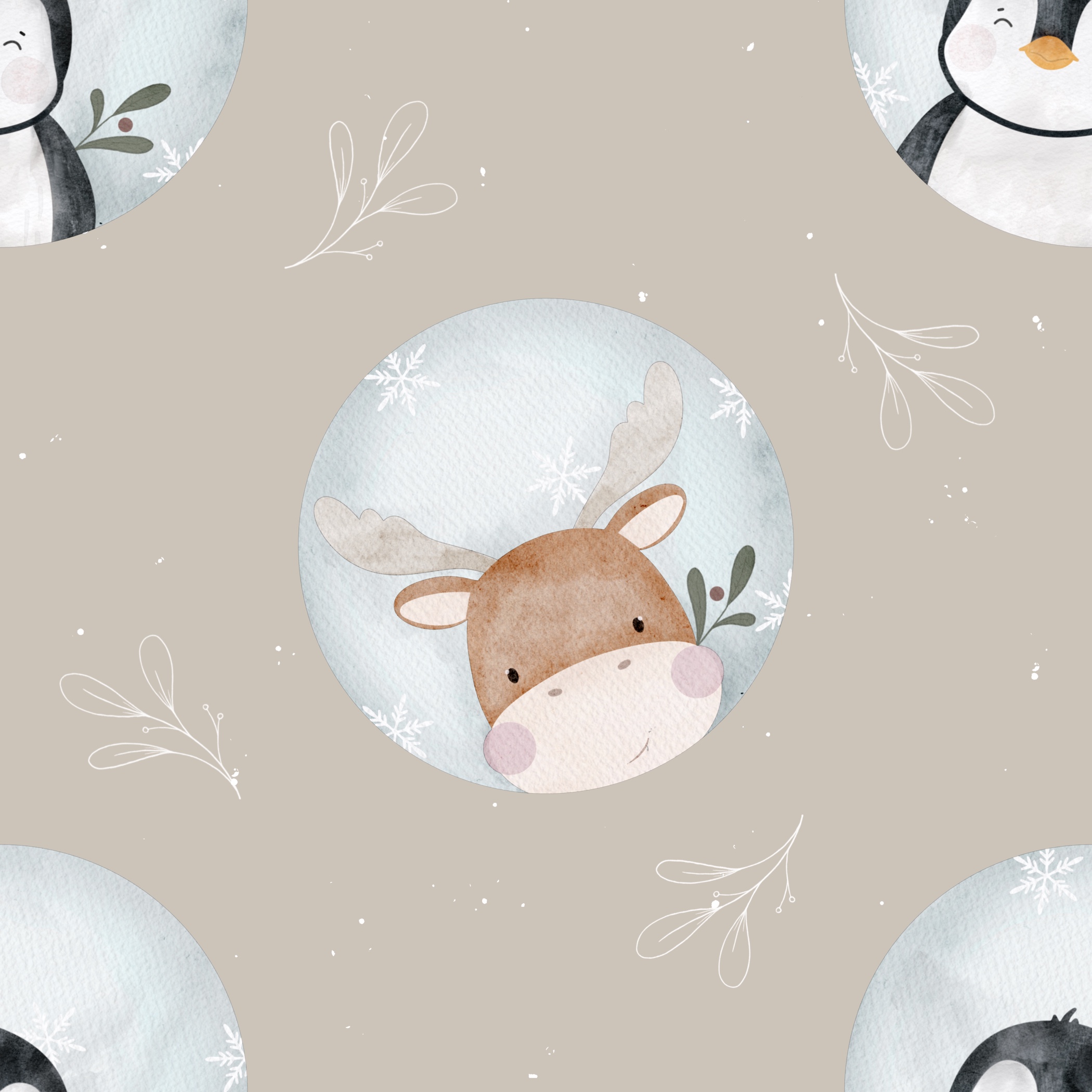 Henri, der Elch und Pingu, der kleine Pinguin in kleinen Schneekugeln.