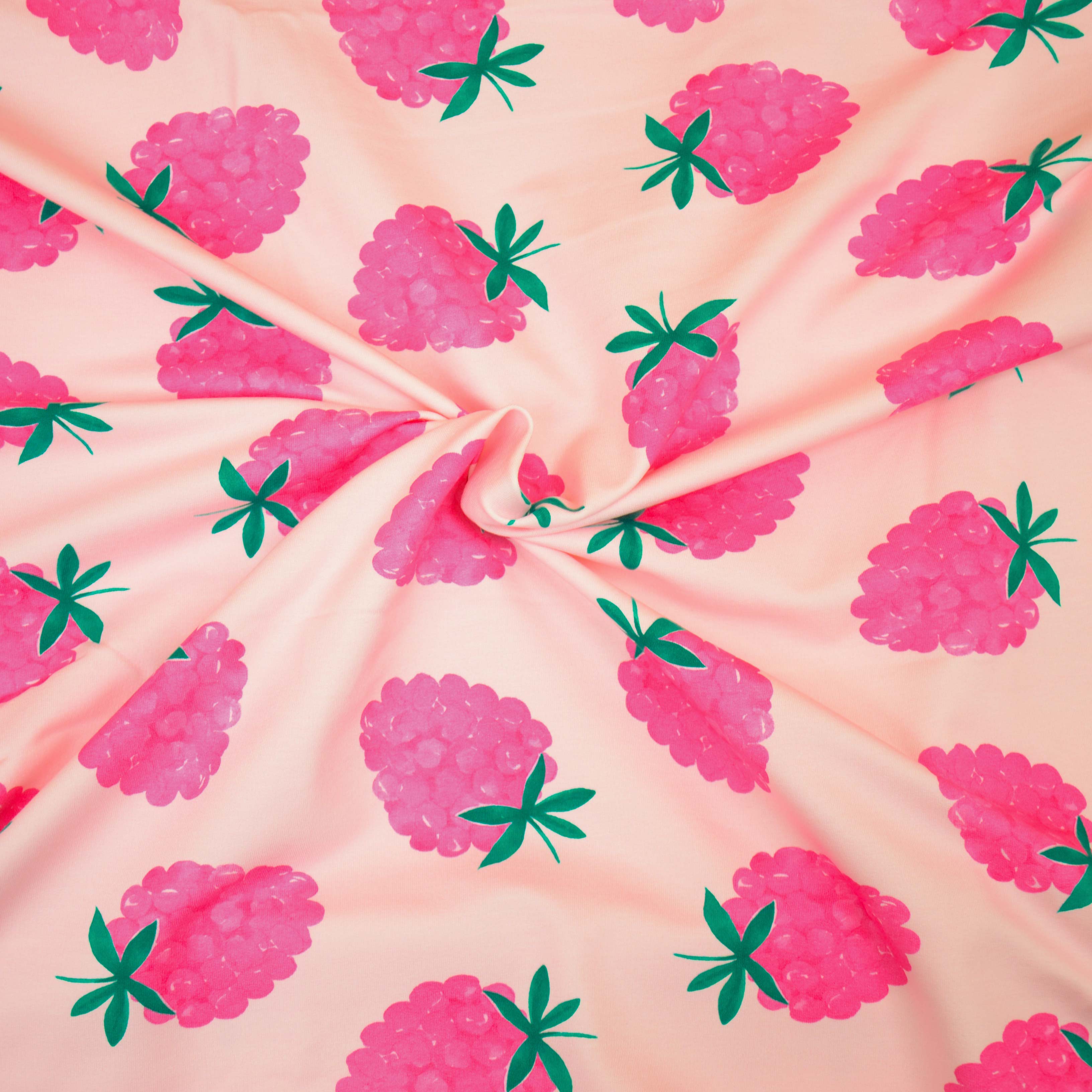 Hochwertiger French Terry von Hilco in rosa mit großen Himbeeren.
