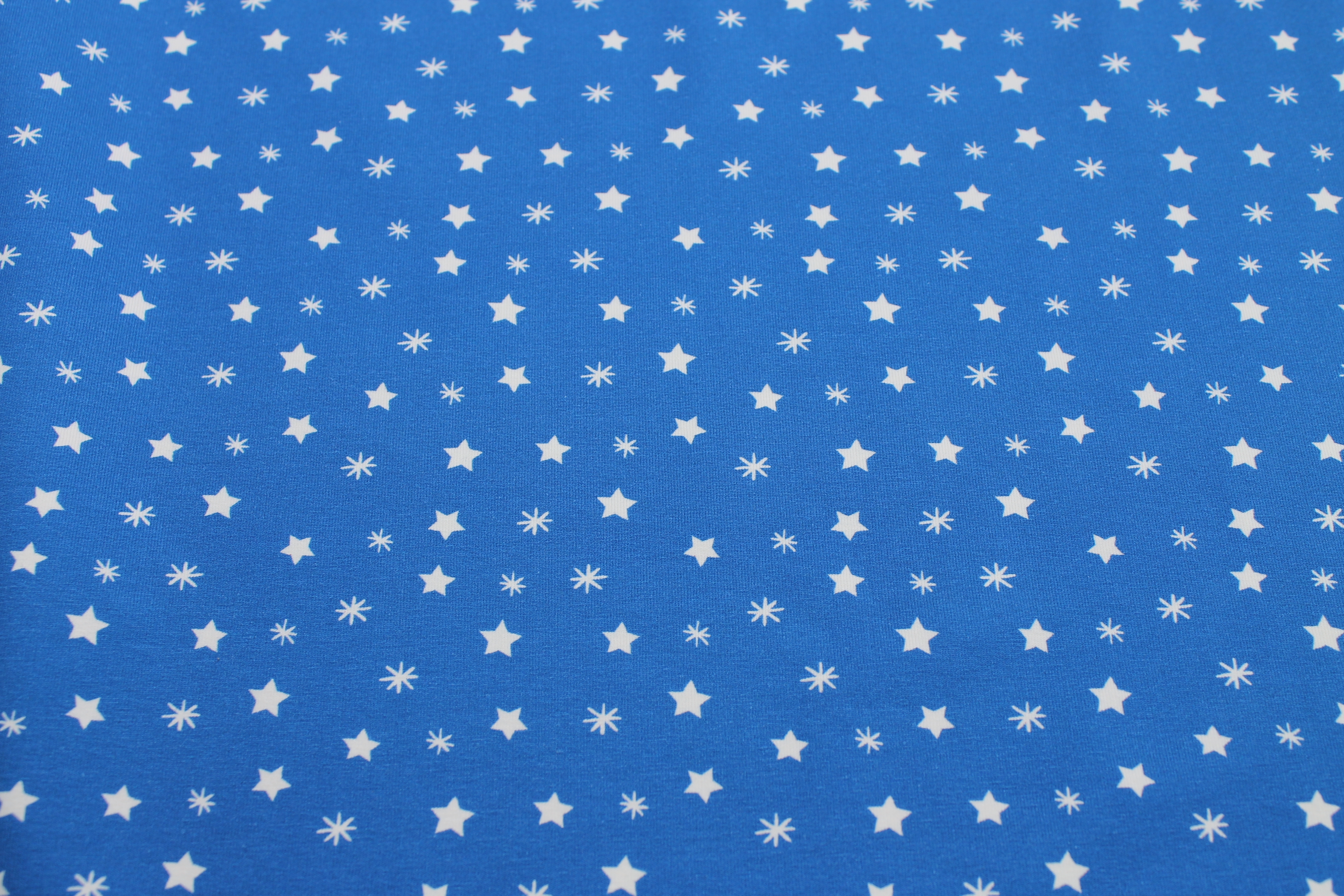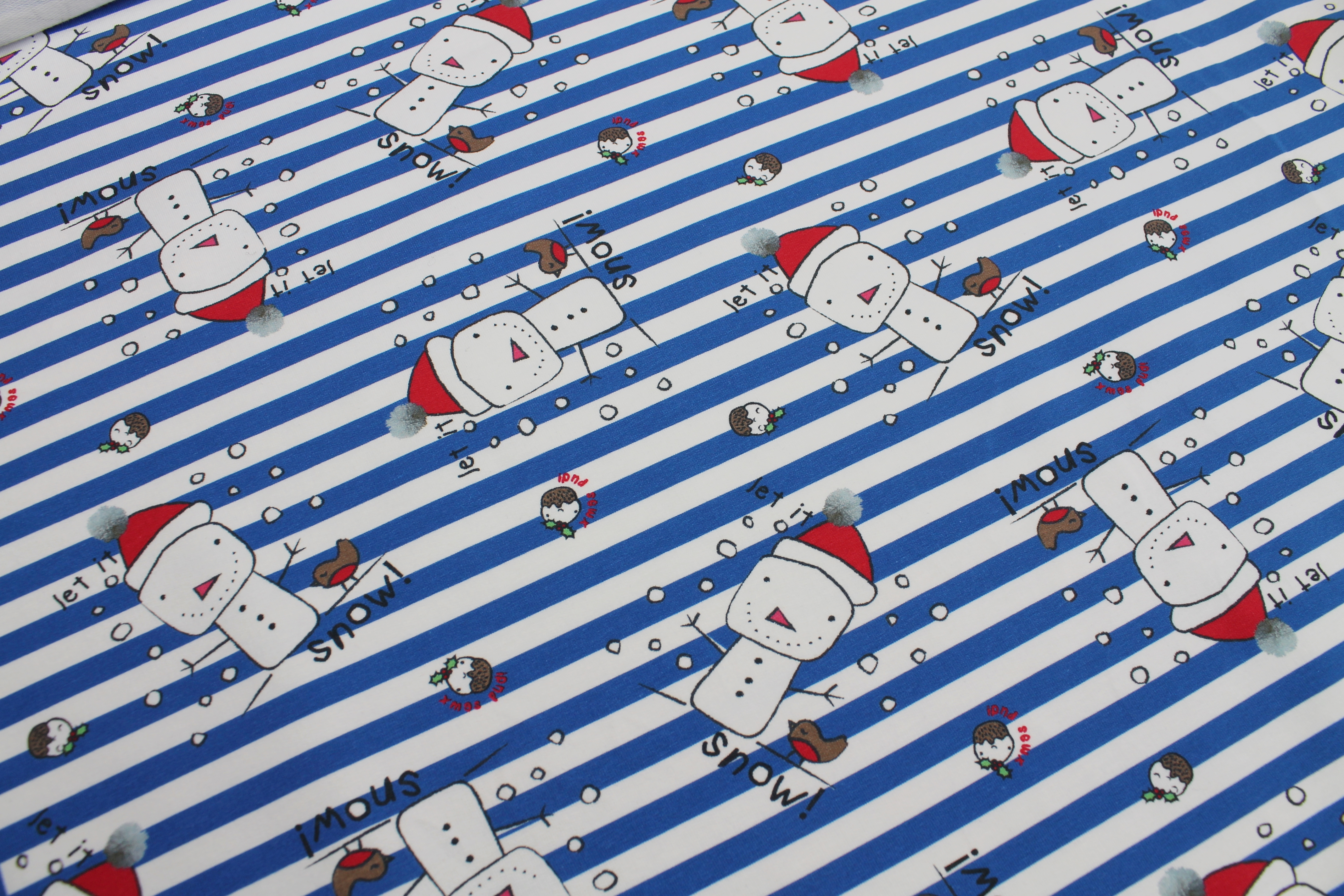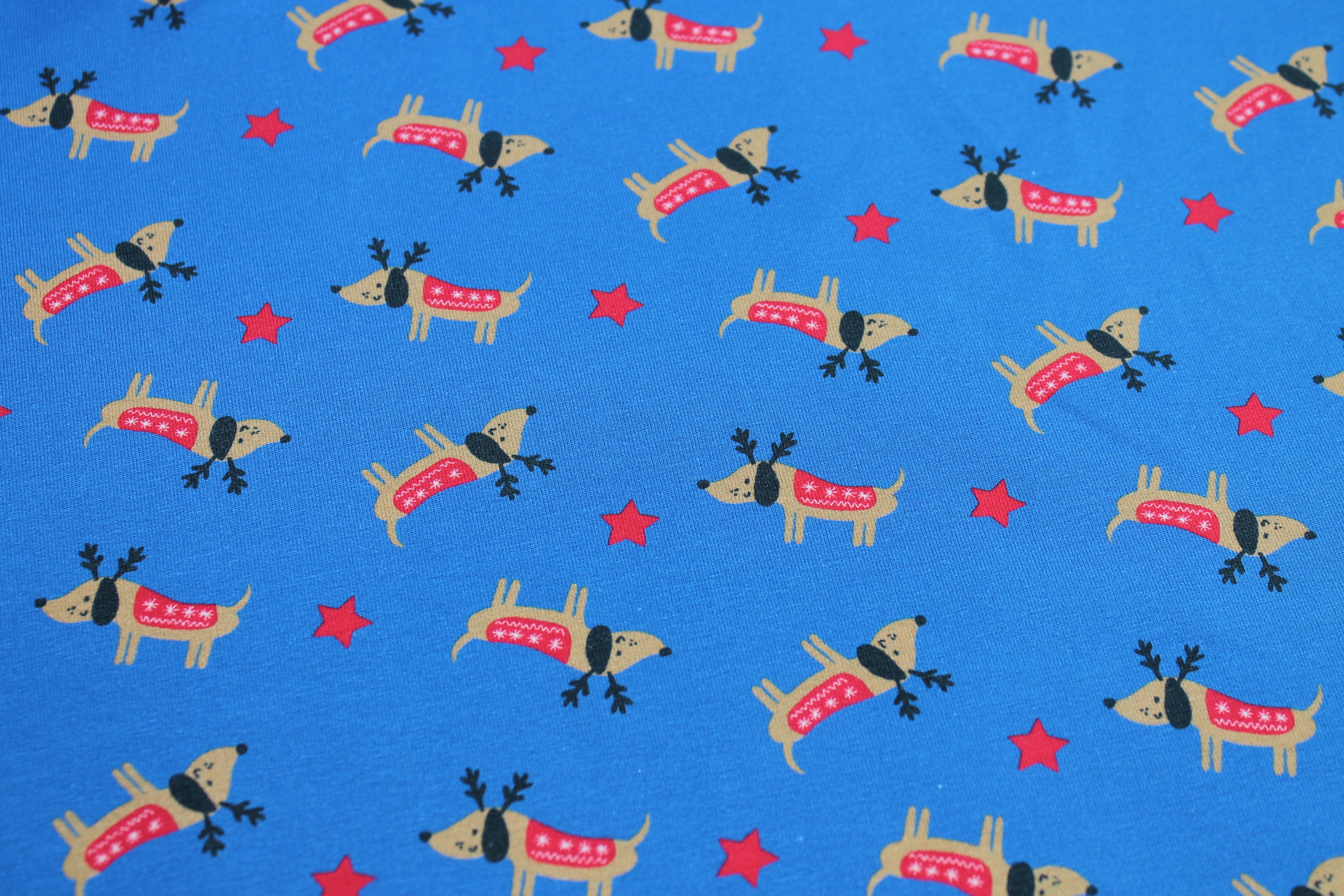 Leichter French Terry von Hilco in blau mit Weihnachtsmotiven. Der Stoff wird rapportweise verkauft, die Länge ist jeweils ca. 115cm.