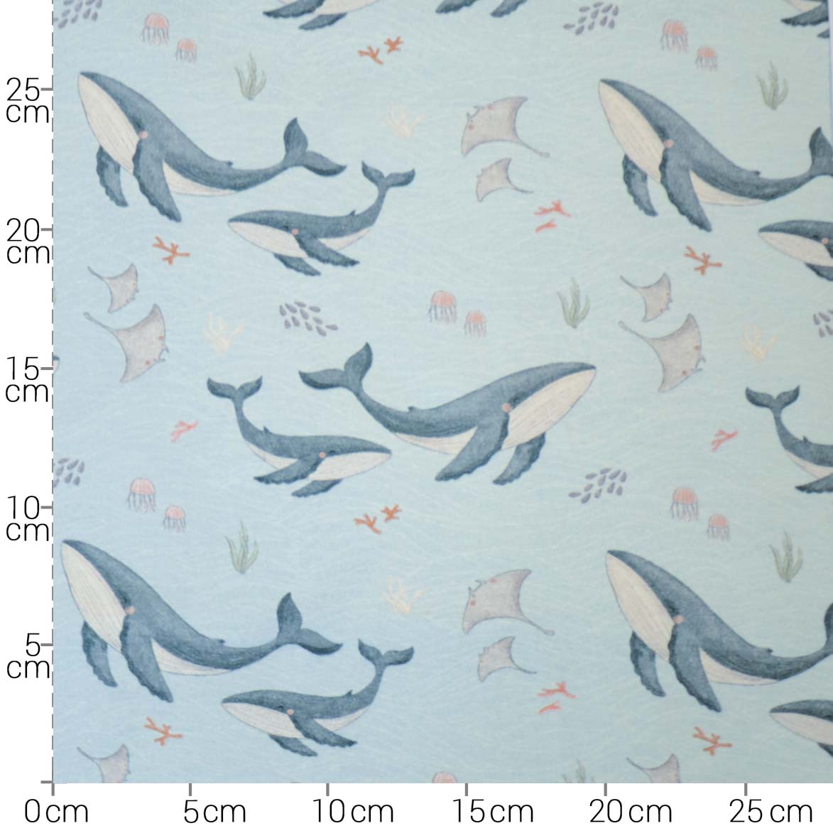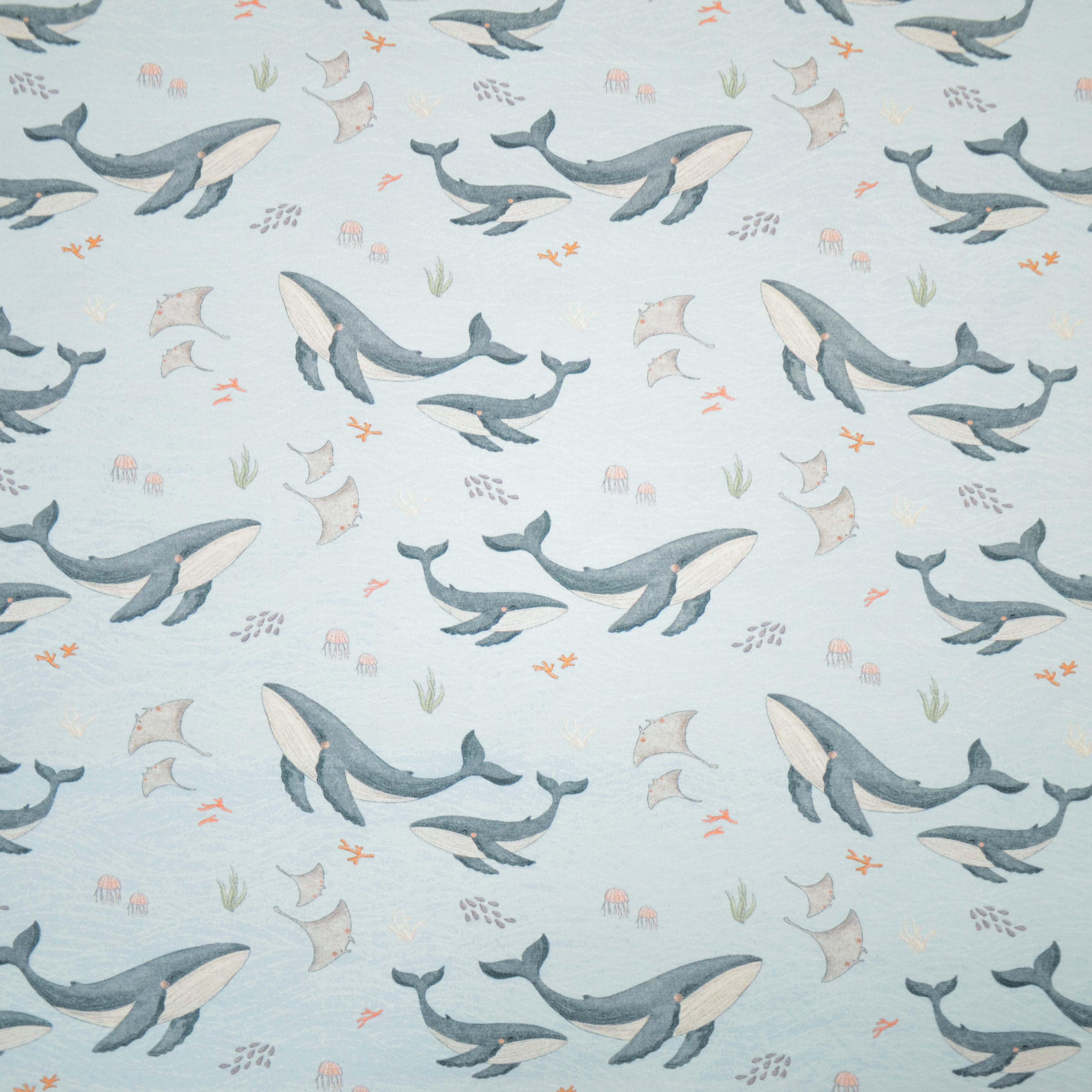 Hochwertiger Baumwolljersey von Hilco in hellblau. Als Motiv findest Du auf dem Stoff kleine Wale, Rochen und Quallen. Material: 90% Baumwolle, 10% Elasthan Breite: 150cm Gewicht: 237gr/m² Ökotex 100 Standard EN 71-3 konform