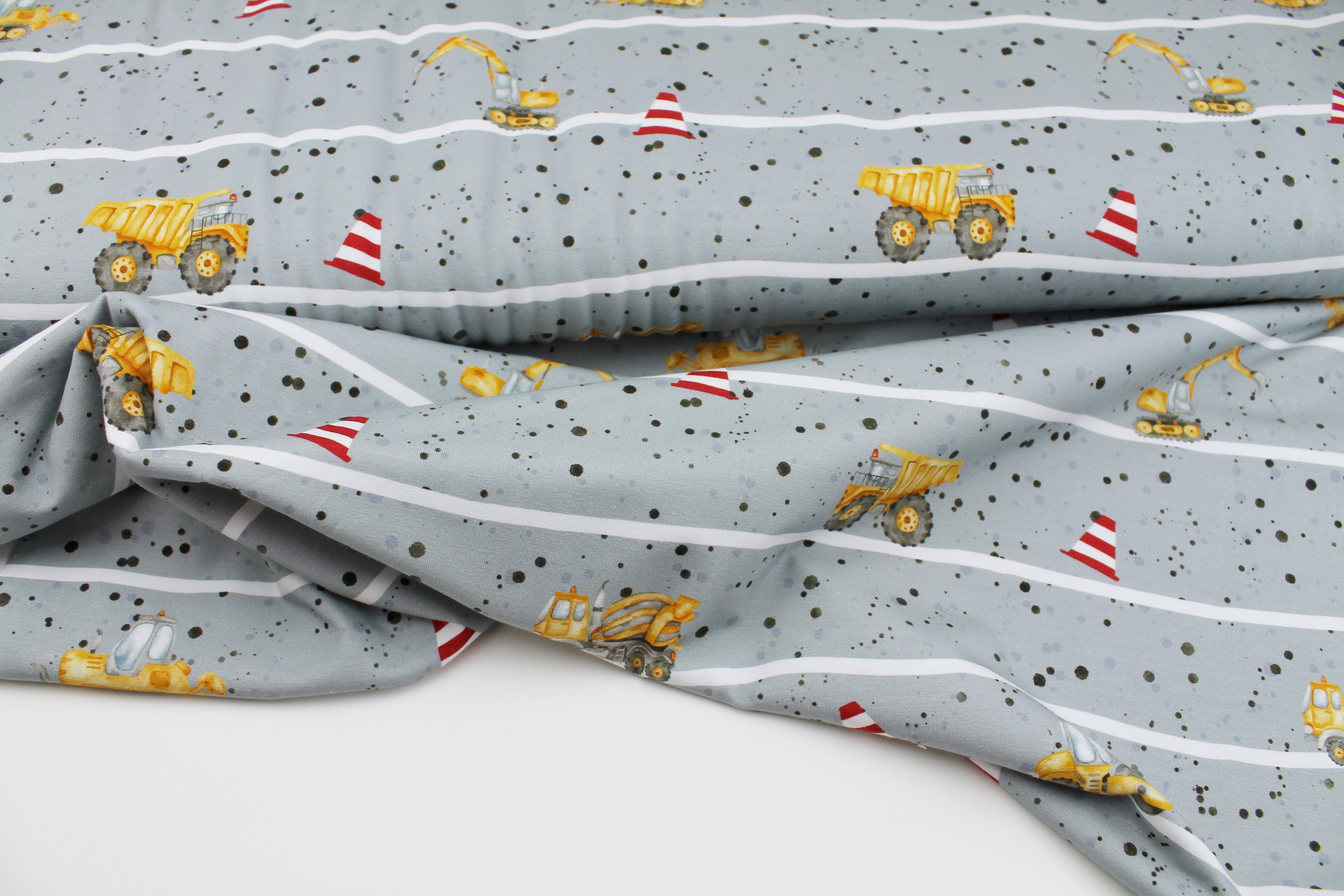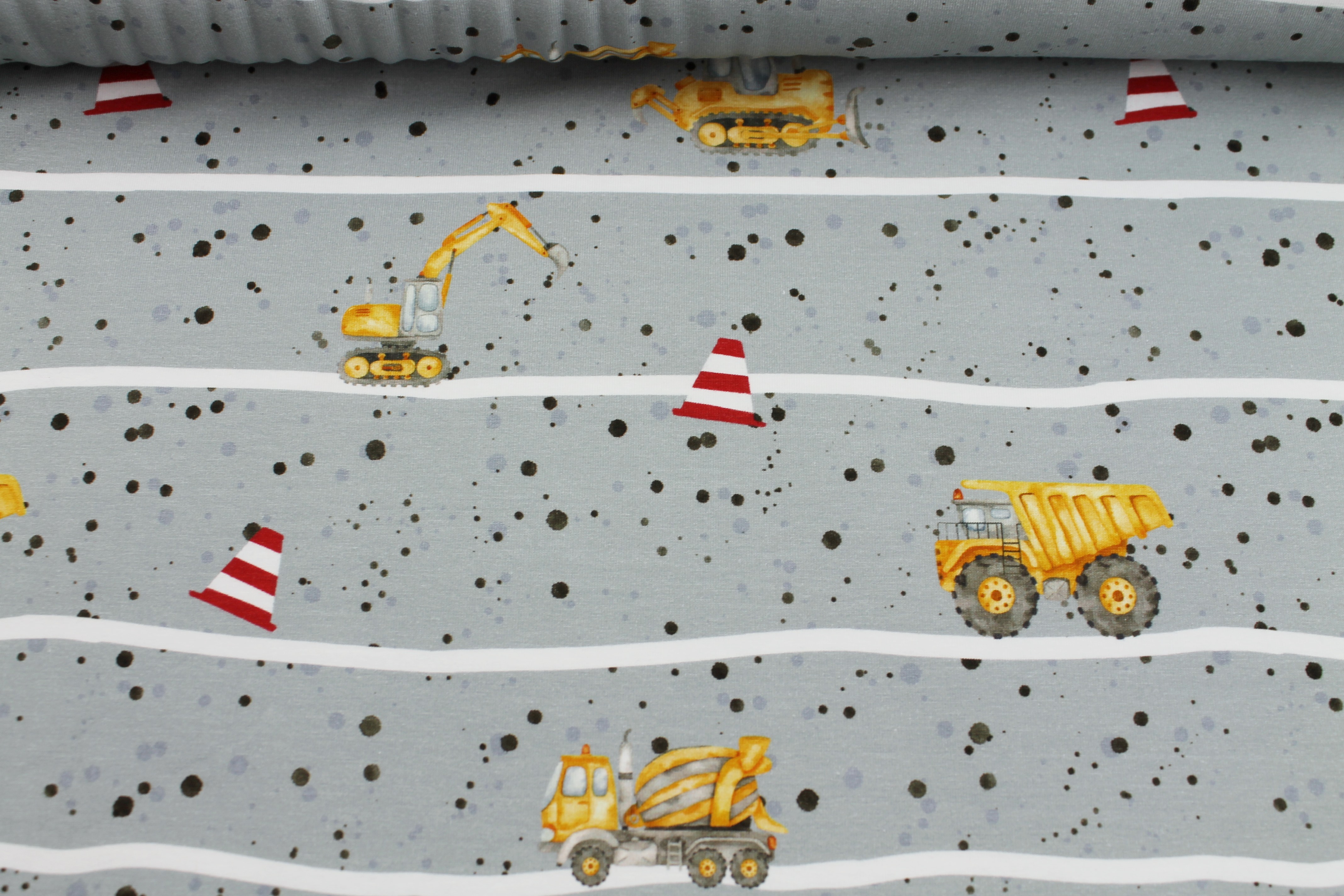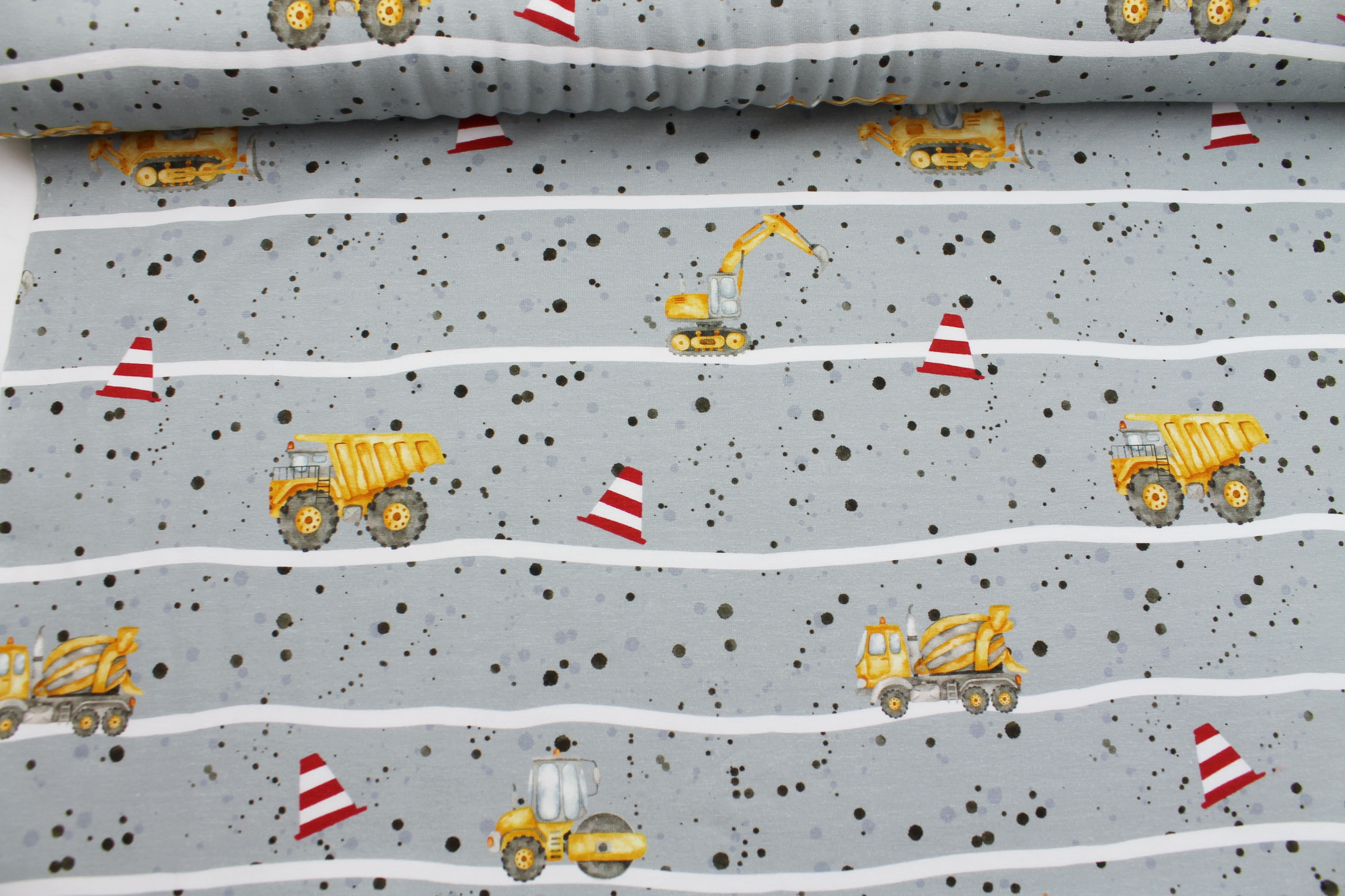 Hellgrauer Jersey aus Baumwolle mit tollem Baustellen Motiv. Auf dem Stoff findest Du Bagger, Radlader, Betonmischer und viele andere Baustellenfahrzeuge. Material: 95% Baumwolle, 5% Elasthan Breite: 150cm Gewicht: 250gr/m² Ökotex 100 Standard