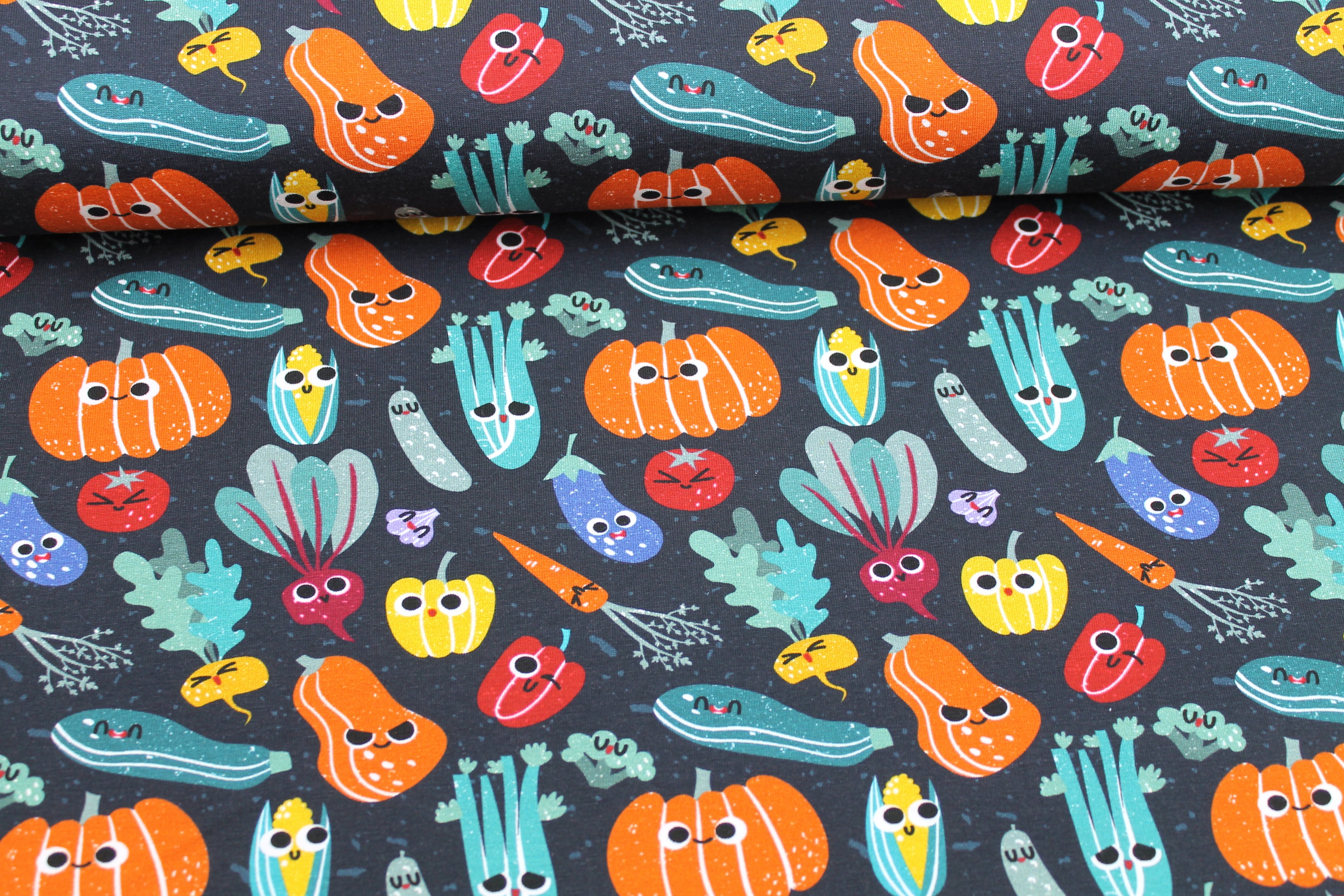 Dunkelblauer Jersey mit lustigem Gemüse. Auf dem Baumwolljersey findest Du Paprika, Karotten, Radieschen, Auberginen und einiges mehr.