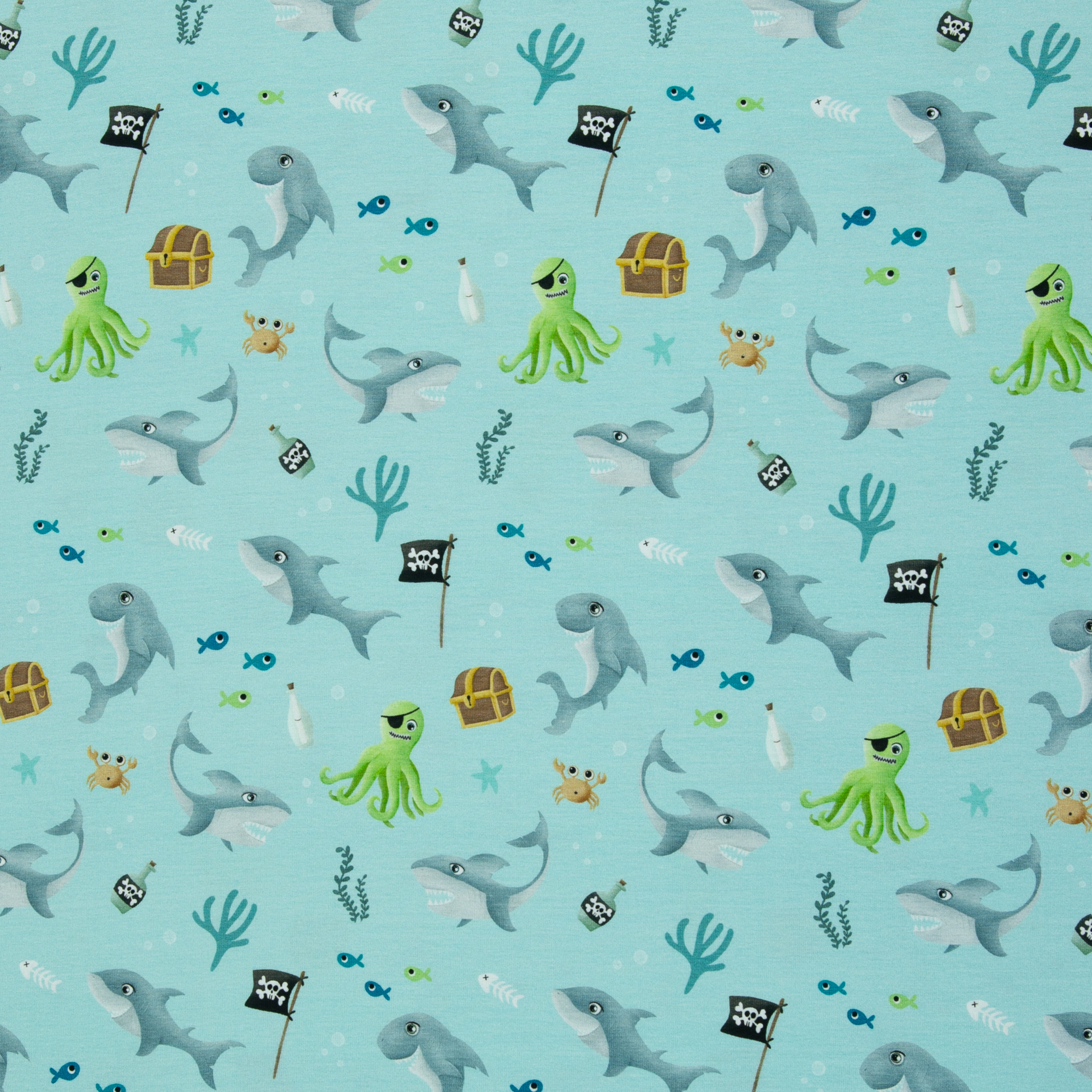 Hochwertiger Jersey in mint mit lustigen kleinen Piratenkraken, Haien und Schatztruhen. Der maritime Kinderjersey wurde von Mrs. Mint Design entworfen und von Swafing produziert.