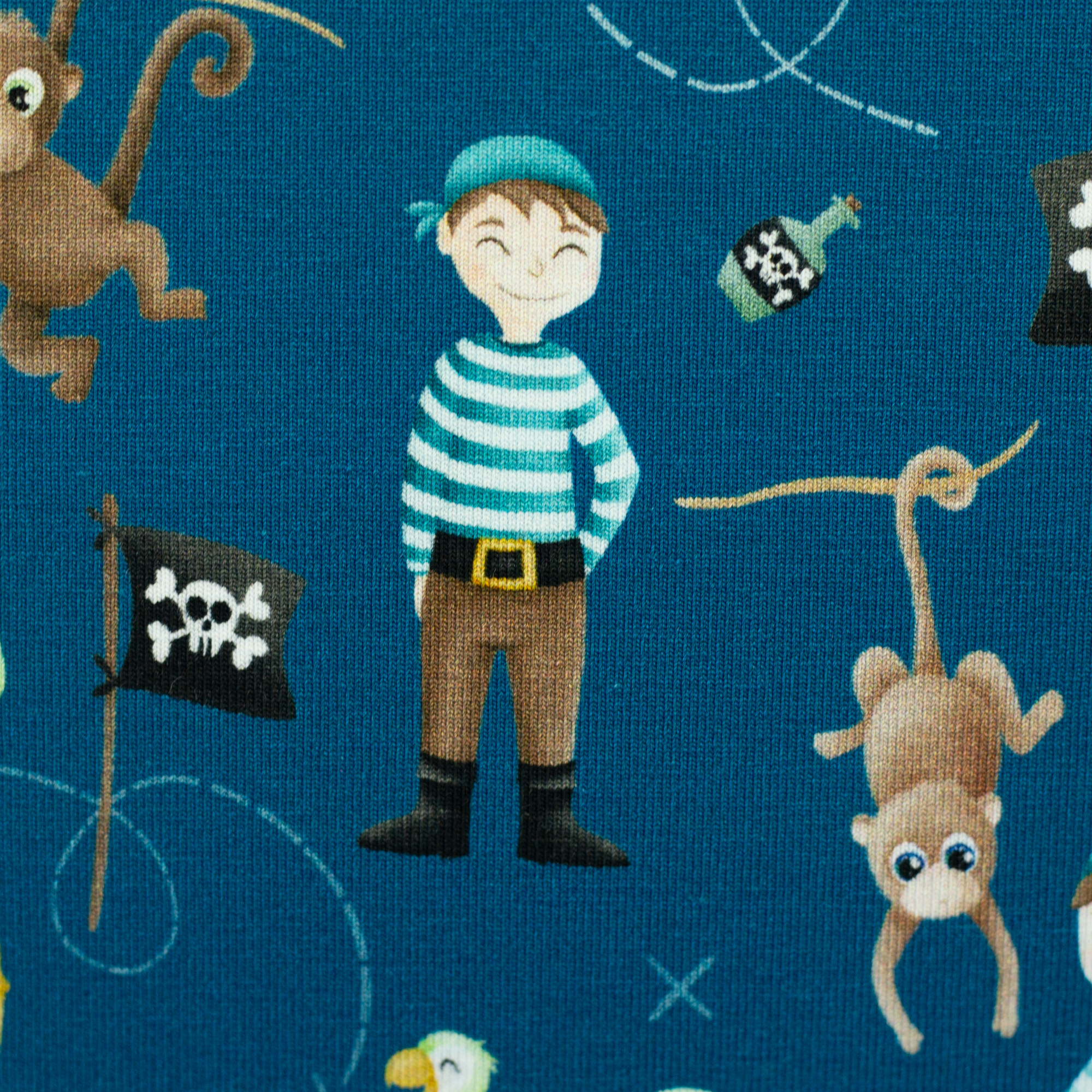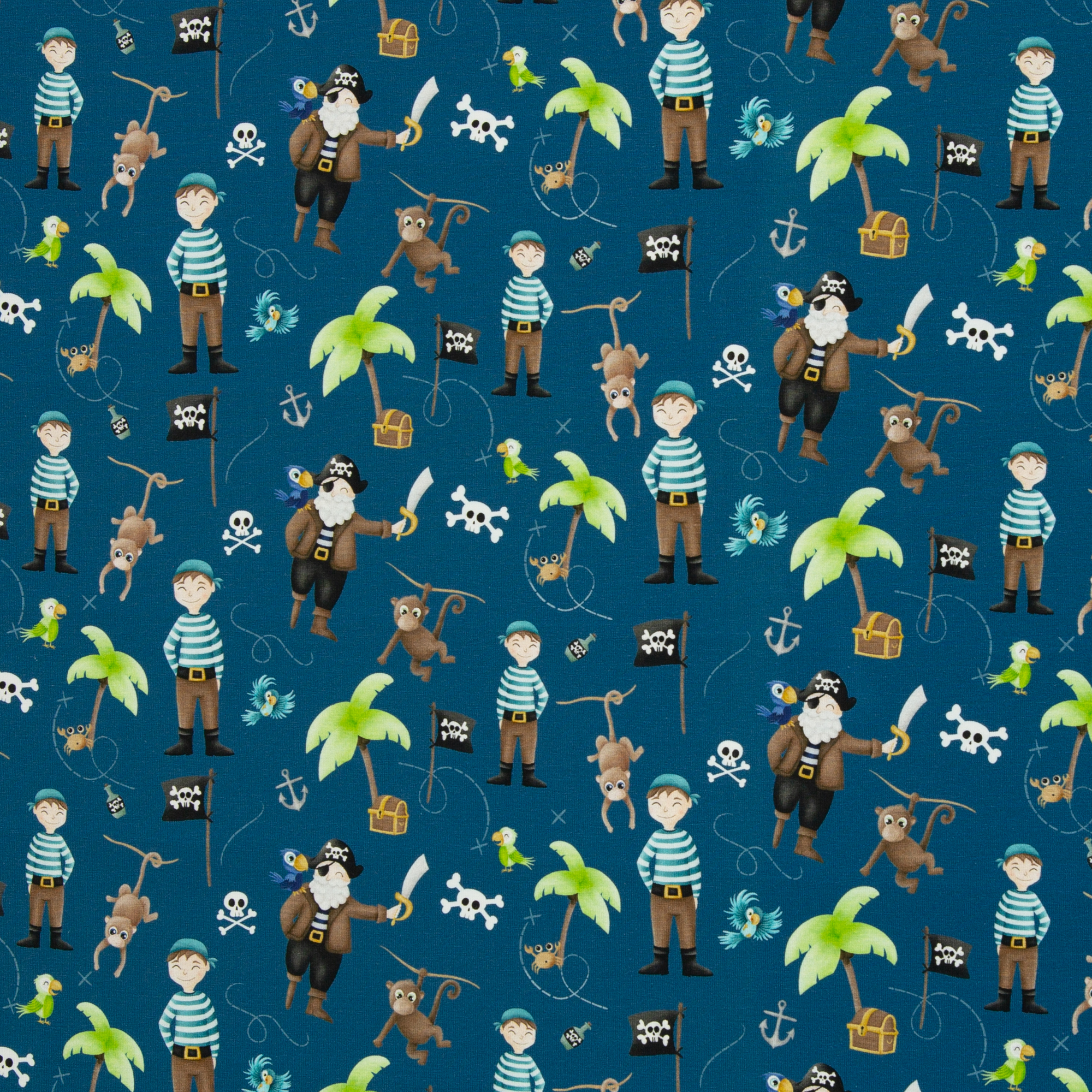 Hochwertiger Jersey in admiralblau mit lustigen kleinen Piraten. Der maritime Kinderjersey wurde von Mrs. Mint Design entworfen und von Swafing produziert.
