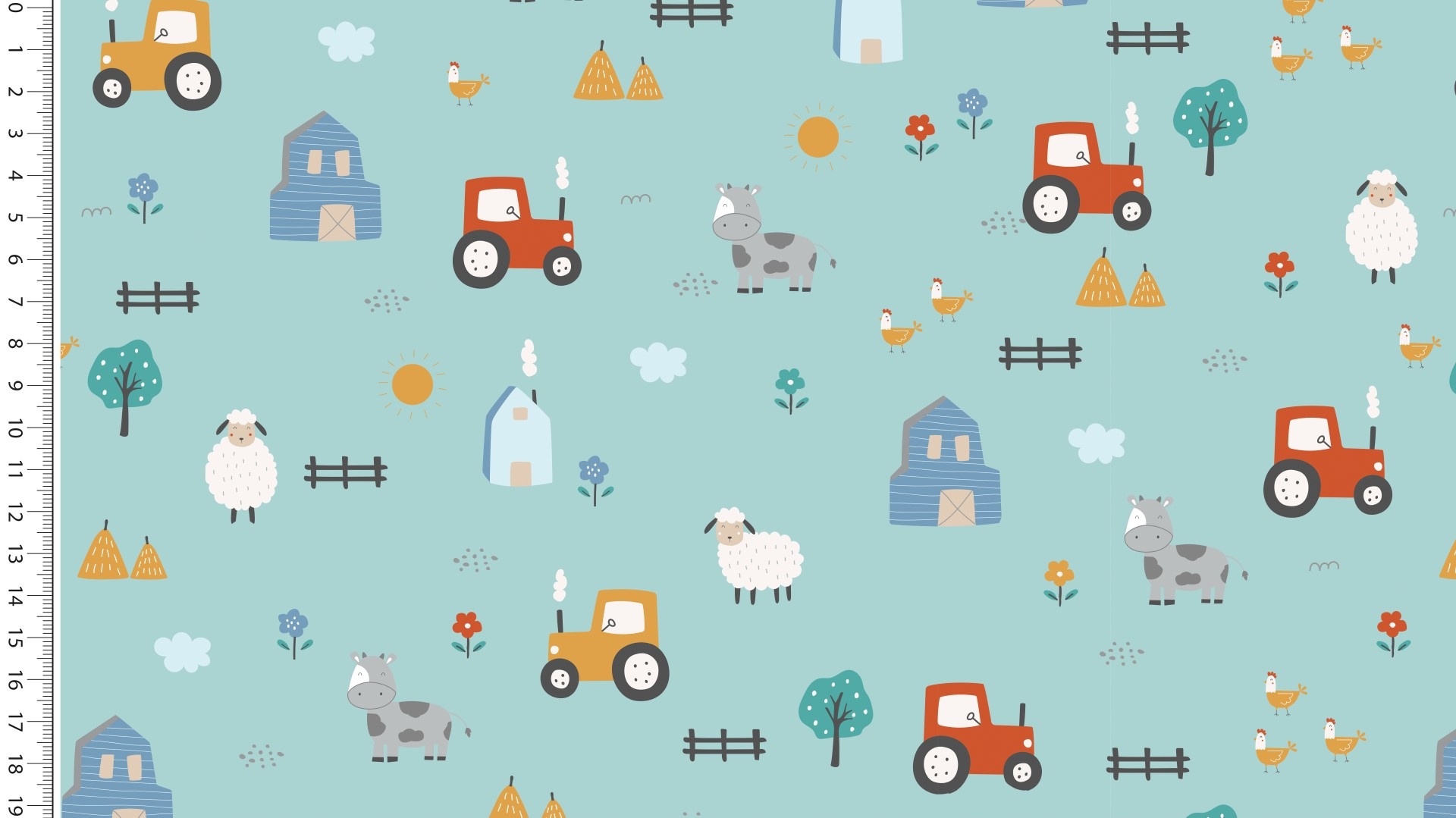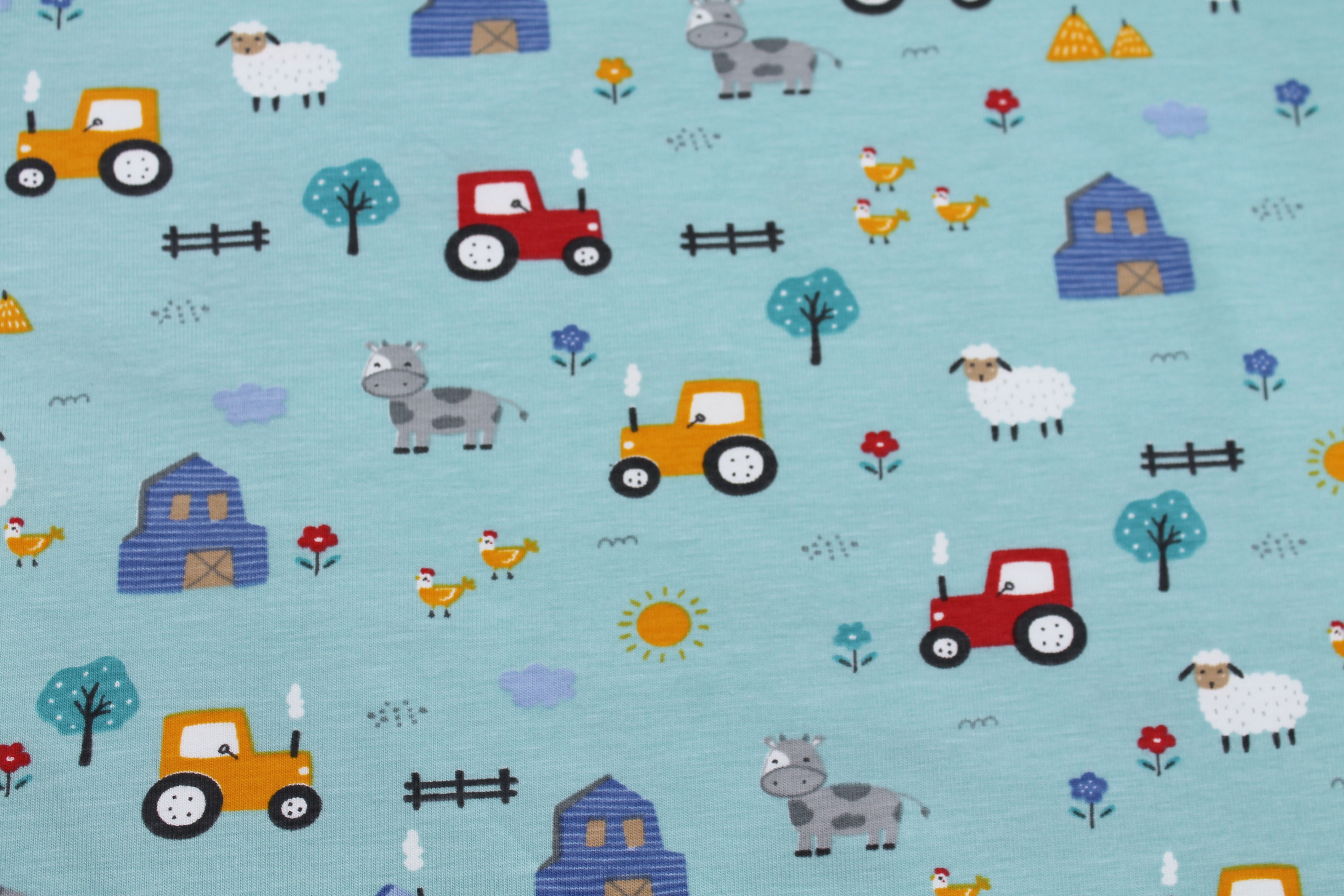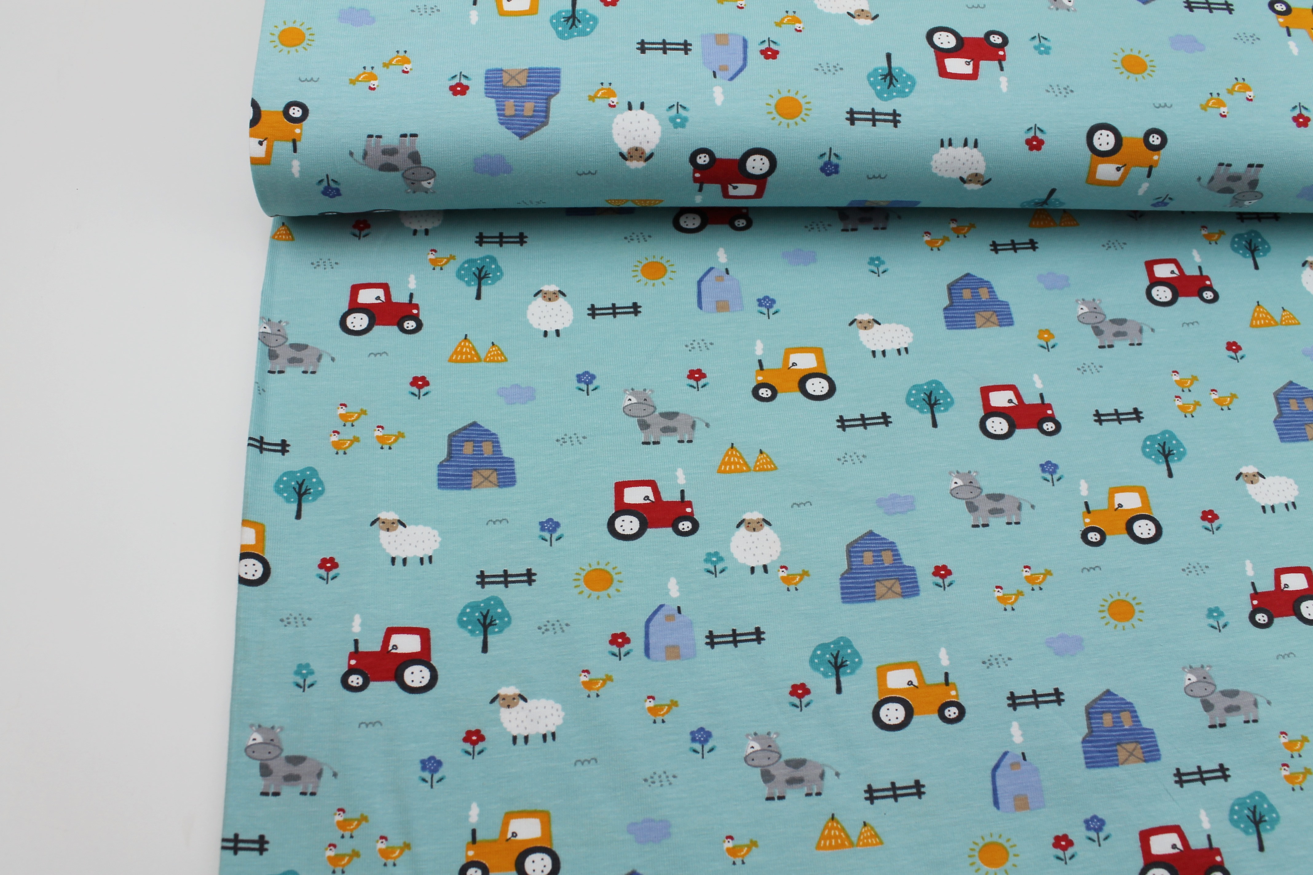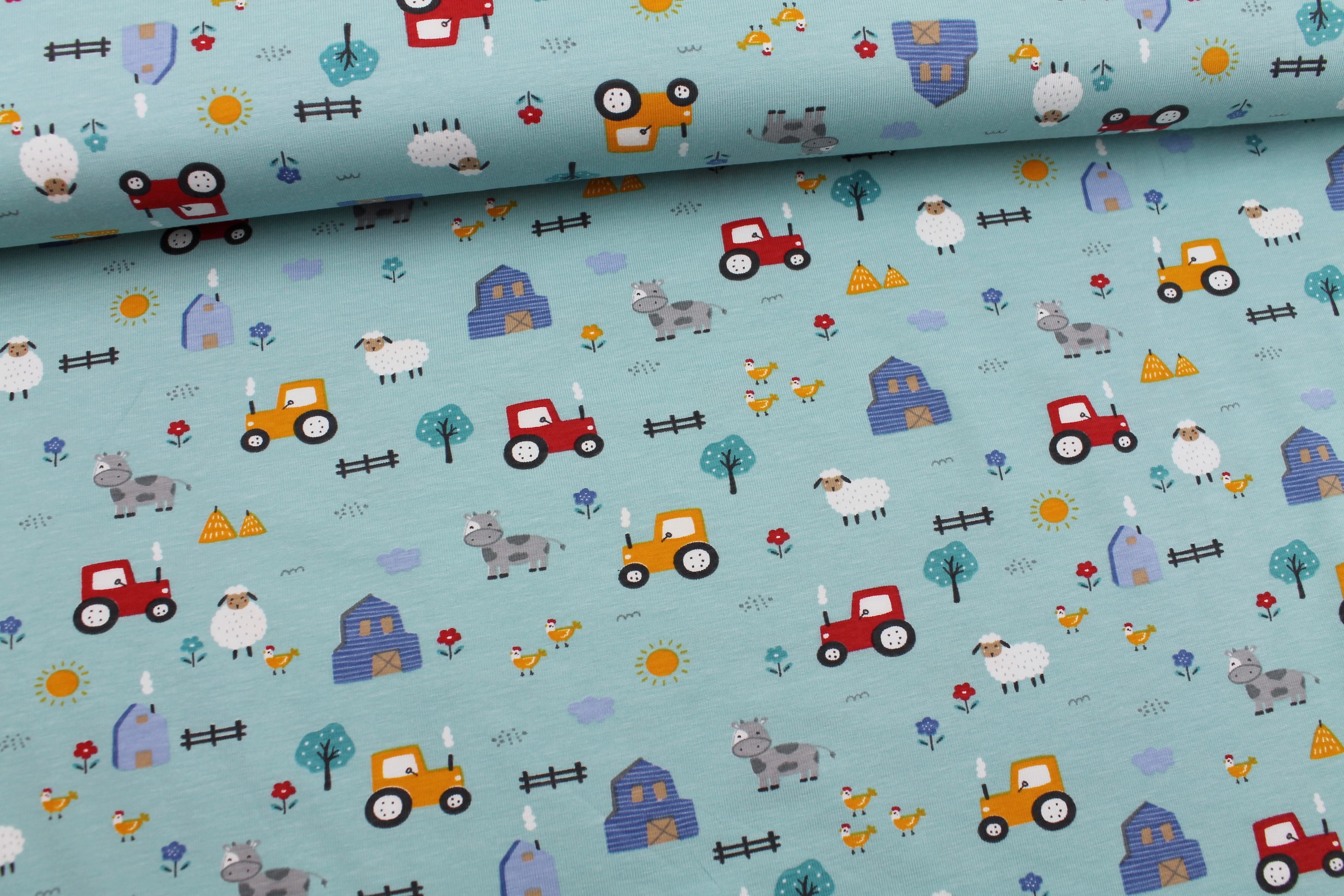 Türkisfarbener Baumwolljersey mit Bauernhofmotiv. Der niedliche Jersey eignet sich besonders gut um Babykleidung zu nähen. Material: 95% Baumwolle, 5% Elasthan Breite: 150cm Gewicht: 200g/m² Ökotex 100 Standard