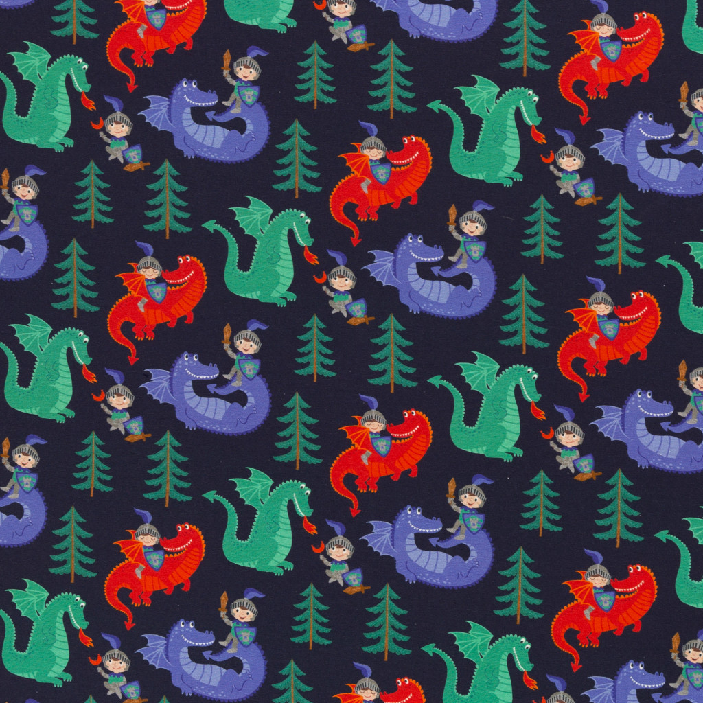 Hochwertiger Baumwolljersey in nachtblau mit bunten Drachen und kleinen Drachenreitern. Design von Sandra Kretzmann für Swafing.