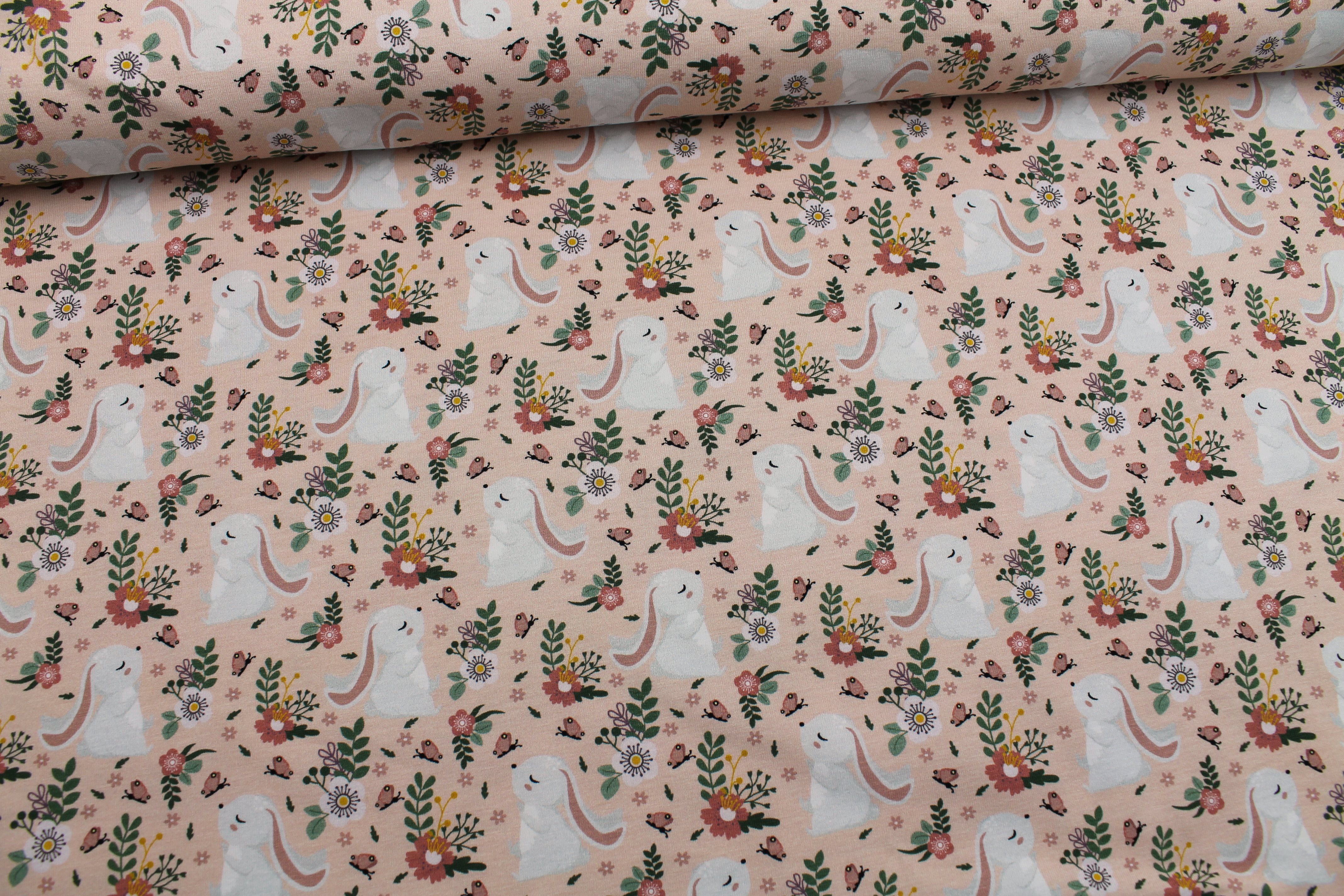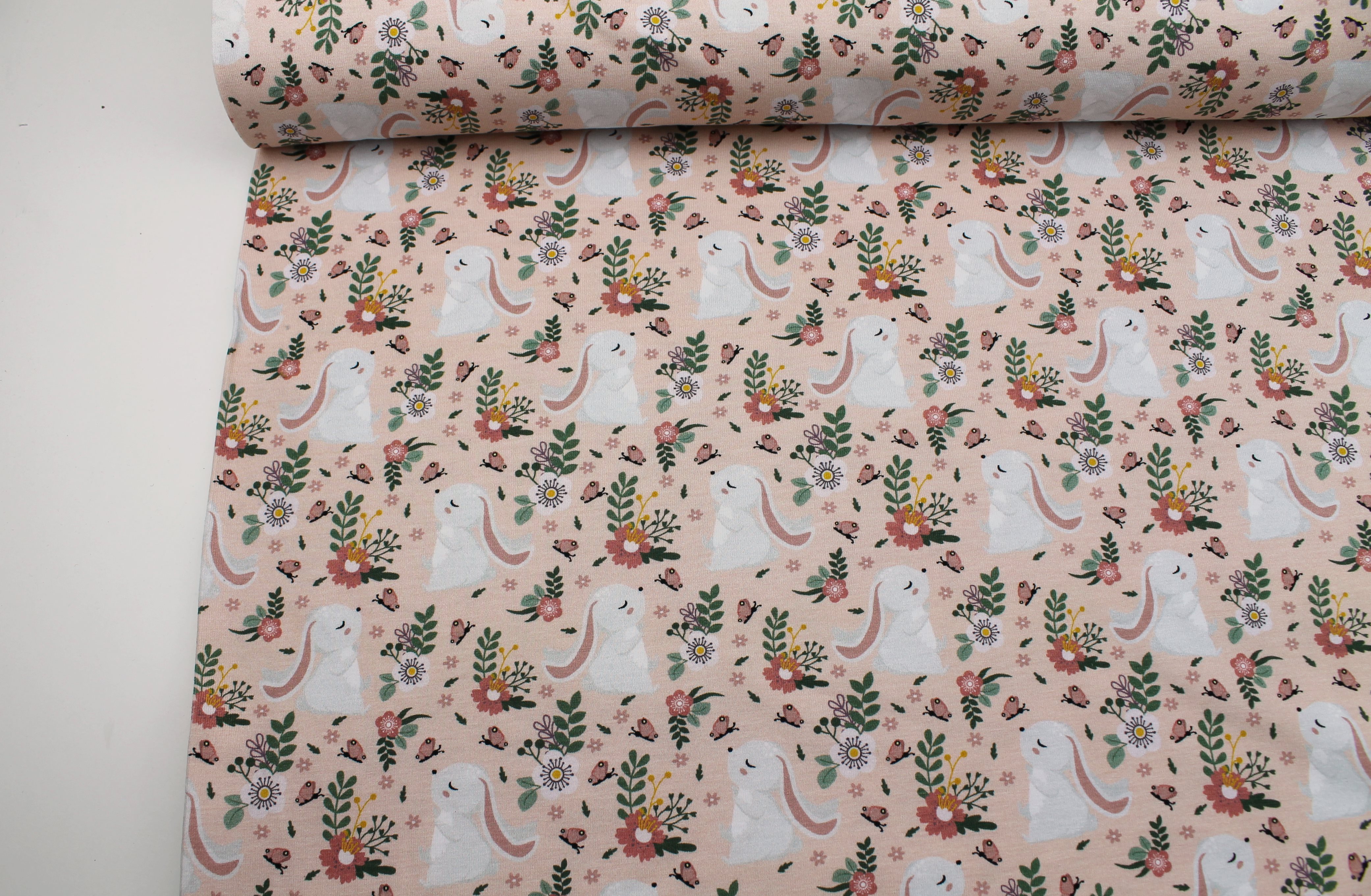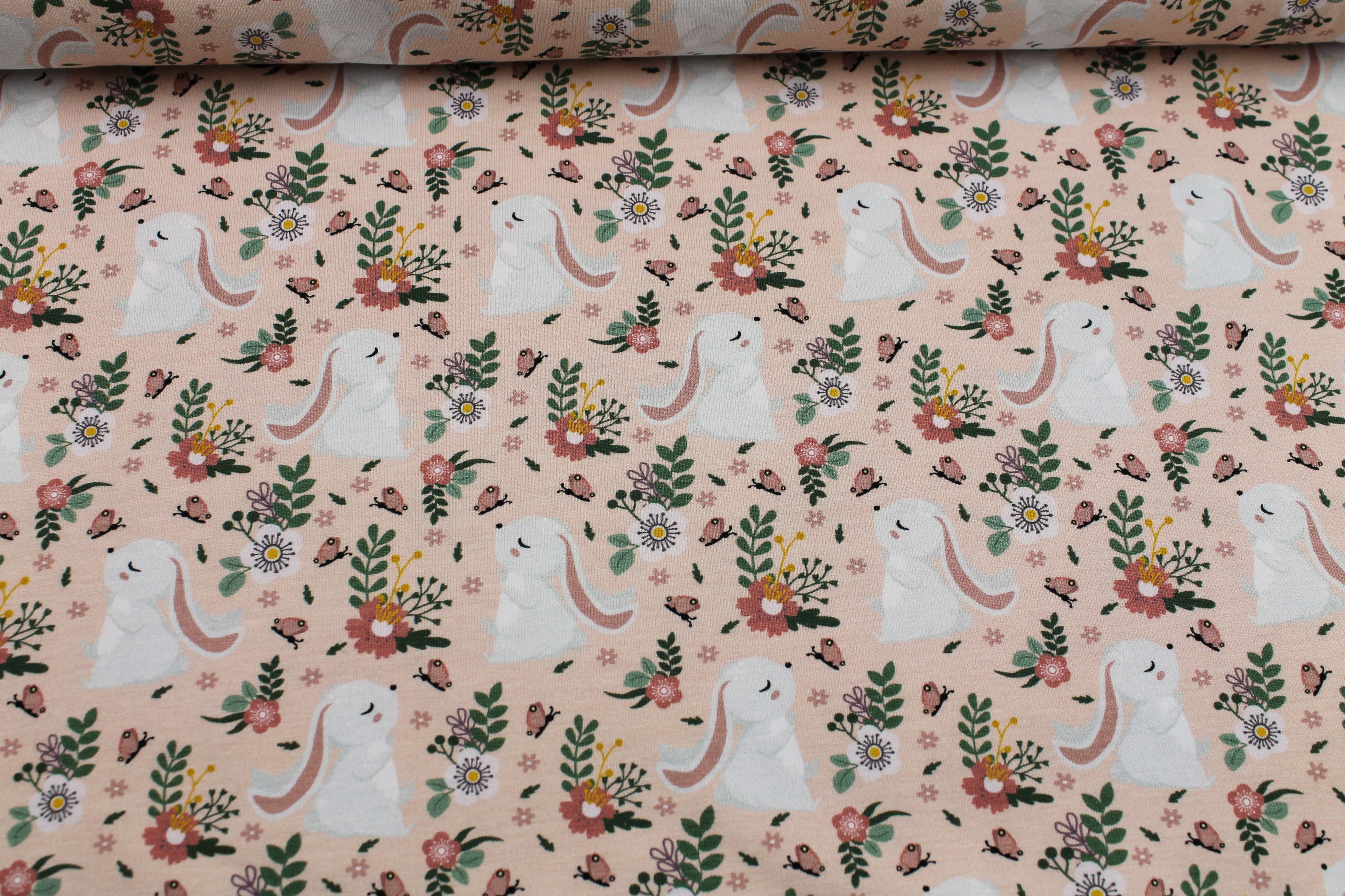 Hochwertiger Baumwolljersey in lachs oder apricot mit kleinen Häschen. Material: 95% Baumwolle, 5% Elasthan Breite: 150cm Gewicht: 290g/lfm Ökotex Standard 100