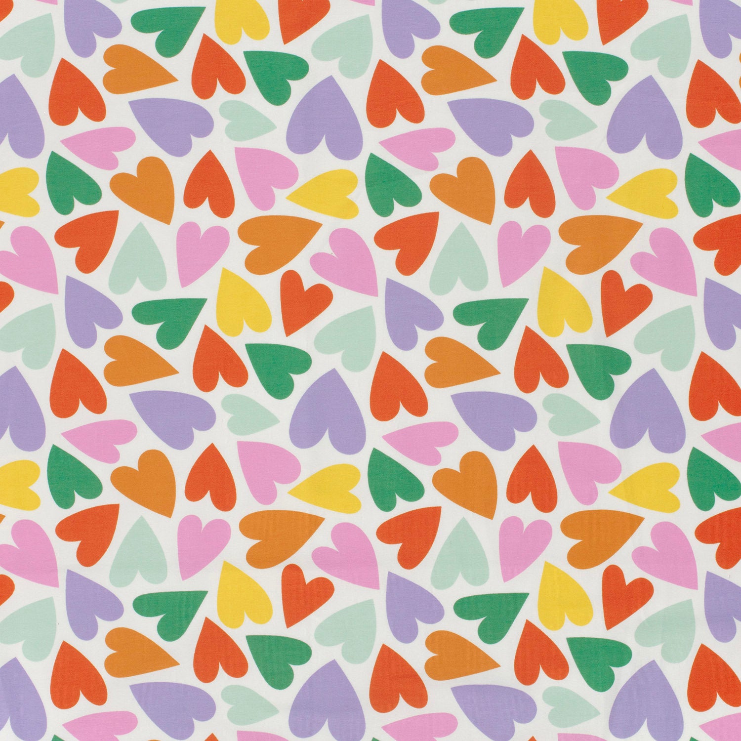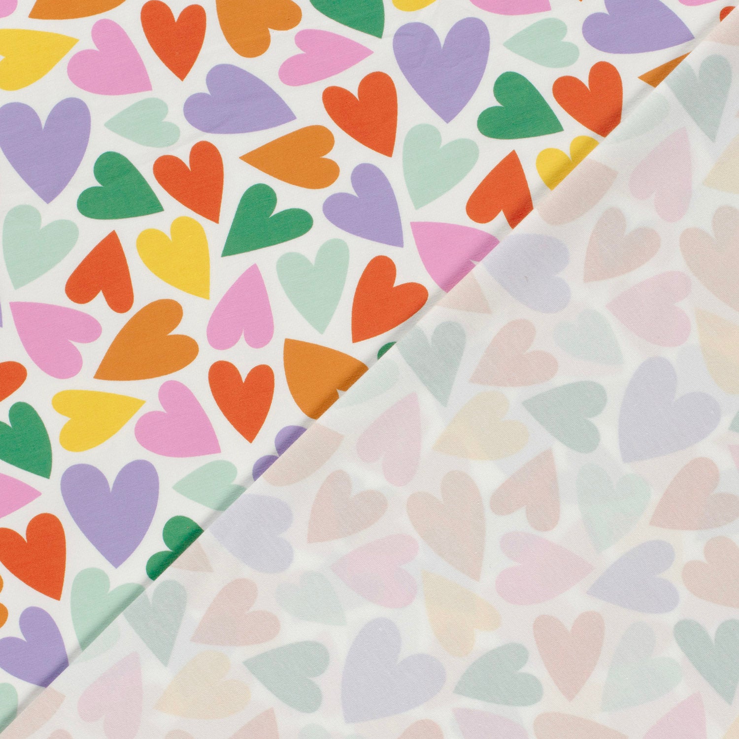 Hochwertiger Baumwolljersey in ecru mit bunten Herzen in grün, flieder, rosa, gelb, orange, rot und weiteren Farben. Material: 95% Baumwolle, 5% Elasthan Breite: 150cm Gewicht: 200gr/m² Ökotex Standard 100