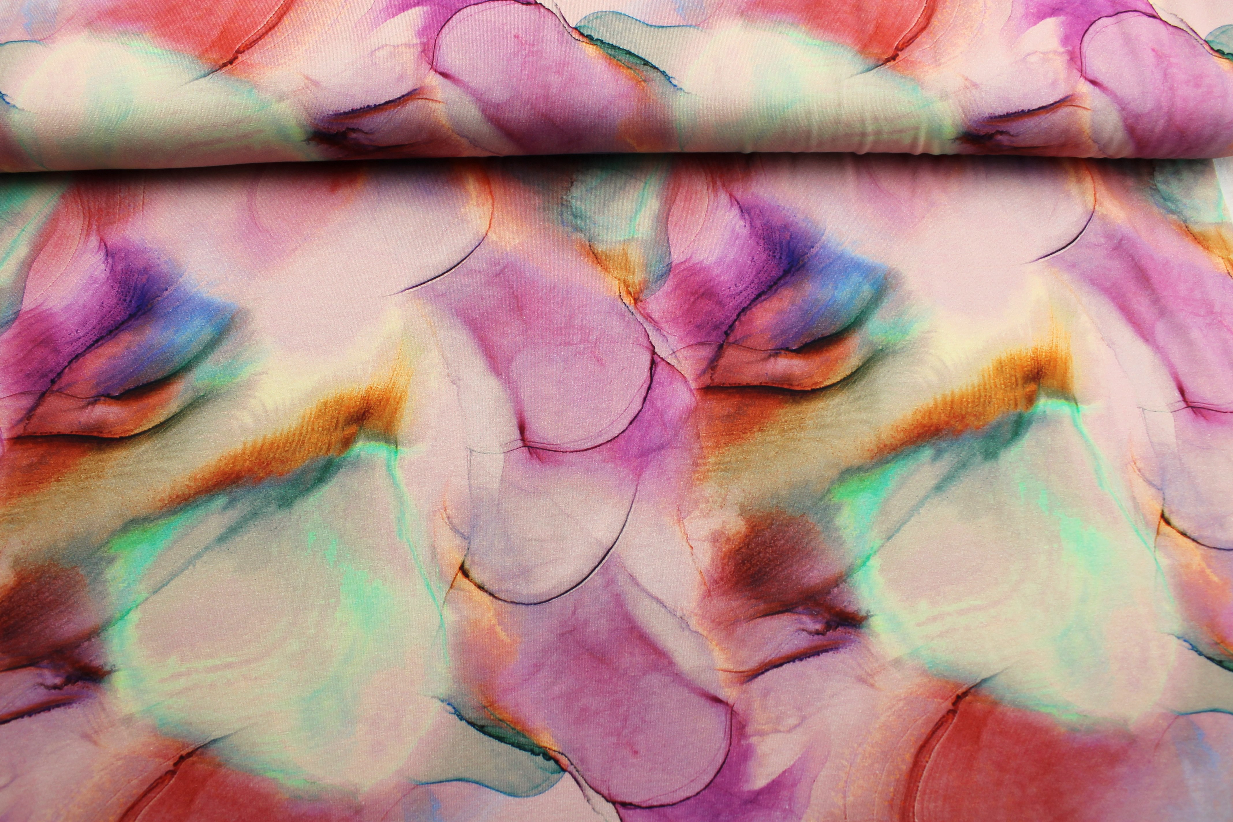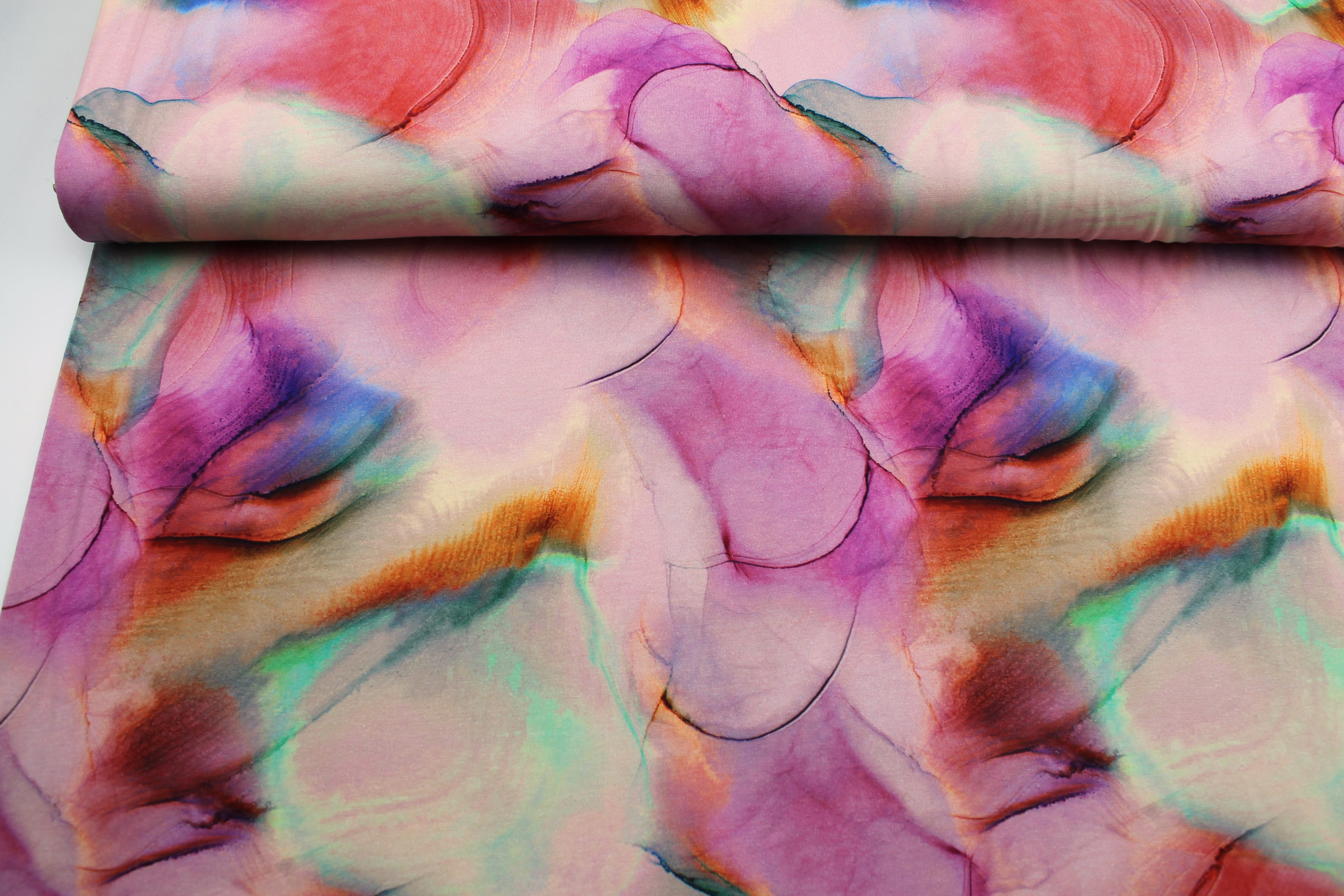 Hochwertiger Baumwolljersey mit marmoriertem Farbverlauf. Die Hauptfarbe bewegt sich im Bereich rosa und pink. Es fließen aber auch lila, grün und weitere Farben mit ein.