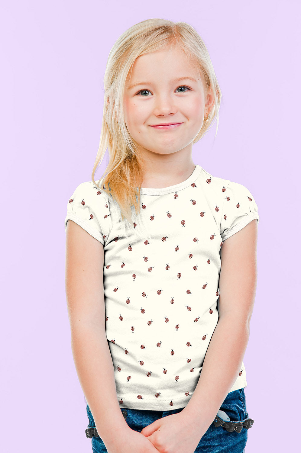 Hochwertiger, weicher Baumwolljersey in ecru mit kleinen niedlichen Marienkäfern. Material: 95% Baumwolle, 5% Elasthan Breite: 150cm Gewicht: 200gr/m² Ökotex Standard 100