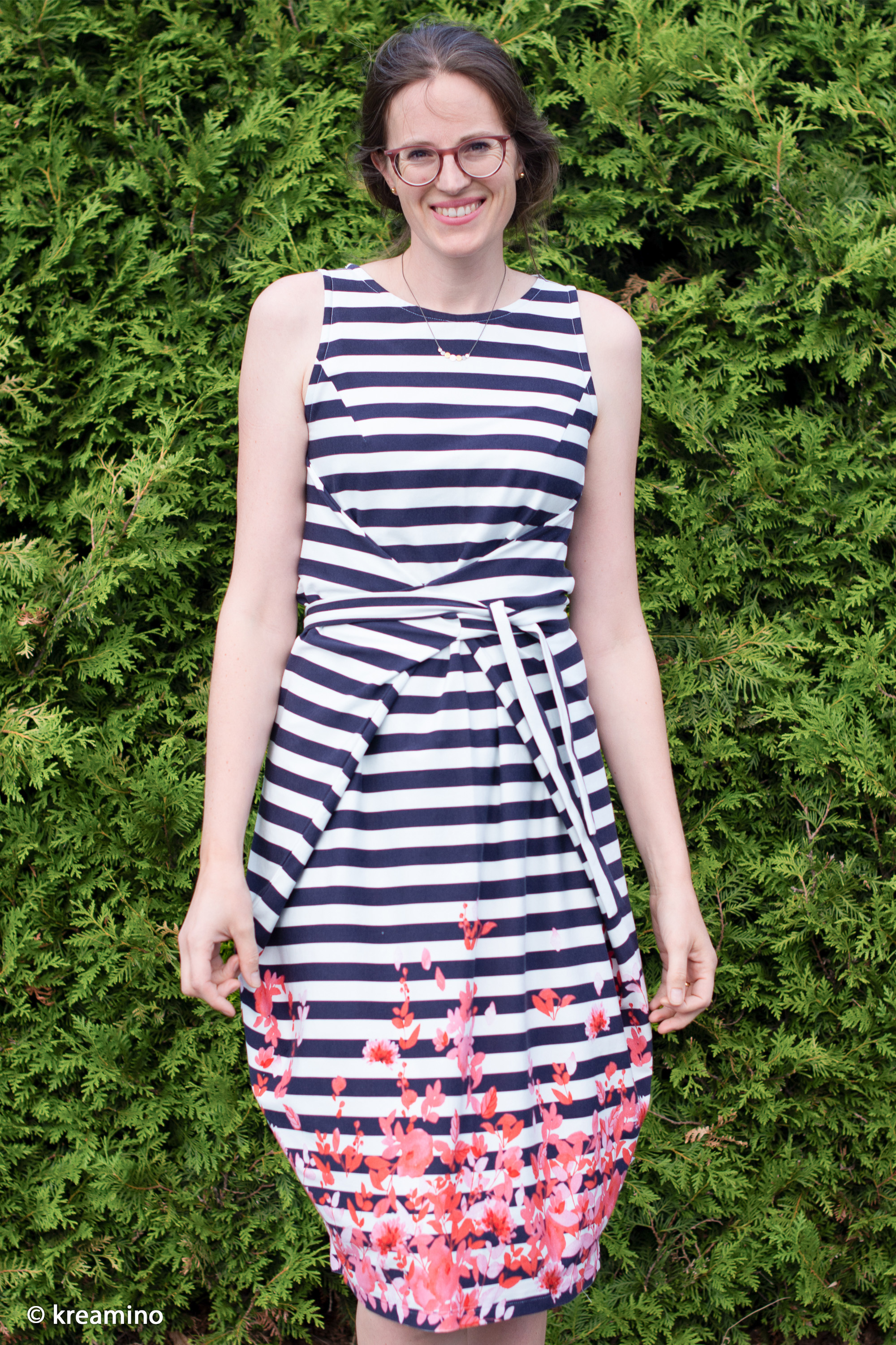 Hochwertiger Jersey mit weißen und marinefarbenen Streifen. Das korallefarbene Blumenmotiv ziert den Stoff entlang der Webkante. Der tolle Baumwolljersey Madrid stammt aus der aktuellen Frühjahr-/ Sommerkollektion von Swafing.