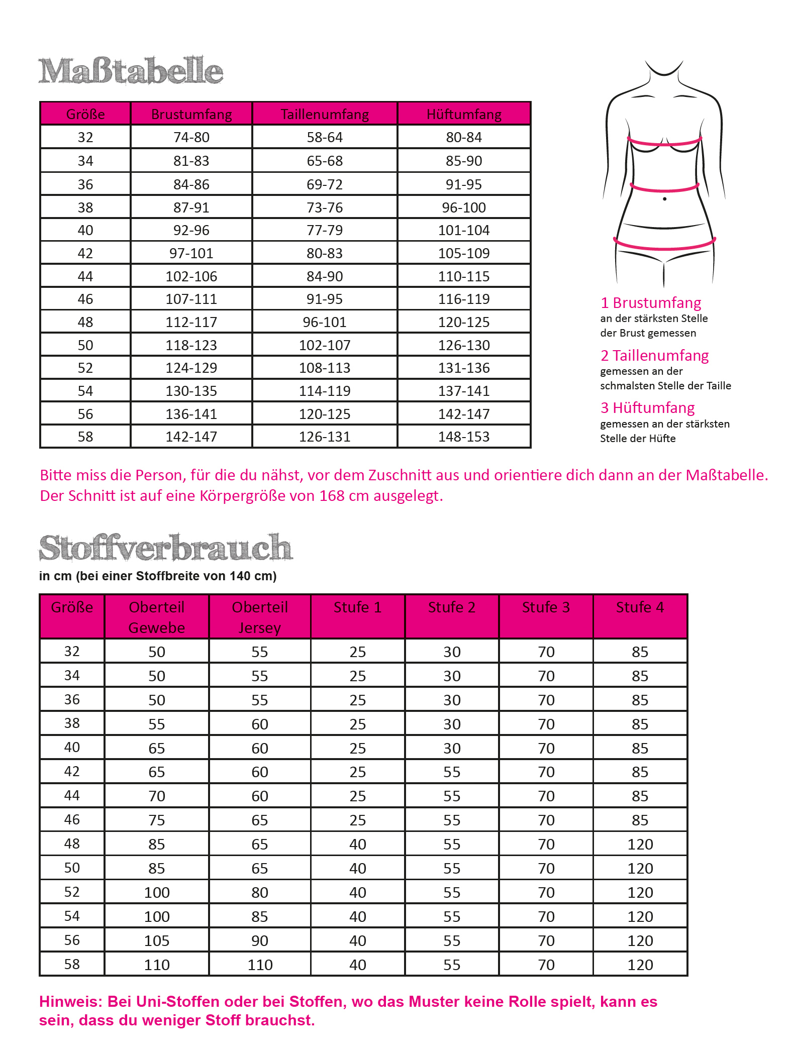Fiona ist ein leichtes Sommerkleid, das luftig deine Beine umspielt. Du entscheidest selbst, ob du dein neues Lieblingskleid bodenlang nähen möchtest oder ob es über dem Knie enden soll. Als Material eignen sich sowohl elastische als auch unelastische Stoffe.