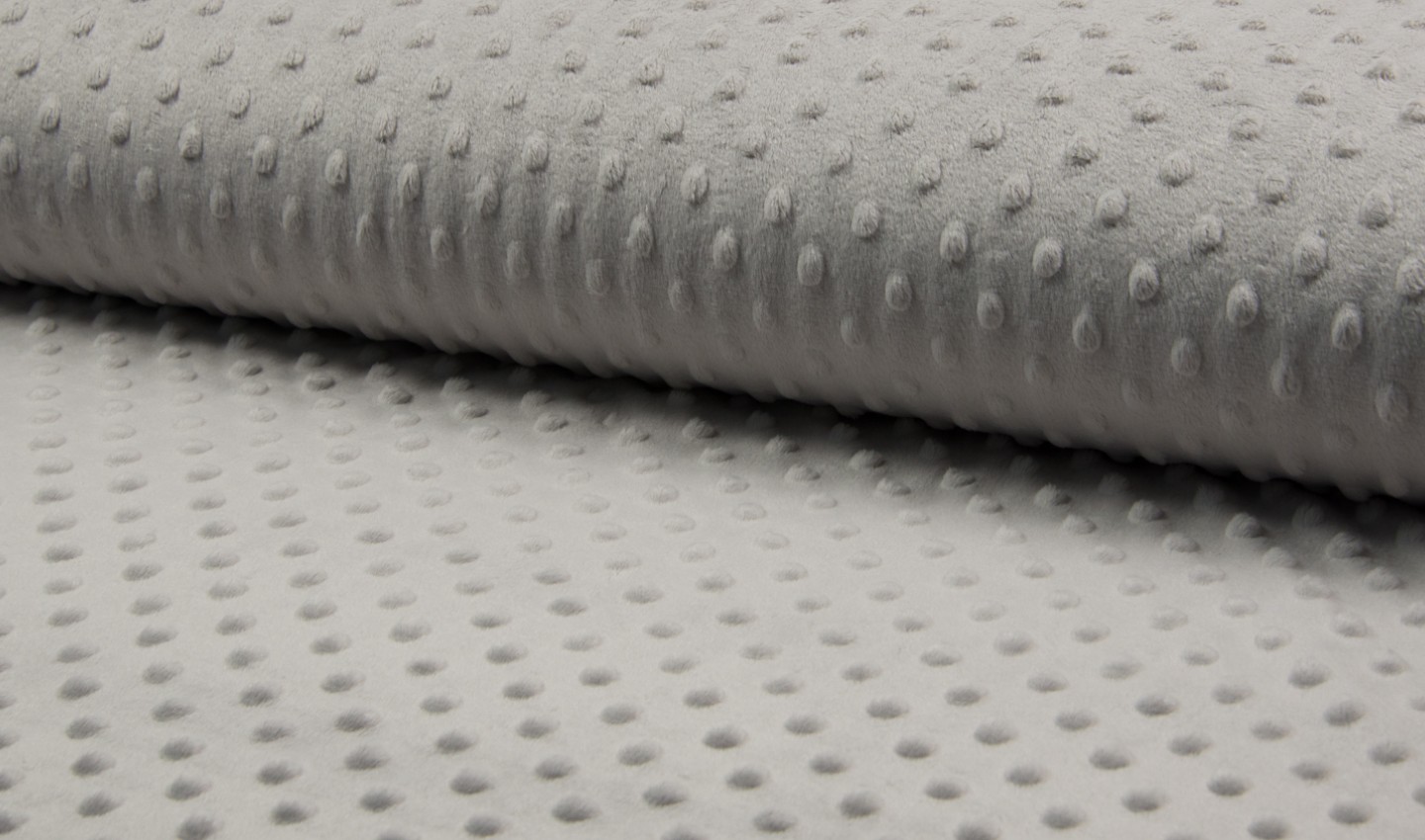 Kuschelig weiches Microfleece in hellgrau mit Noppen. Minky kann zum Nähen von Kleidung, zum Füttern von Mützen oder ganz einfach gesäumt als Kuscheldecke verwendet werden.