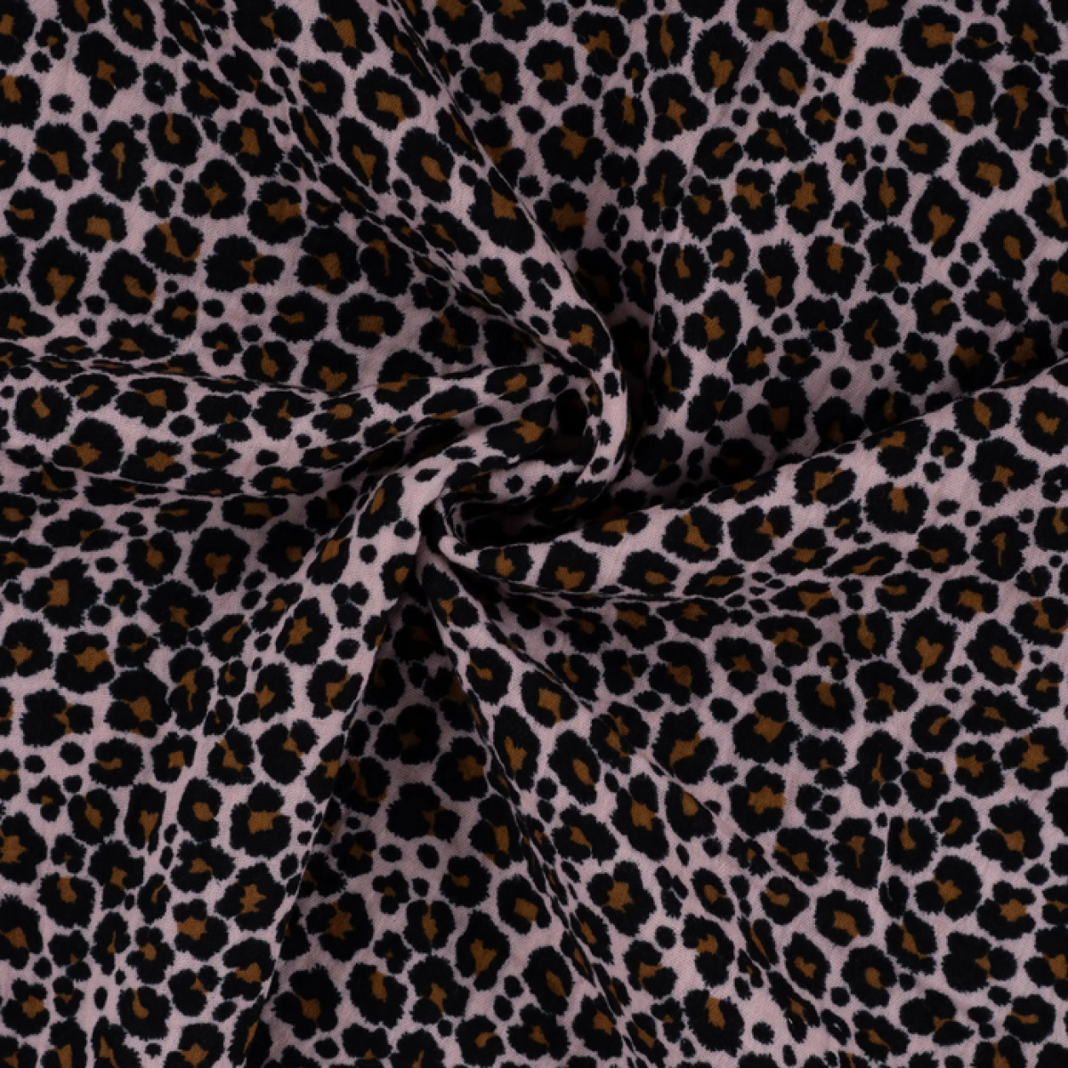 Modische Musselin Stoff in einem pudrigen rosa mit schwarz-braunem Leomuster. Aus dem leichten Musselin kannst du tolle Tücher oder Bekleidung nähen. Material: 100% Baumwolle Stoffbreite: 135 cm Gewicht: 130g/m²
