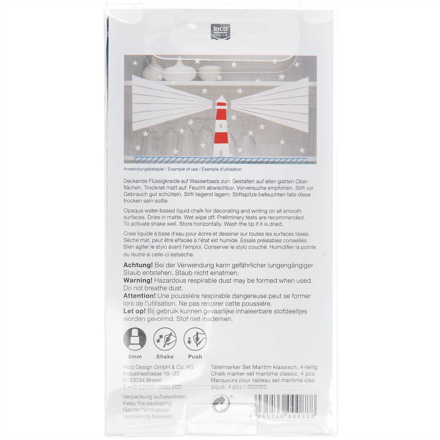 - flüssige Kreide auf Wasserbasis in 4 maritimen Farben: Rot, Weiß, Blau und Schwarz