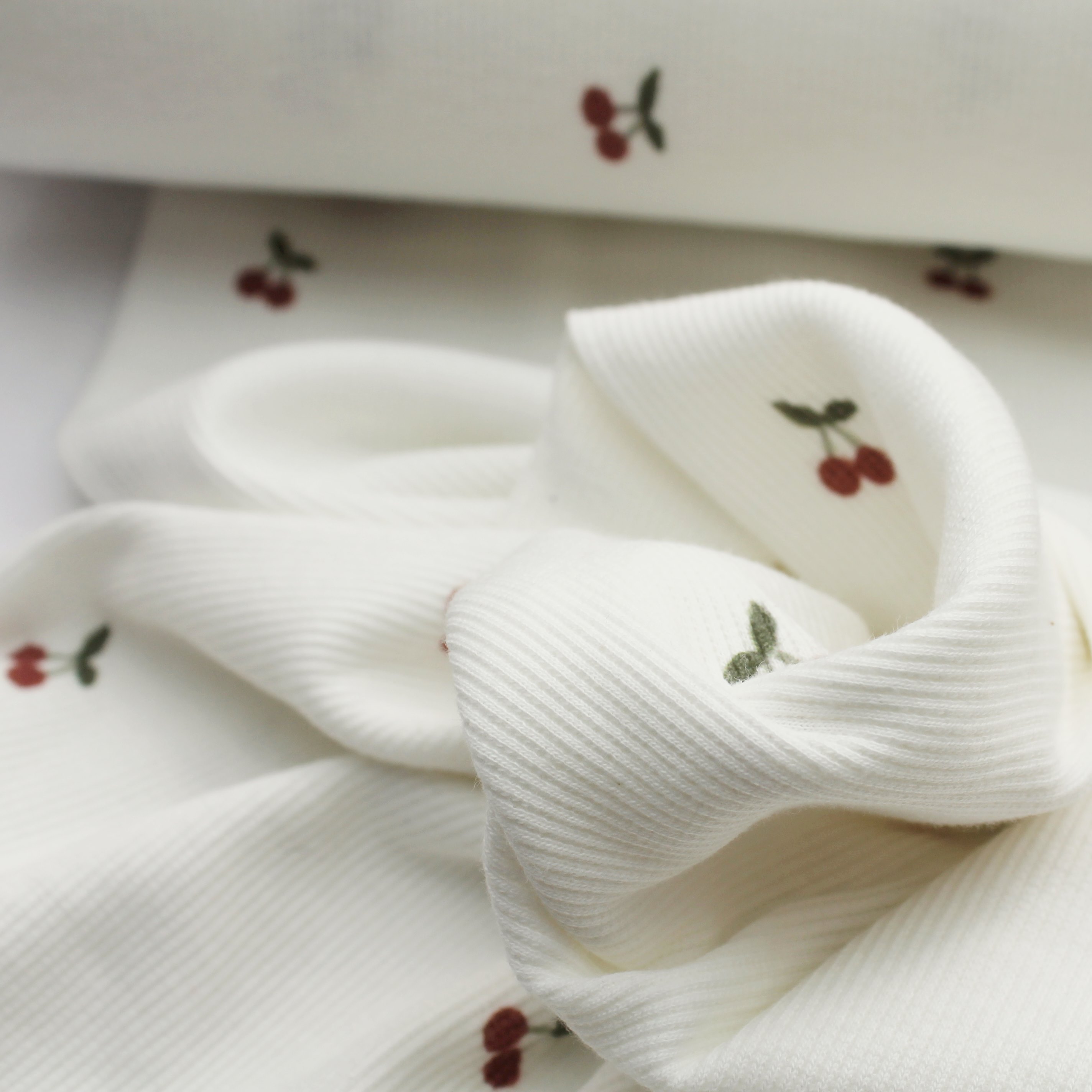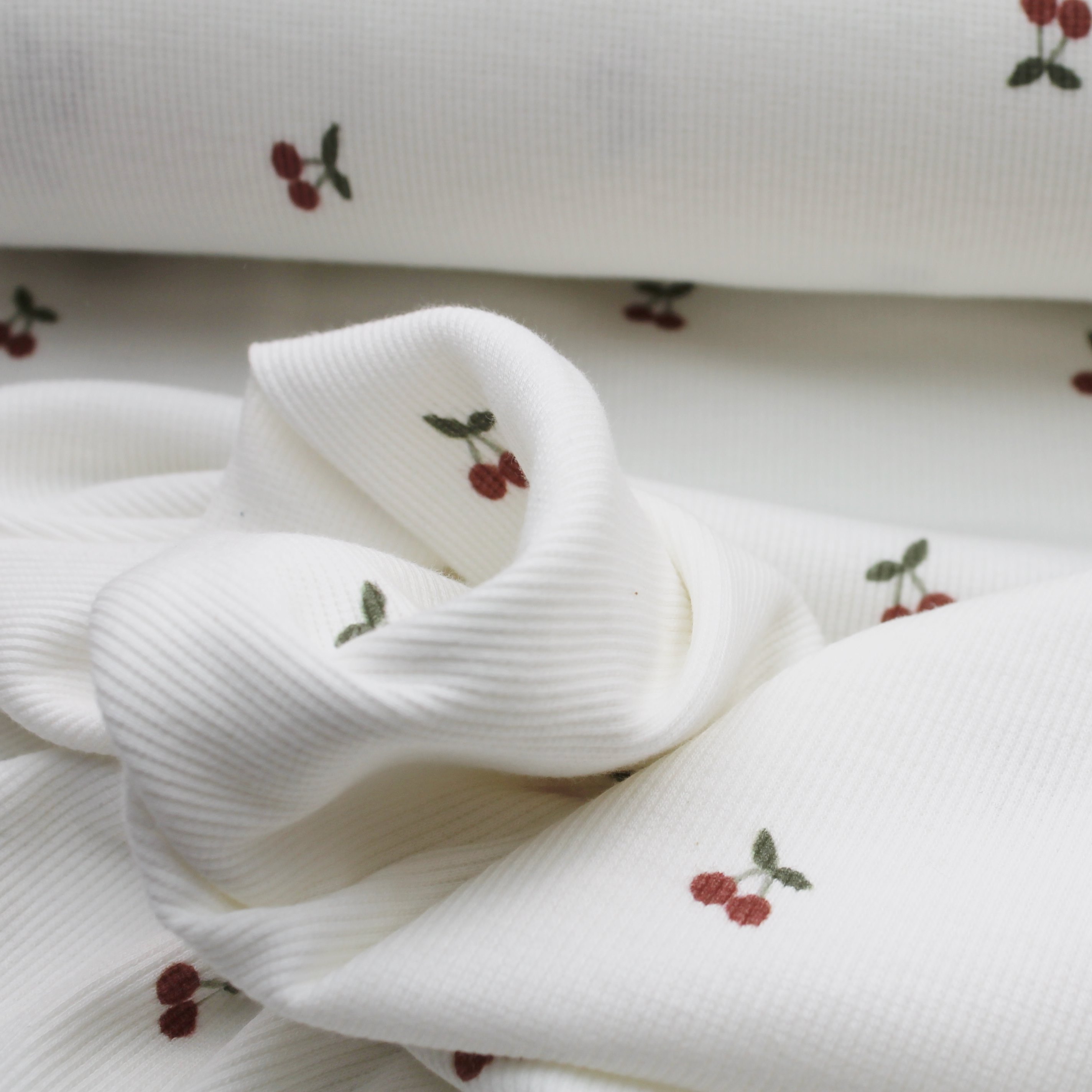 Rippjersey in Cremefarben mit kleinen niedlichen Kirschen. Rippjersey ist ein trendiger, sehr dehnbarer Stoff. Achte beim Nähen darauf, dass dein Schnittmuster extra auf Rippjersey ausgelegt ist, sonst kann es passieren, dass dein fertiges Kleidungsstück zu groß sein wird.
