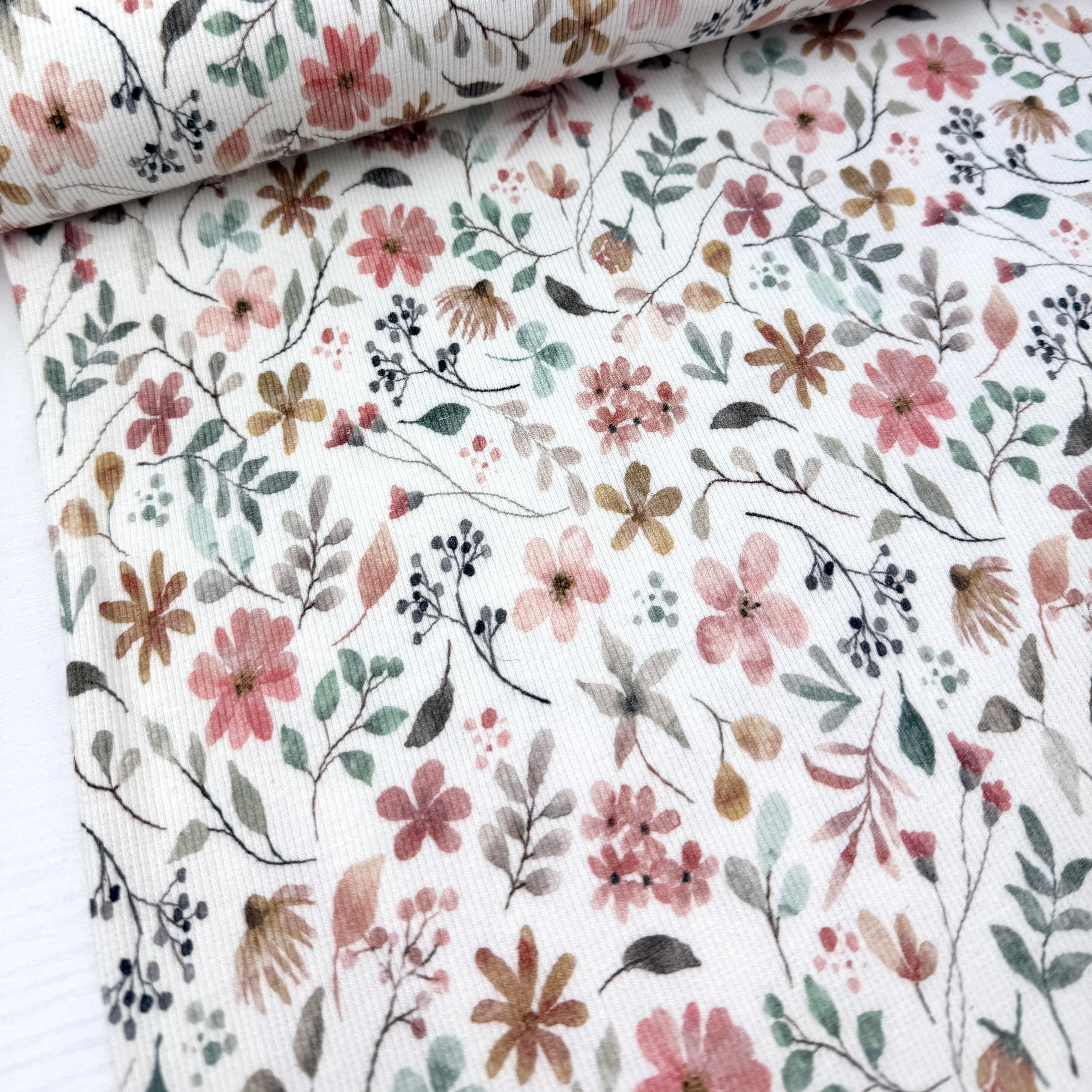 Rippjersey in ecru mit kleinen niedlichen Blumen in zarten Nude Tönen und hübschem salbeigrün. Rippjersey ist ein trendiger, sehr dehnbarer Stoff. Achte beim Nähen darauf, dass dein Schnittmuster extra auf Rippjersey ausgelegt ist, sonst kann es passieren, dass dein fertiges Kleidungsstück zu groß sein wird.