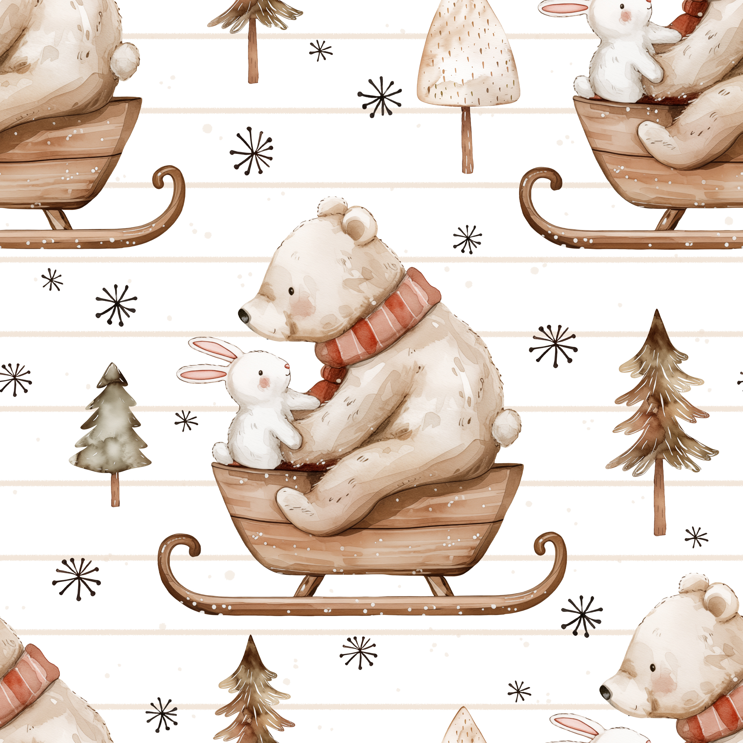 Bär und Hase gemeinsam bei einer weihnachtlichen Schlittenfahrt.