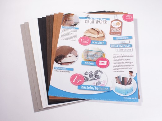 Enthalten sind je Farbe (weiß, schwarz, hellbraun, chocolate und stone) 2 Bögen in Din A 4 Format.