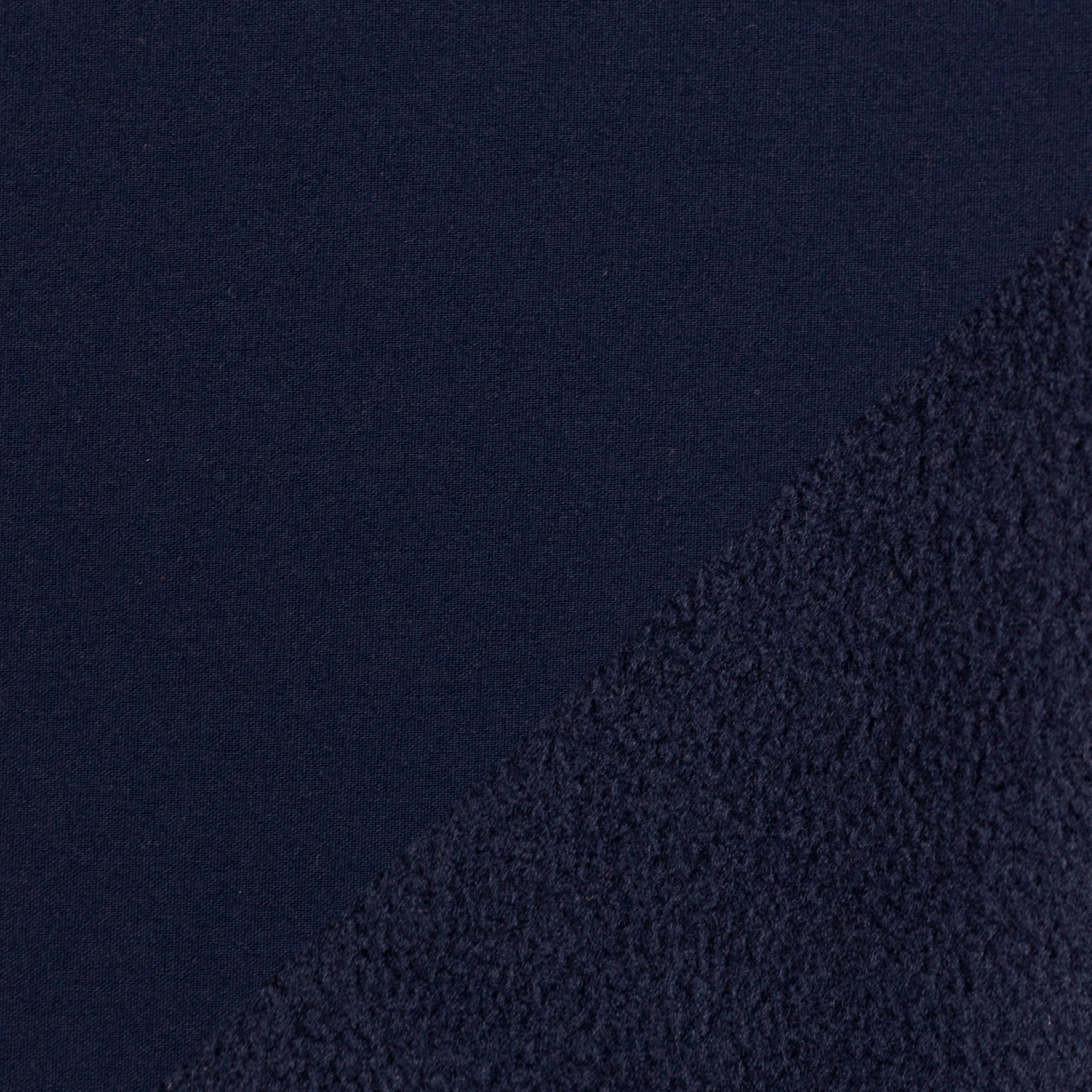 Hochwertiger Softshell in dunkelblau. Softshell ist wasserabweisend und kann sehr gut genutzt werden um Jacken, Kissenbzüge, Hundekissen und vieles mehr zu nähen. Die Innenseite des Stoffes ist aus schwarzem Fleece.
