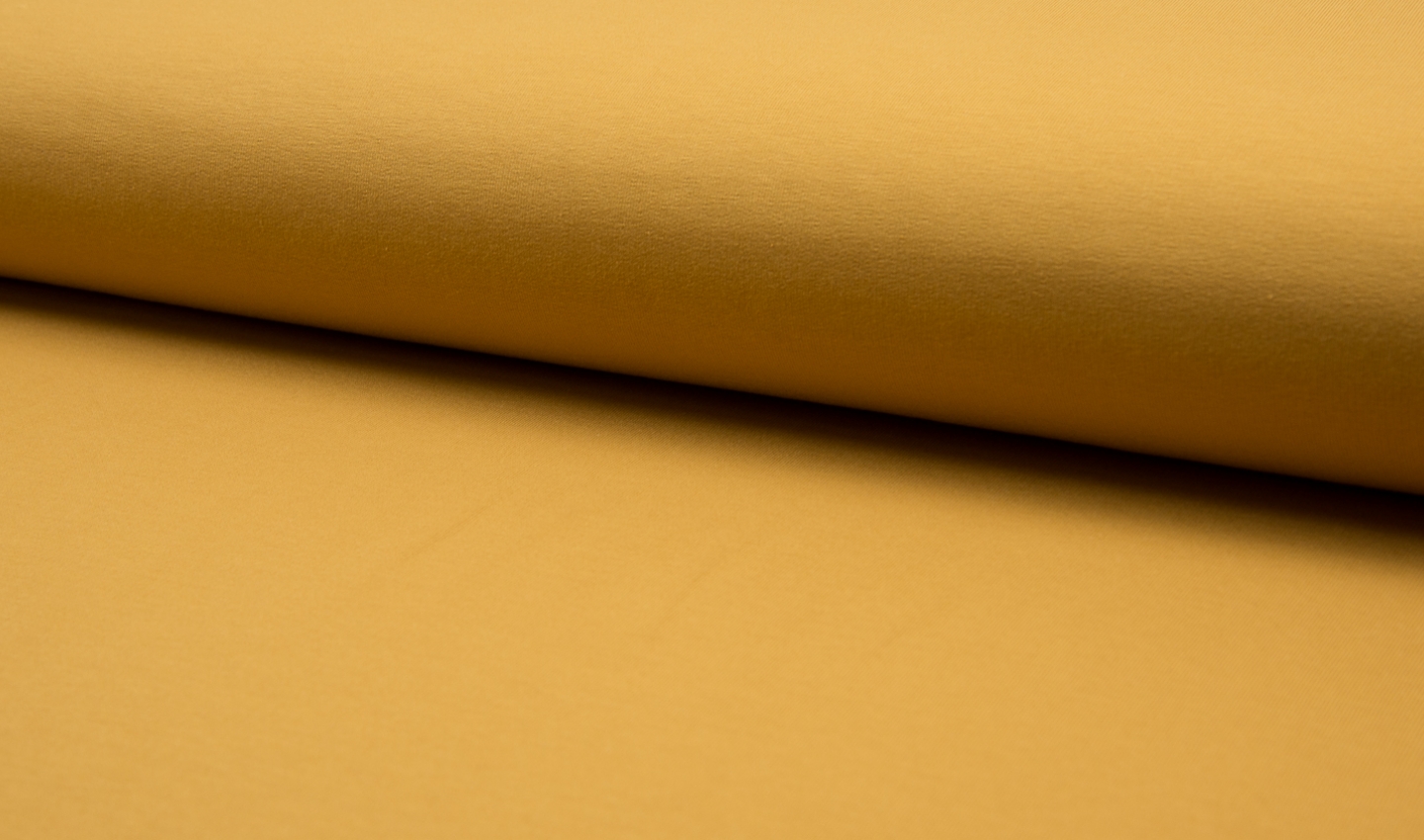 Hochwertiger Sommersweat in der Farbe ocker. Die Rückseite des Stoffes ist nicht angeraut! Der SommerSweat eignet sich hervorragend zum Nähen von Kleidern, Hosen, Oberteilen und Westen.