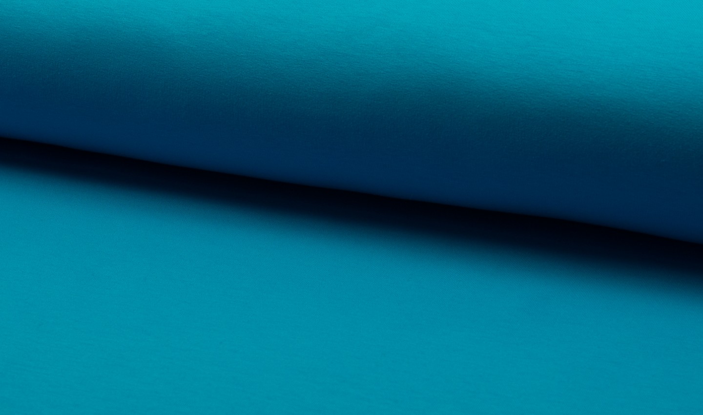 Hochwertiger Sommersweat in der Farbe türkis. Die Rückseite des Stoffes ist nicht angeraut! Der SommerSweat eignet sich hervorragend zum Nähen von Kleidern, Hosen, Oberteilen und Westen.