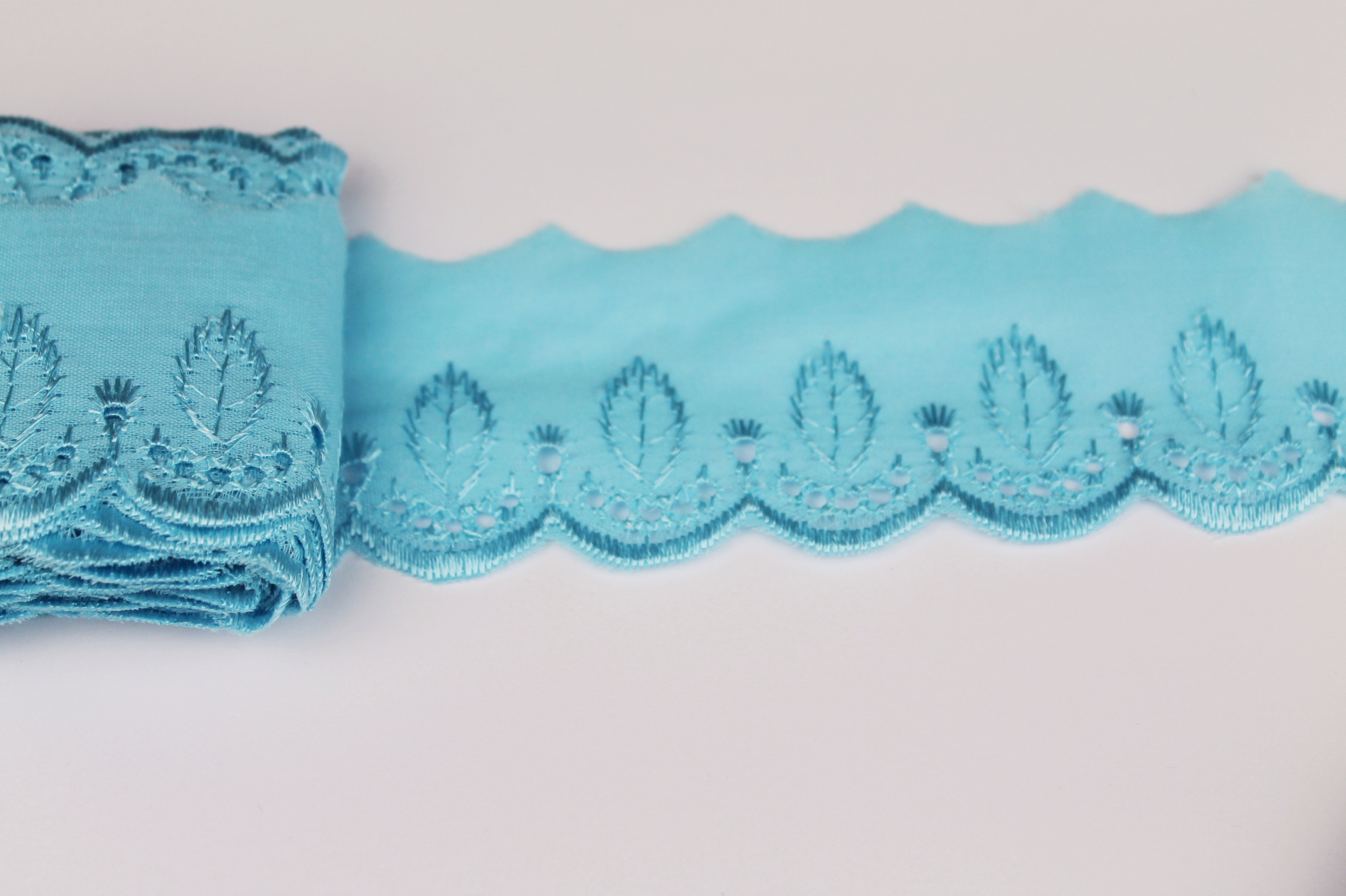 Hochwertige weiße Spitze mit Lochstickerei zum Verzieren von Röcken und Kleidern.