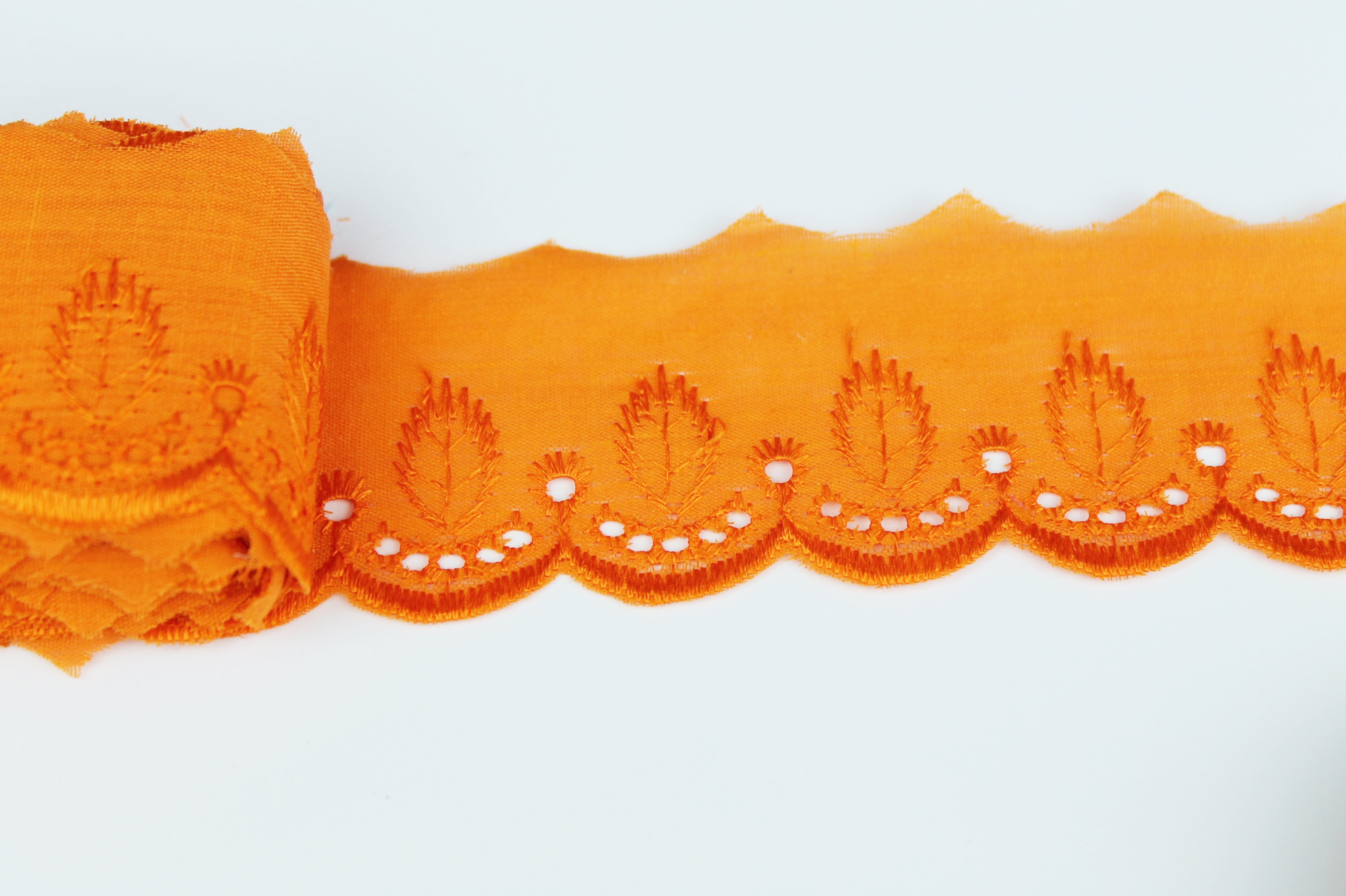 Hochwertige weiße Spitze mit Lochstickerei zum Verzieren von Röcken und Kleidern.