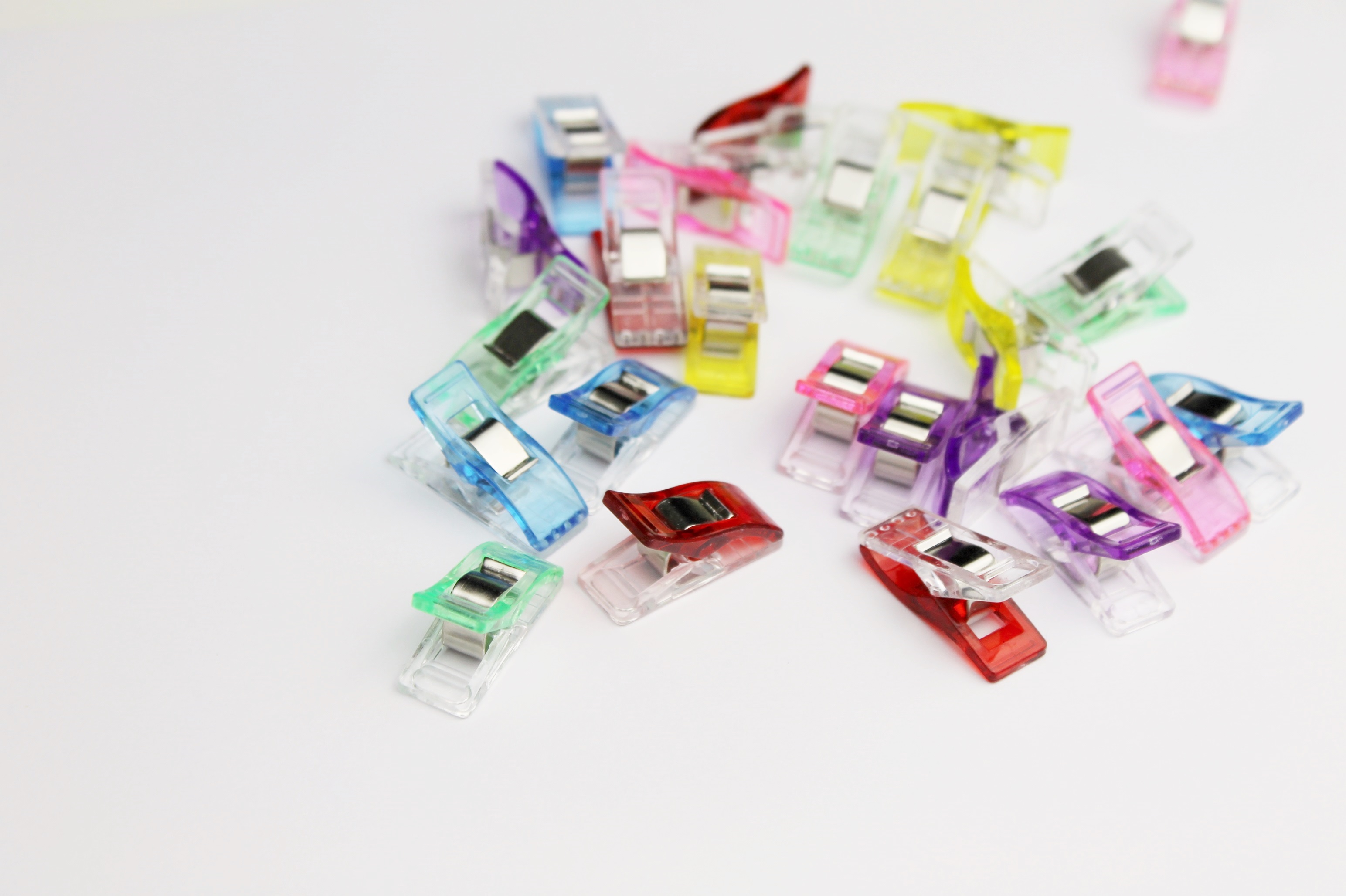 Stoffklammern sind praktische kleine Helferlein um Stoffe zusammenzuheften. Besonders bei Stoffen, in denen man keine Löcher möchte (wie beschichtete Baumwolle, Jersey und Co) sind die Klammern besser geeignet als Stecknadeln.