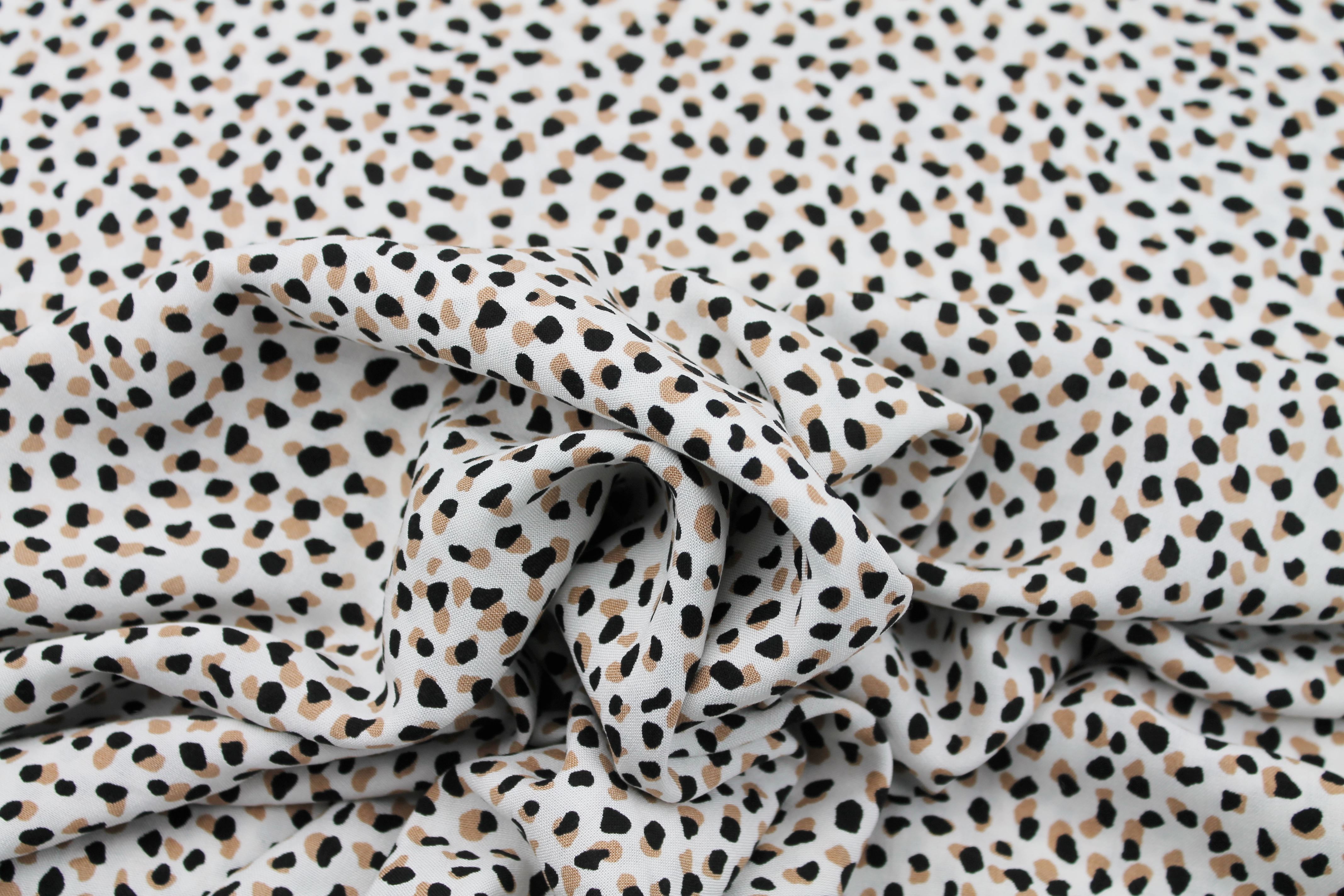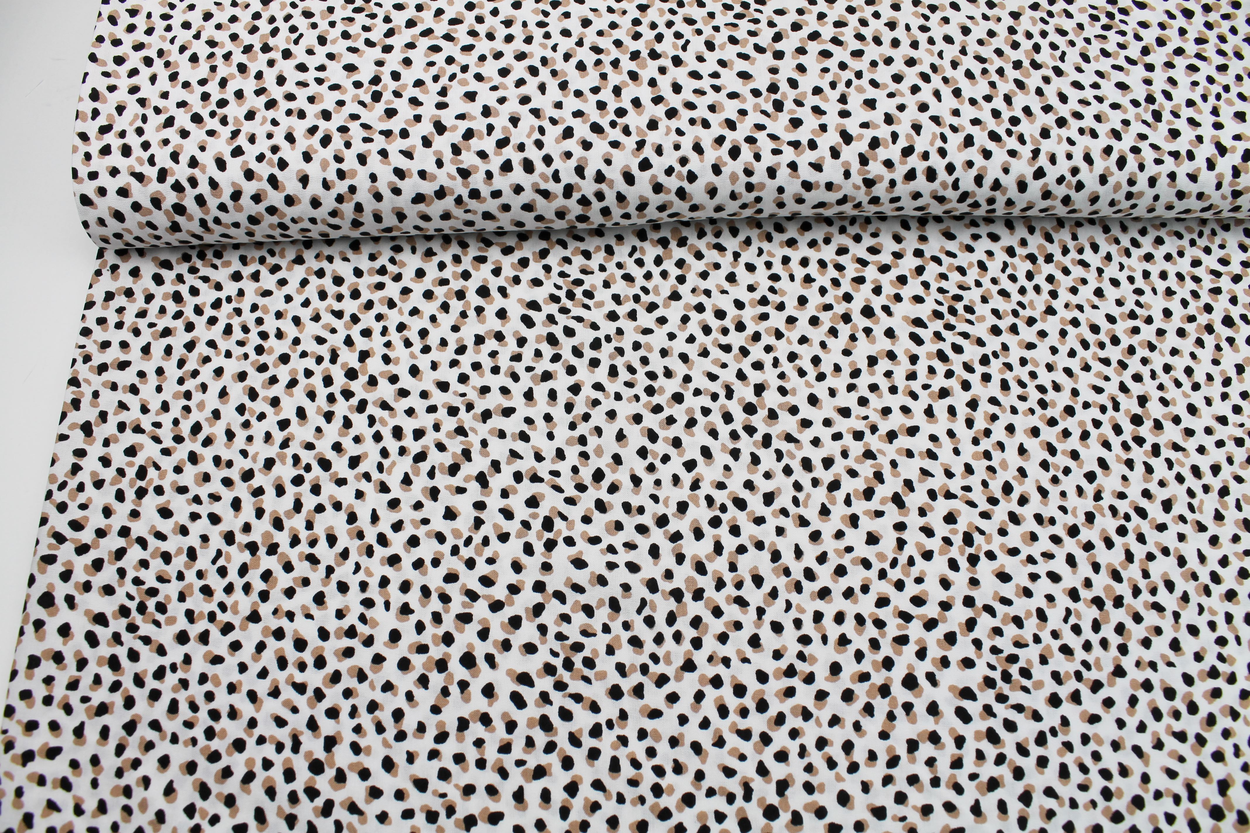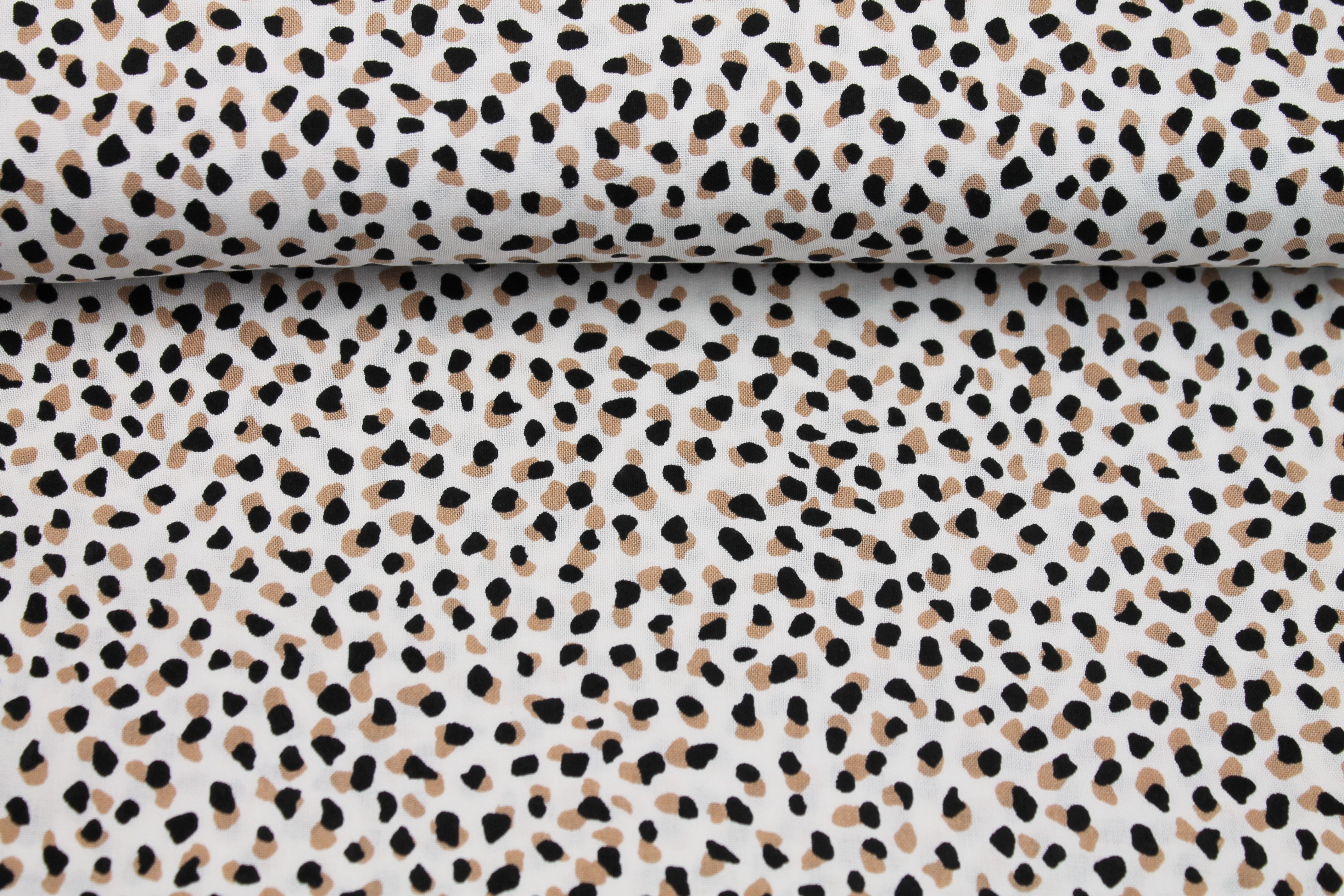 Weich fallender Viskose Twill in weiß mit Punkten in schwarz und braun. Aus Viskose Twill kannst Du tolle Kleider, Blusen, Hemdblusen oder Hosen nähen. Der Stoff fällt weich und fließend und hat etwas mehr Stand als normale Viskose. Viskose Twill ist nicht dehnbar.