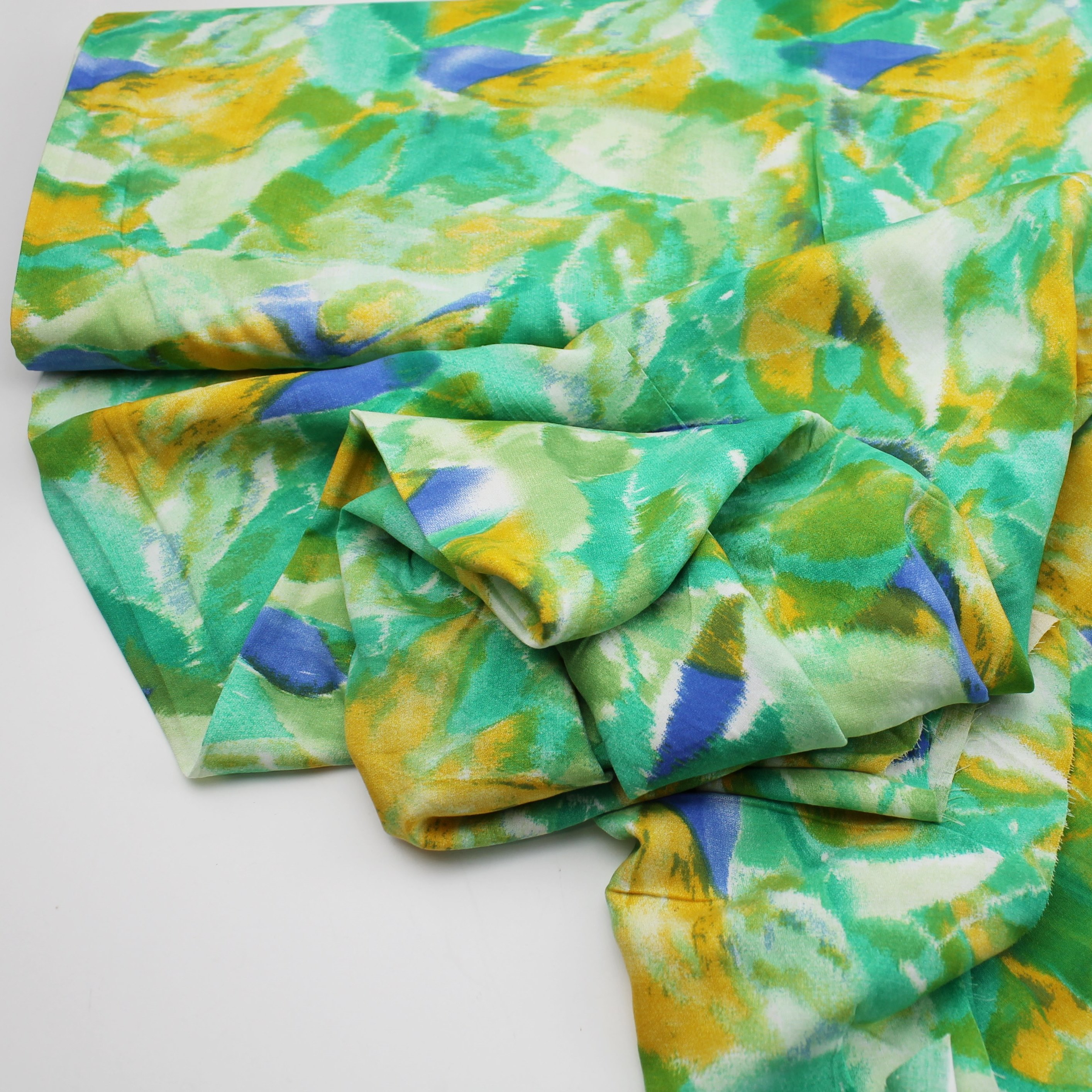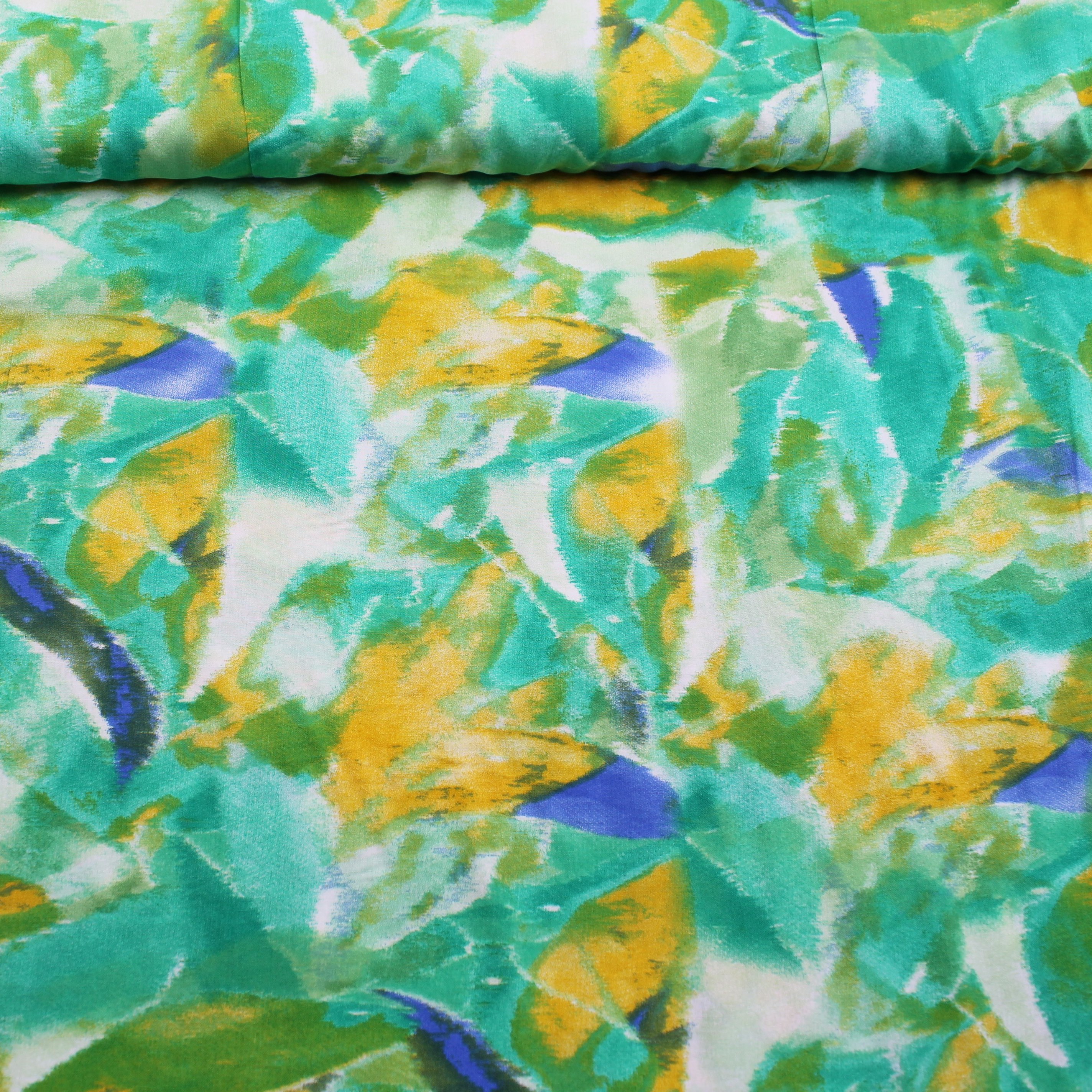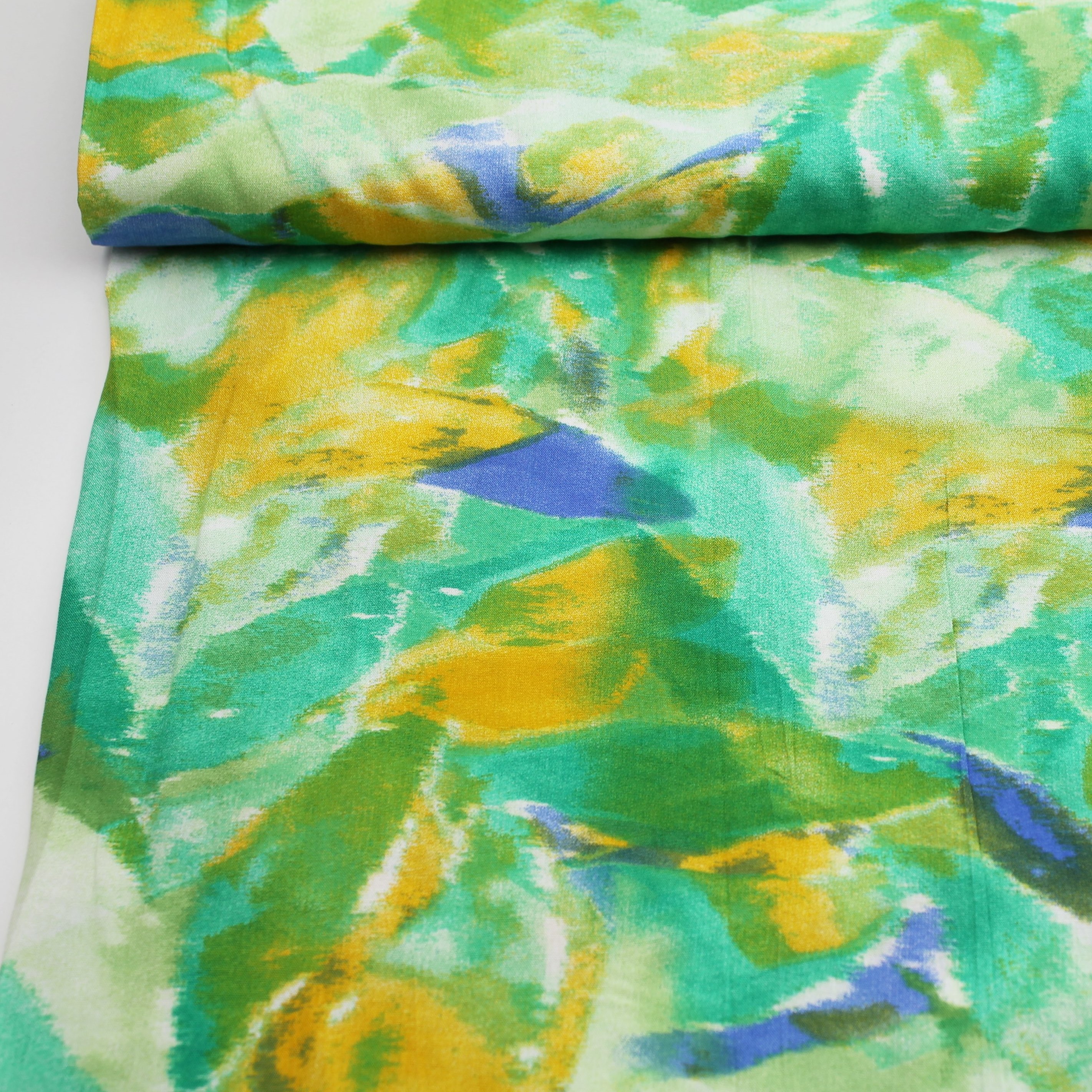 Luftiger Viskosestoff in grün, gelb, blau und weiß. Das große abstraktes Muster ist ein modisches Highligt für leichte Sommerkleider, Hosen, Blusen und Tops. Der Viskosestoff ist nicht dehnbar.
