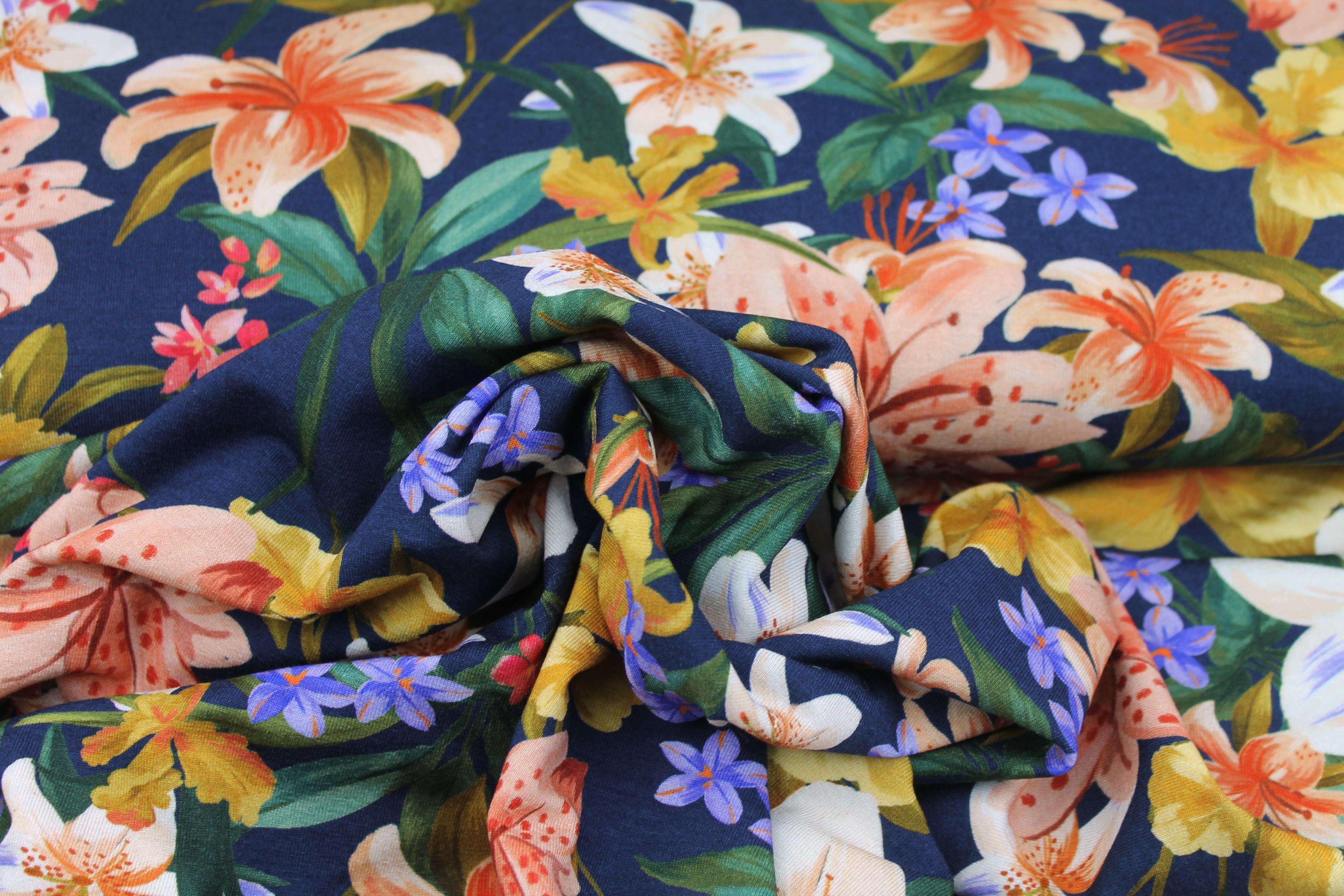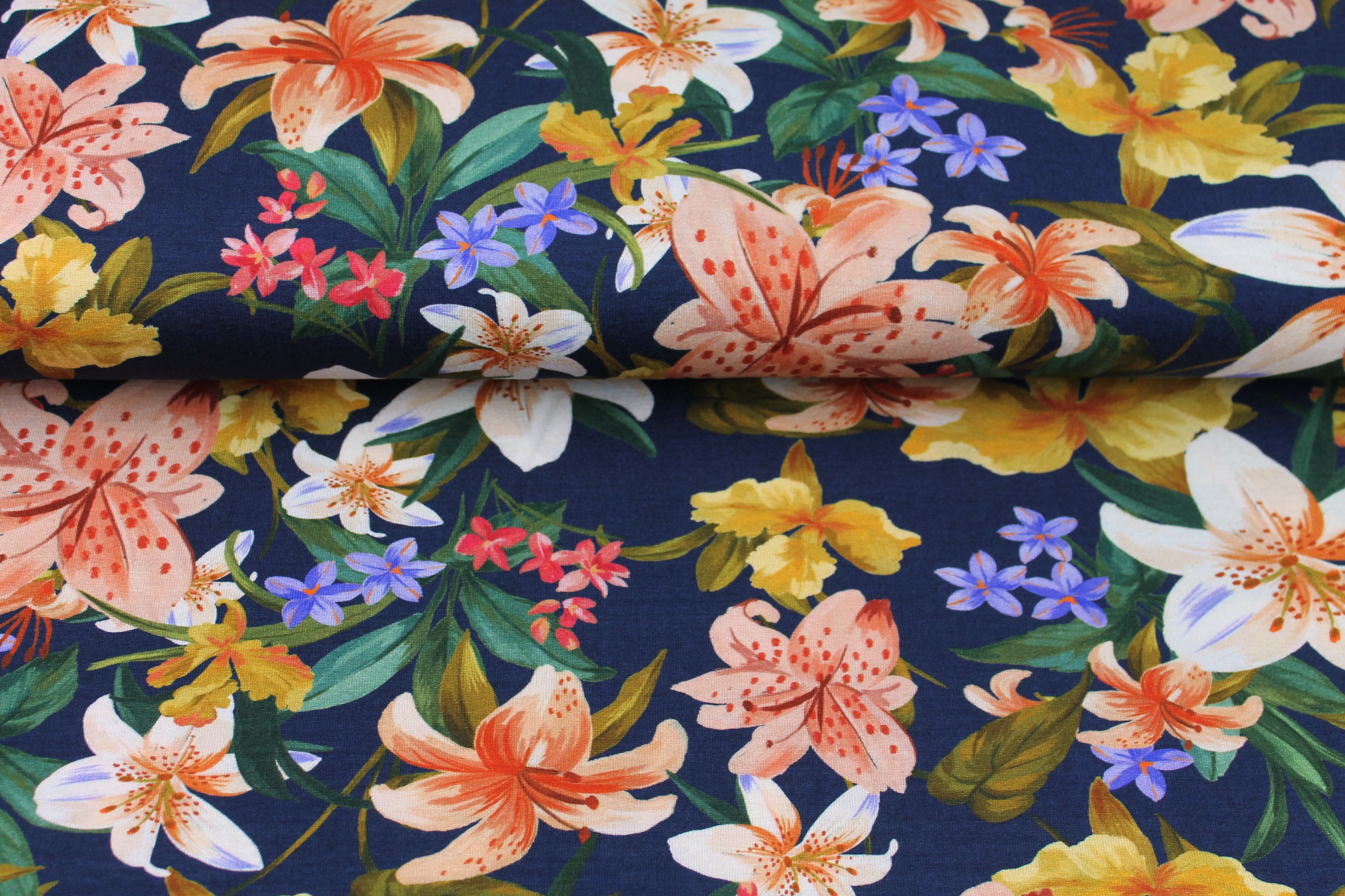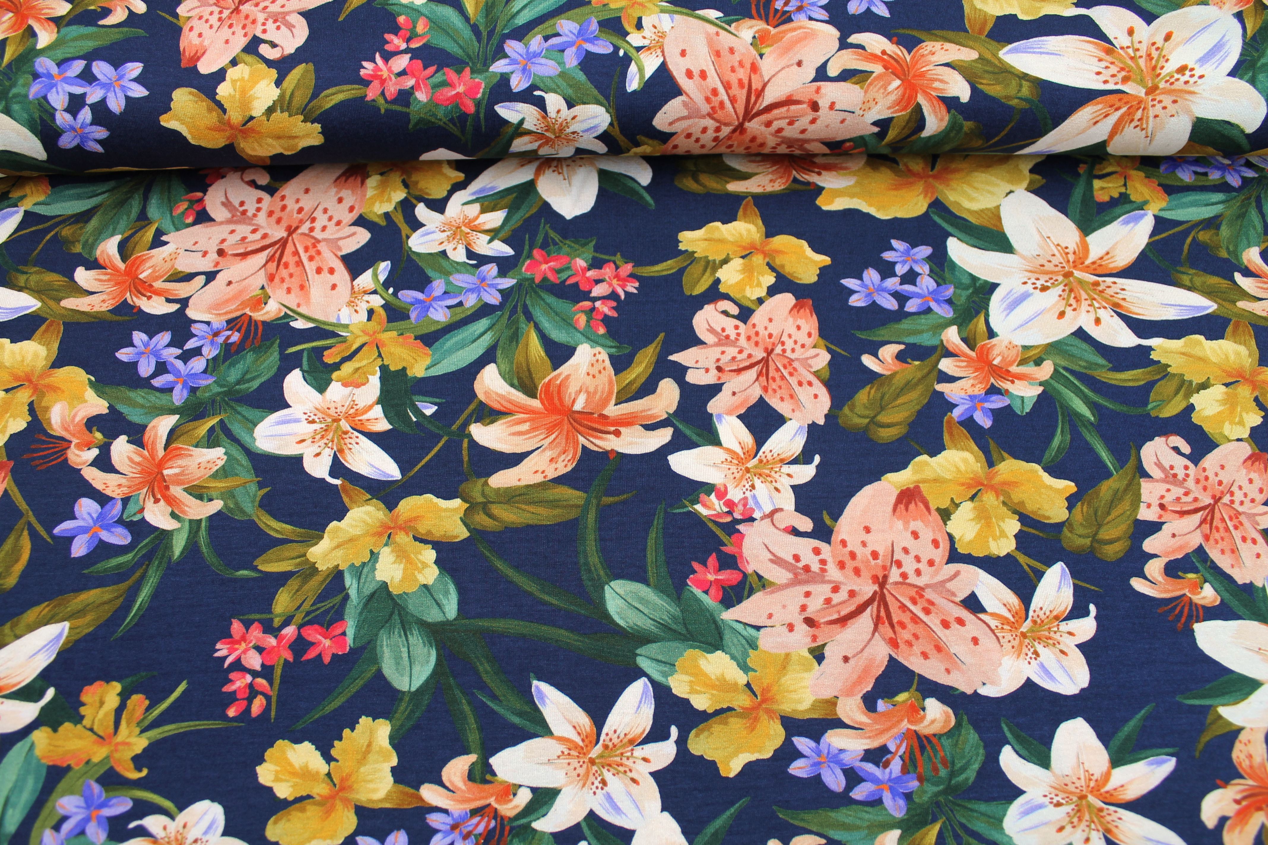 Leicht fallender Viskosejersey in blau mit Hibiskusblüten in apricot und hellen Farbtönen. Viskosejersey ist dehnbar und eignet sich perfekt für Sommerkleider, Maxikleider, Shirts mit Wasserfallausschnitt oder Fledermausärmeln.