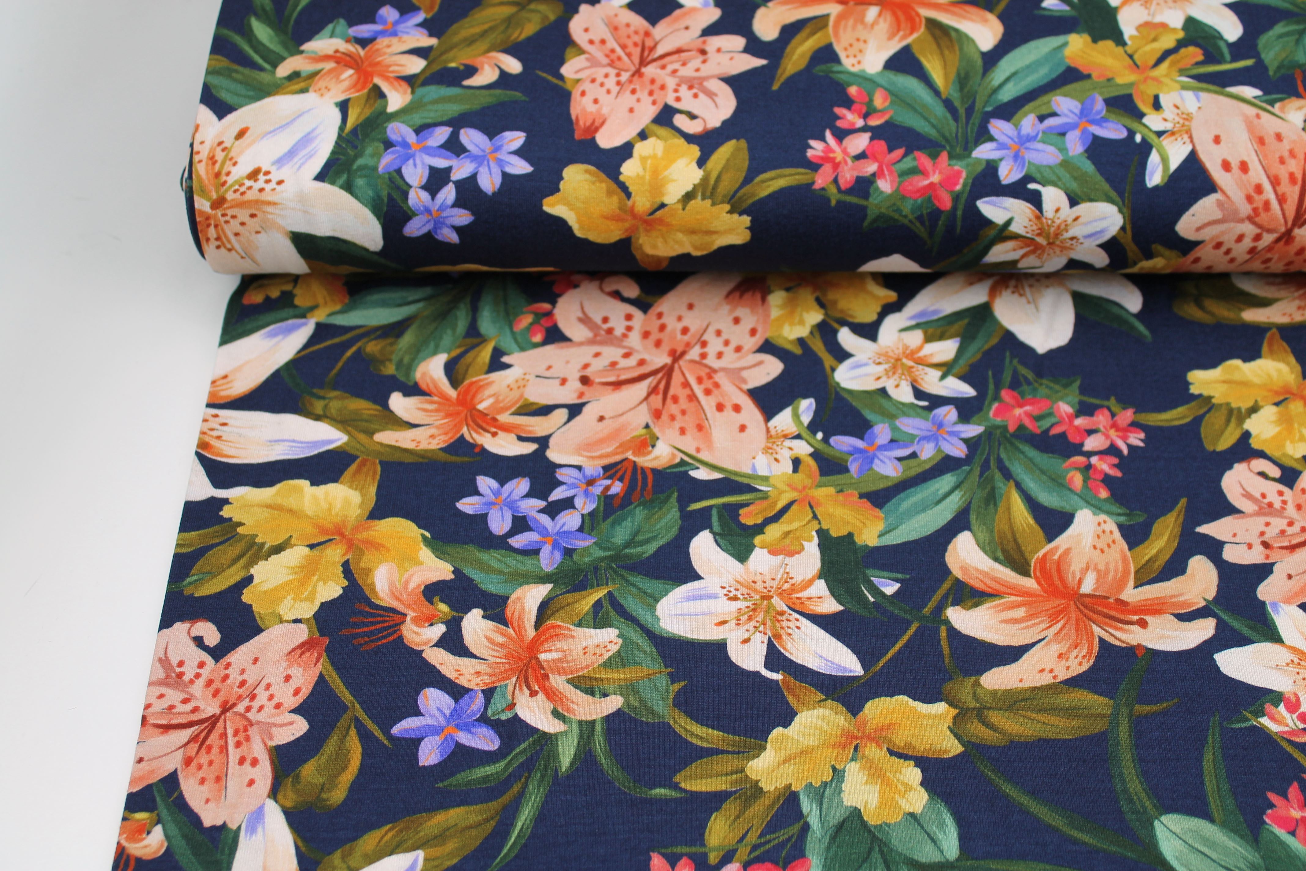 Startseite » Stoffe » Jersey » Jersey - Viskose » Viskosejersey - Muster » Viskosejersey "Hibiskus" blau