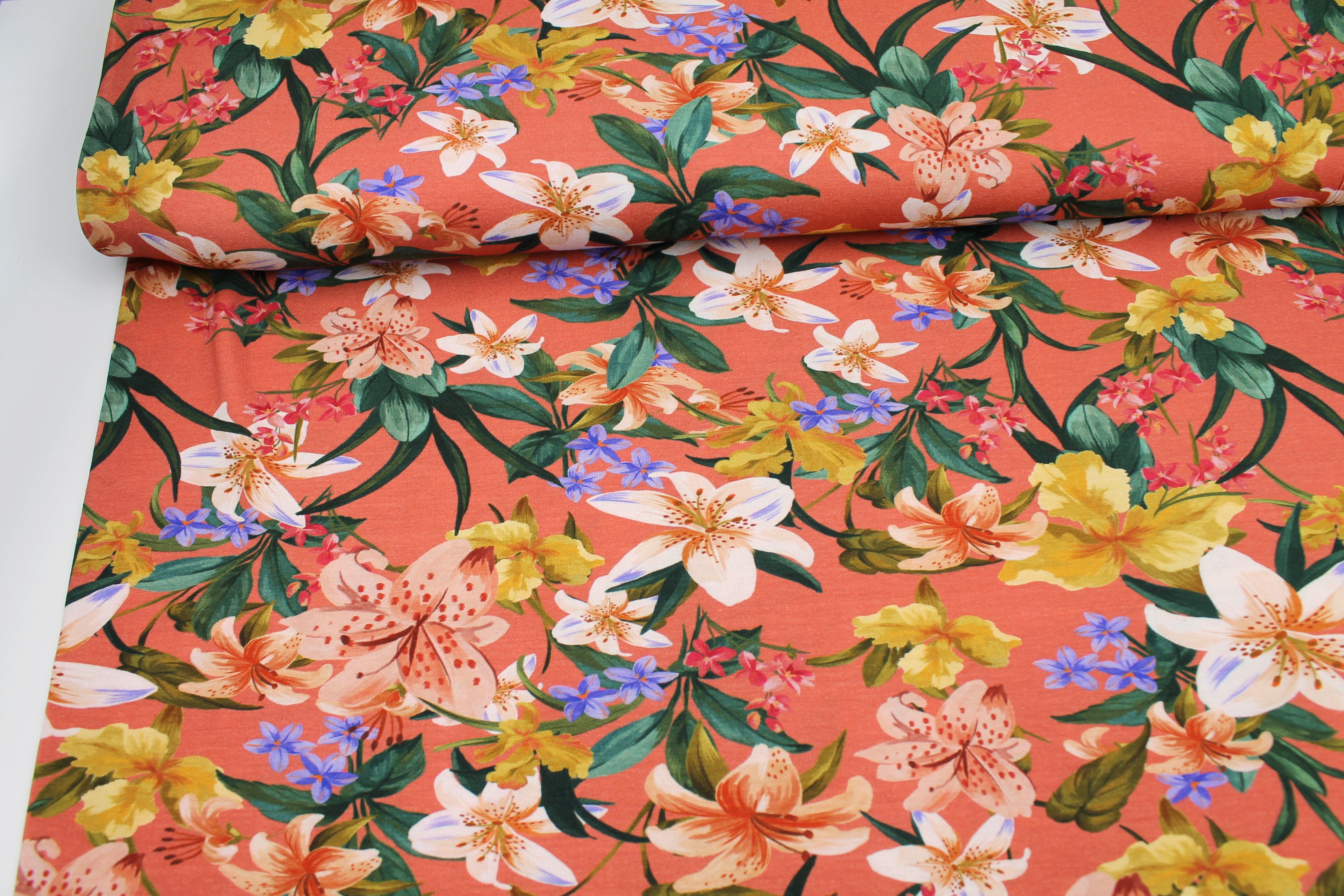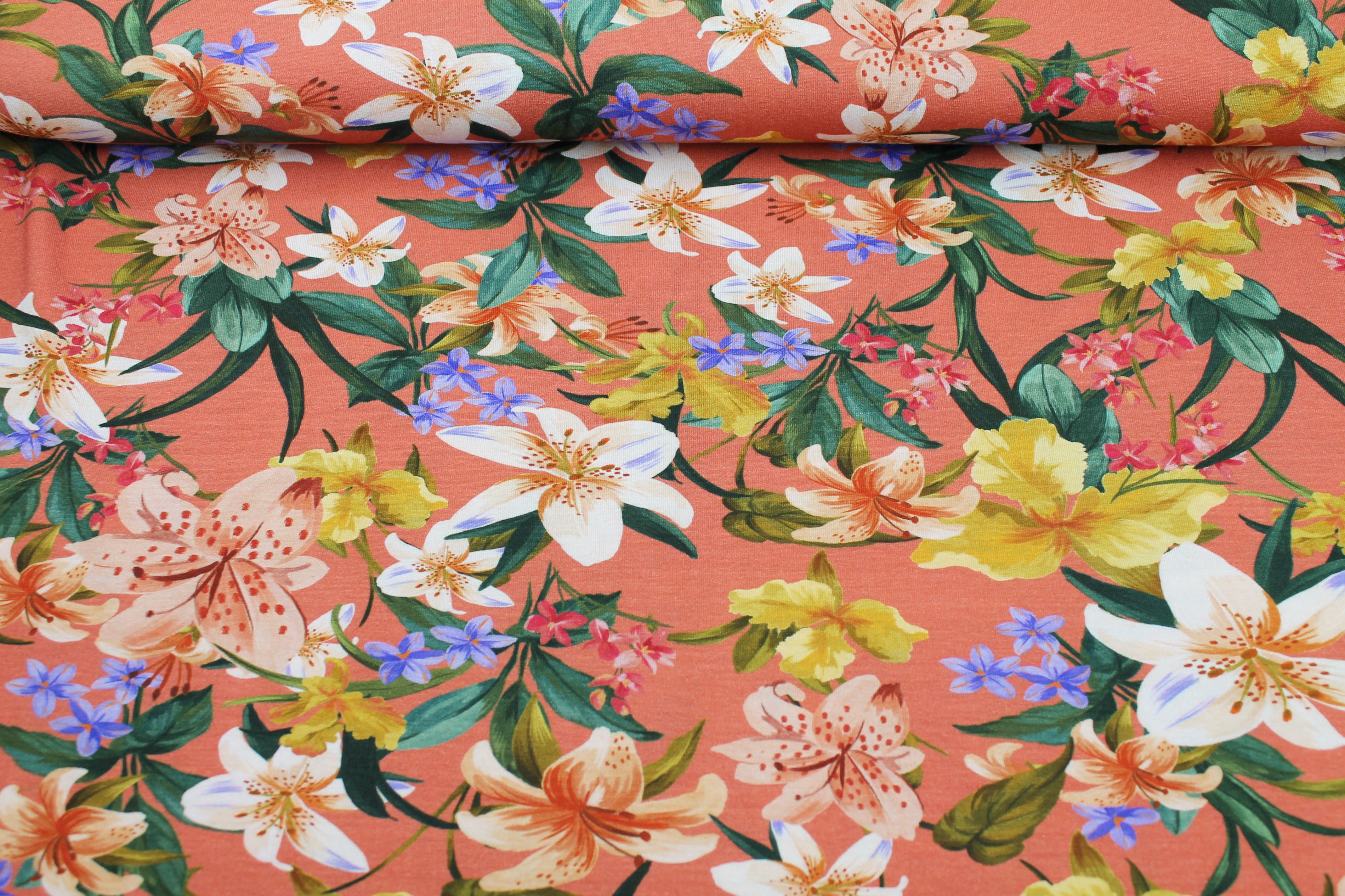 Startseite » Stoffe » Jersey » Jersey - Viskose » Viskosejersey - Muster » Viskosejersey "Hibiskus" koralle